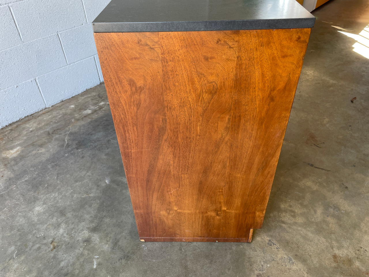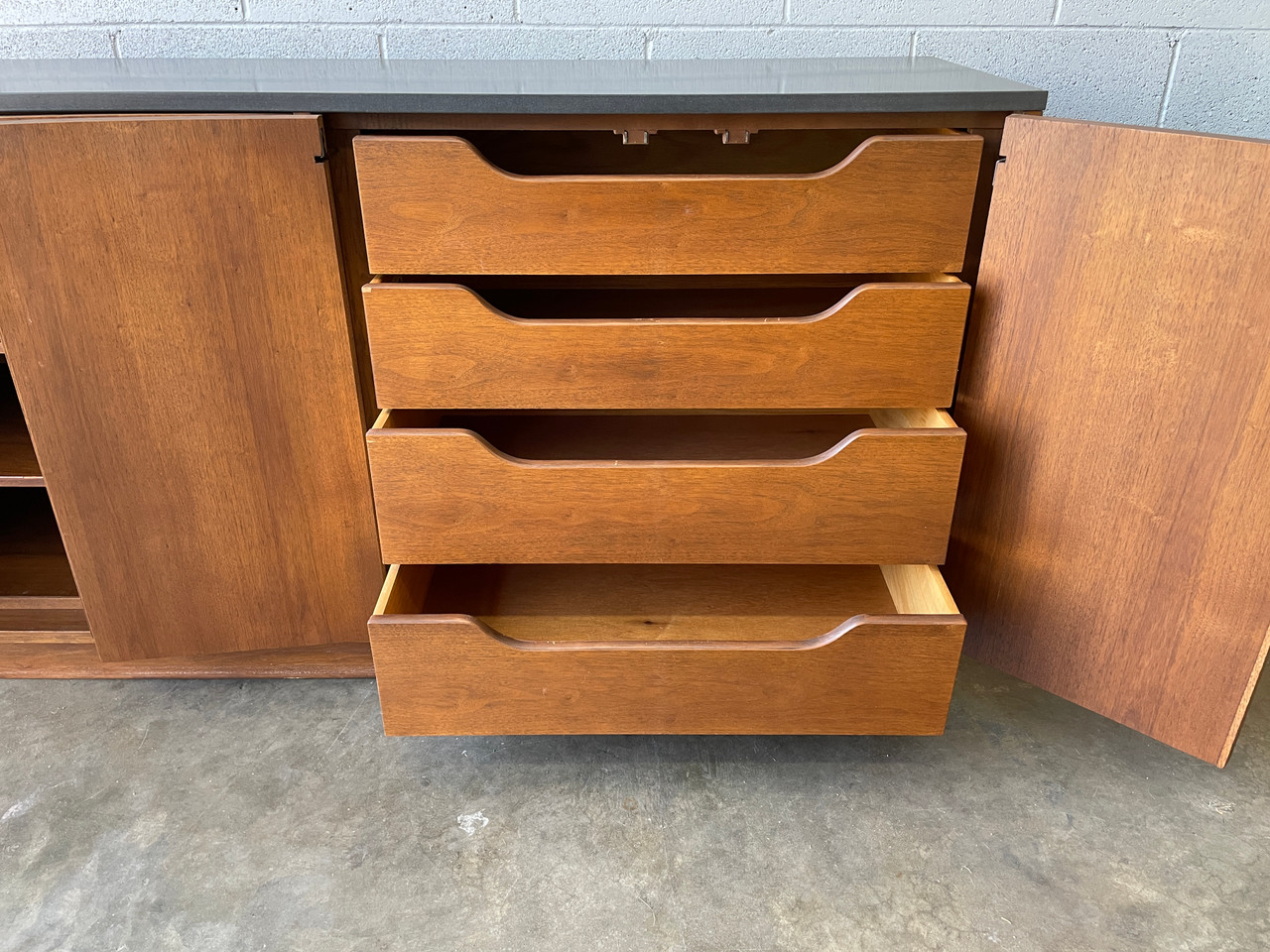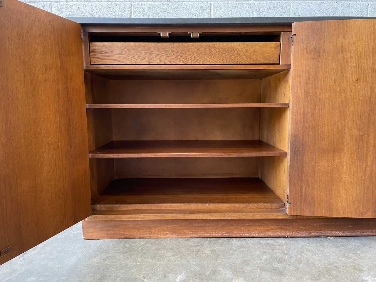 1970s Broyhill "Sculptra" buffet. Walnut with black granite top. Ample storage with shelving & a removable tray on the left side. Sliding drawers on the right side. Simple, geometric patterns on doors. Matching Dining Tables & chairs are also available.