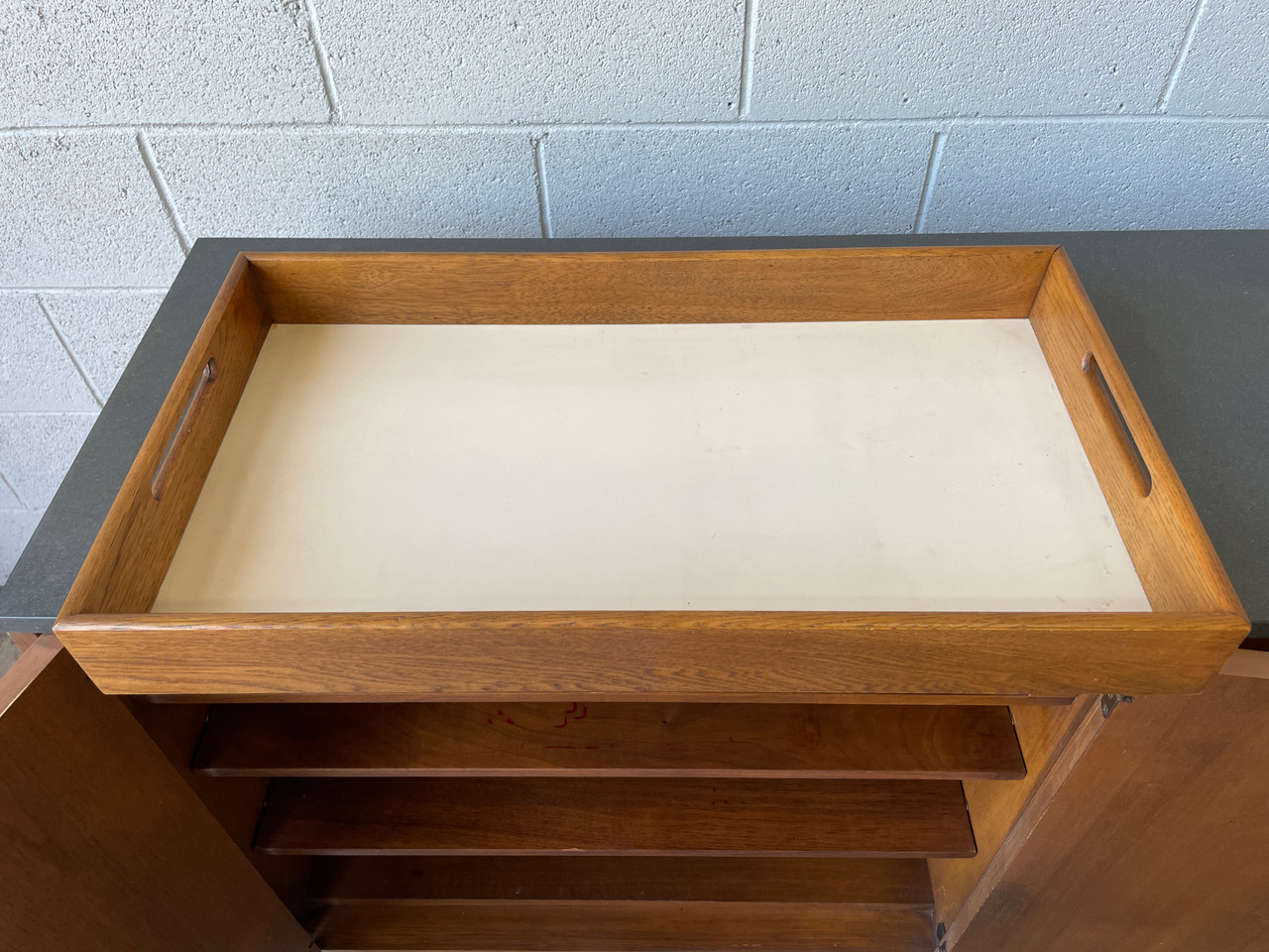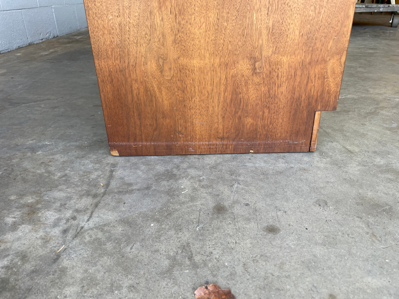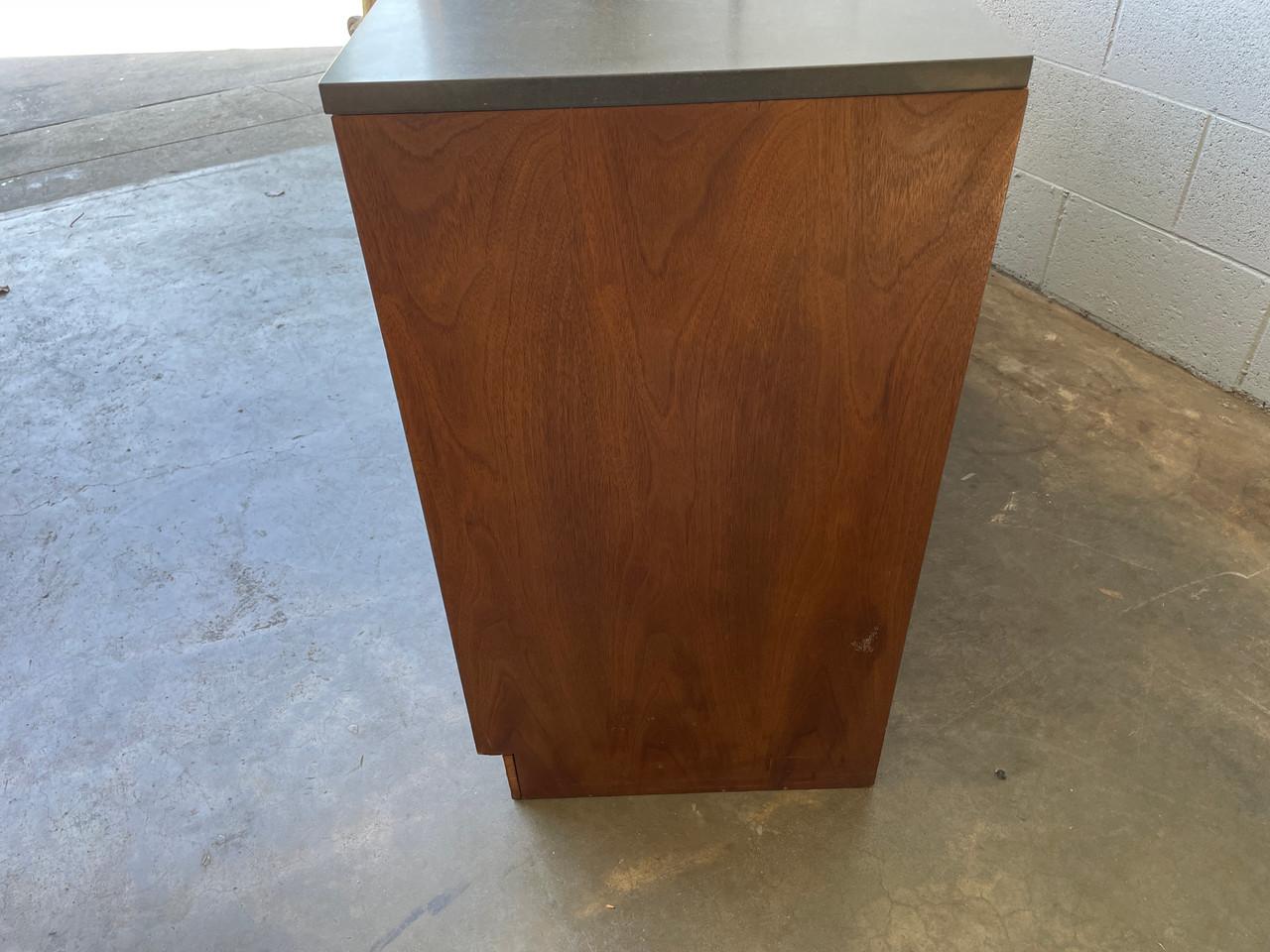 1970s Broyhill "Sculptra" buffet. Walnut with black granite top. Ample storage with shelving & a removable tray on the left side. Sliding drawers on the right side. Simple, geometric patterns on doors. Matching Dining Tables & chairs are also available.