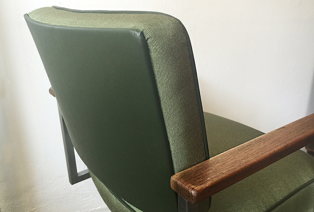 Comfortable wood armed steno chair from General Fireproofing. Chrome frame and base with new Knoll "Chroma" olive upholstery and green vinyl seat back. Height adjustment & tilt features.