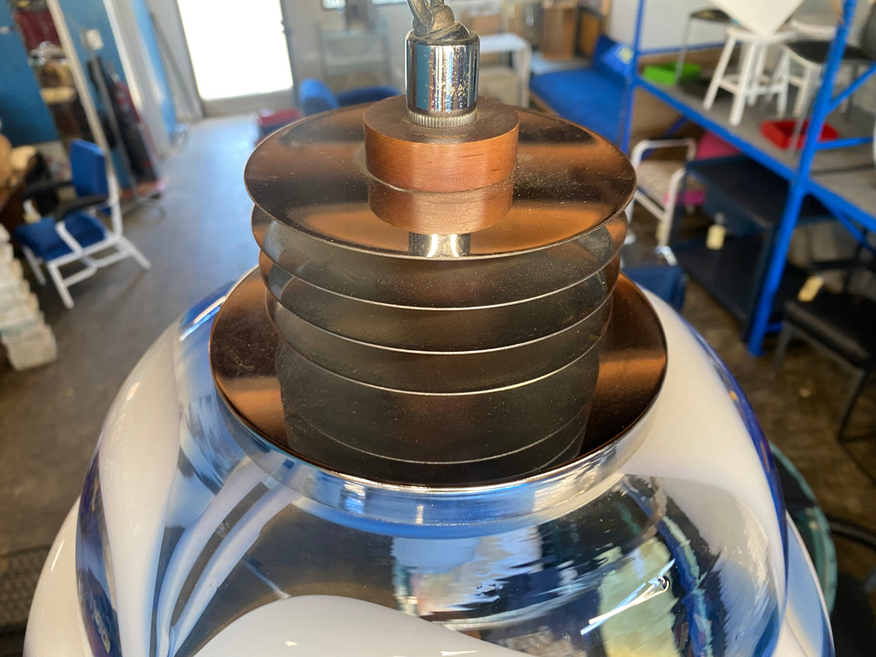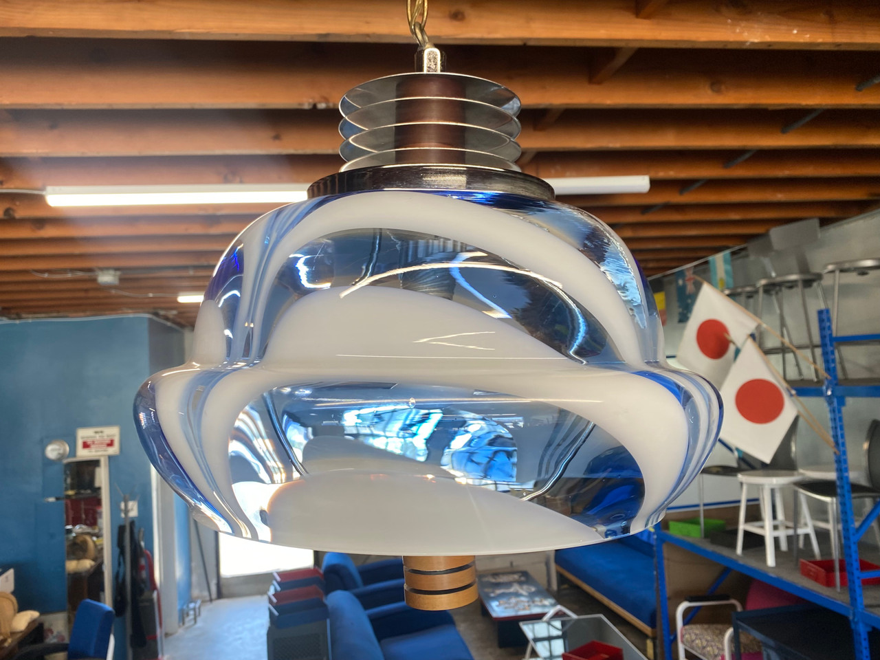 1970 italian pendant lamp made of blue and white Murano glass. Adjustable length. From the well known Mazzega historic glassware company based in Murano, Italy. High-quality glass products using traditional techniques.