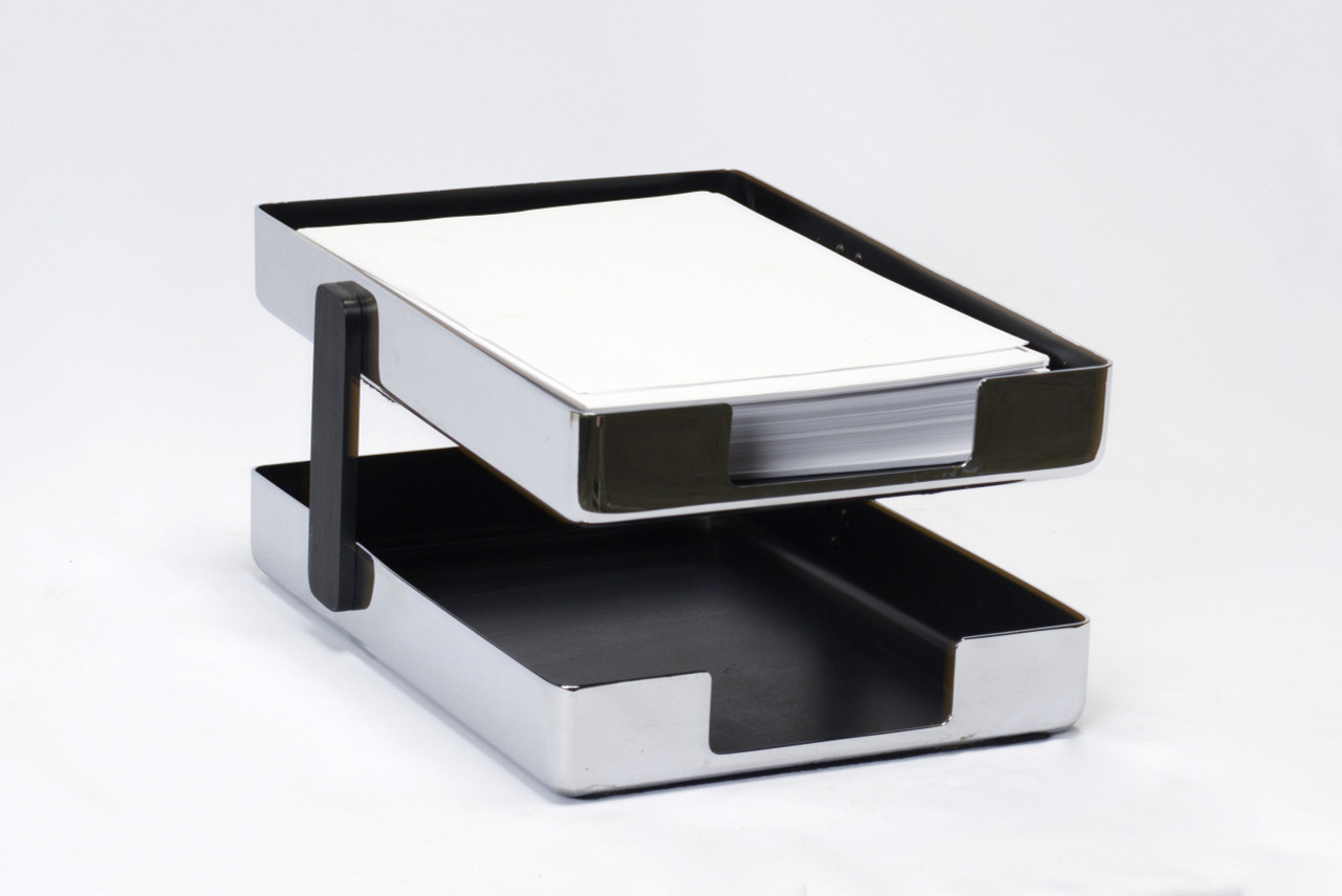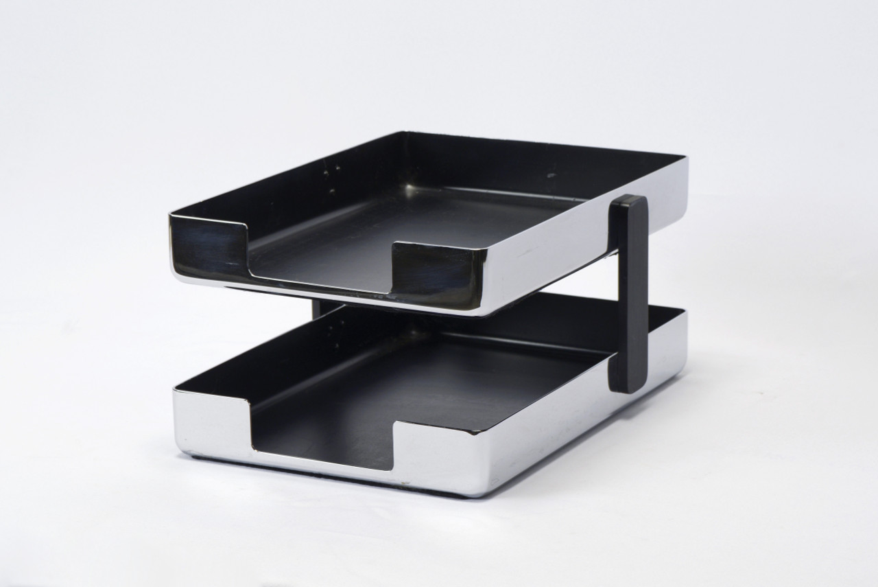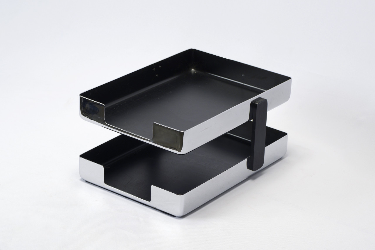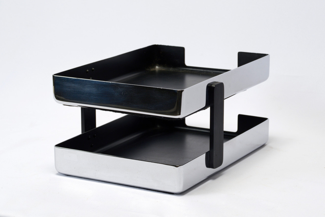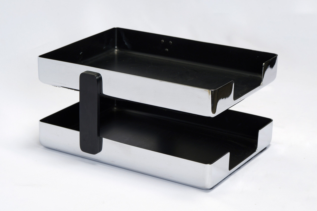 1970s modern desk tray designed by Metcor Los Angeles. Featuring two-tiers and a shiny chrome finish to keep your in-and-out papers organized and looking good. Uncommon find!