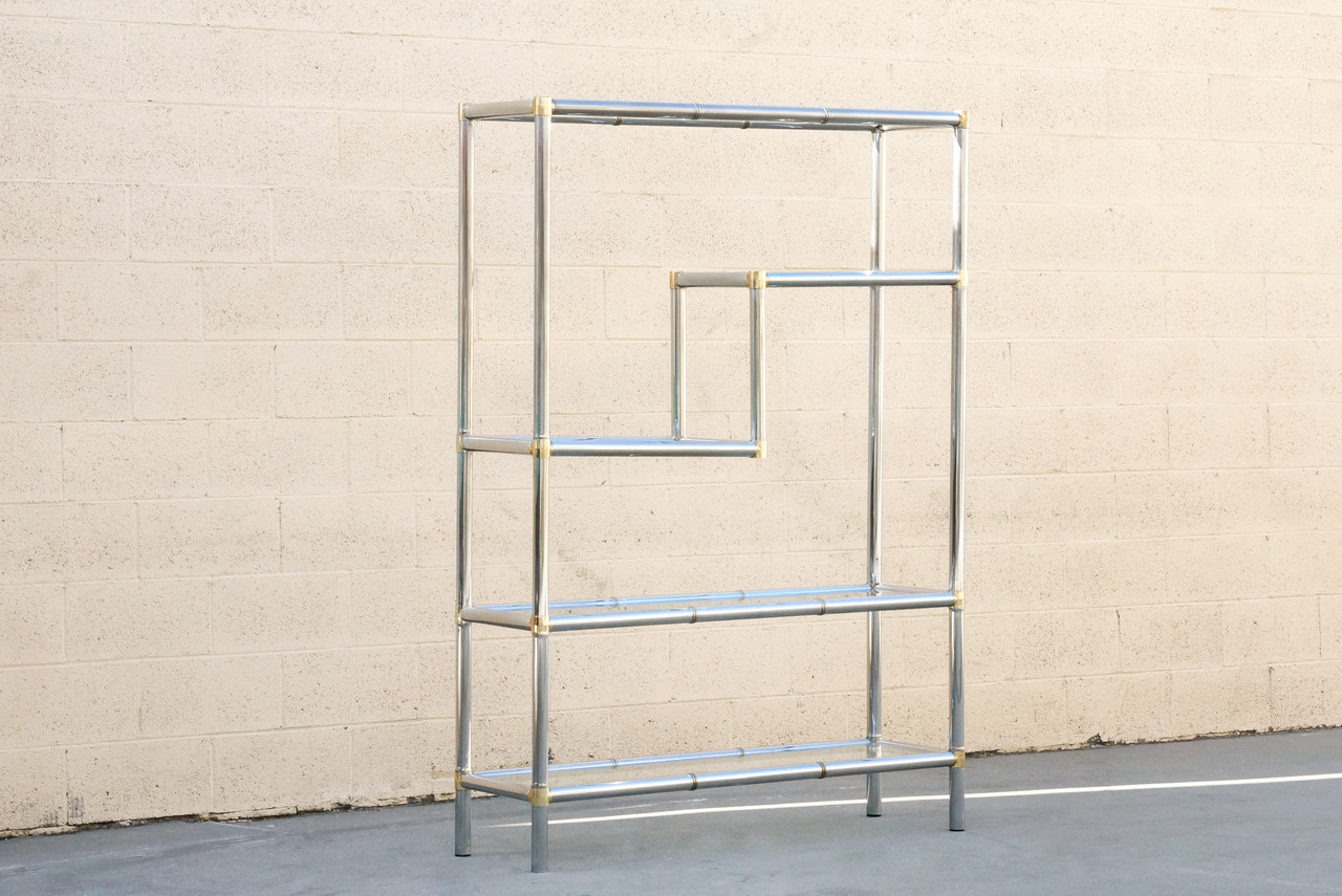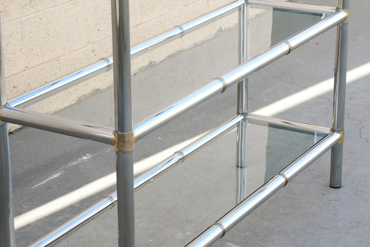 Iconic 1970s chrome etagere with five glass shelves. Chrome piping designed as a modern take on bamboo. Brass plated connectors show gentle wear as pictured. A sophisticated, statuesque piece ideal in an office or living room. Please note, one shelf has a minor sag as pictured but is structurally sound.