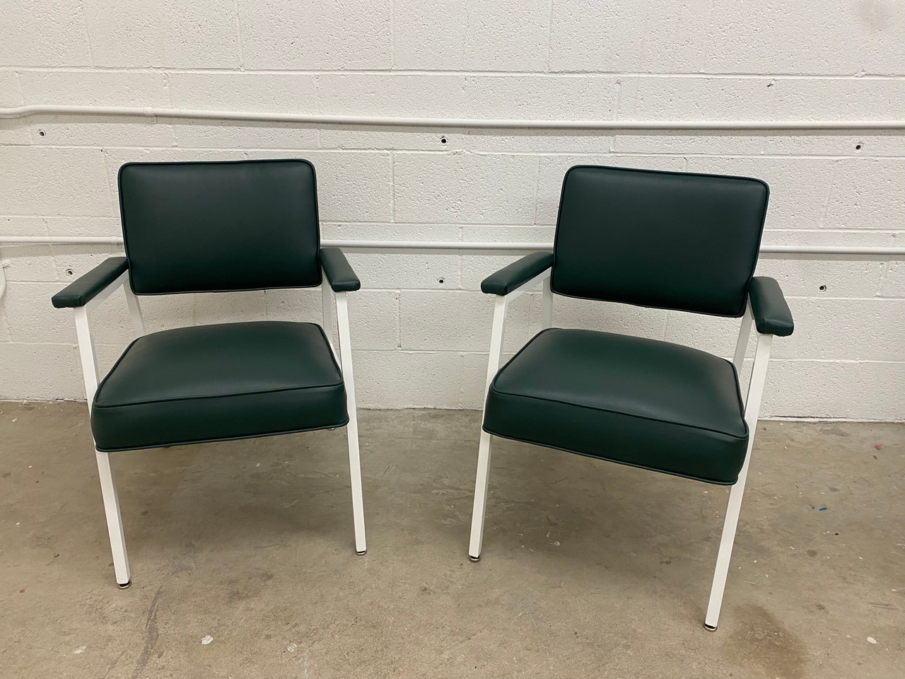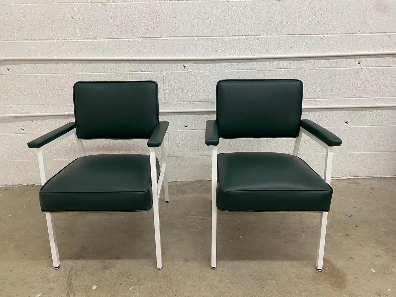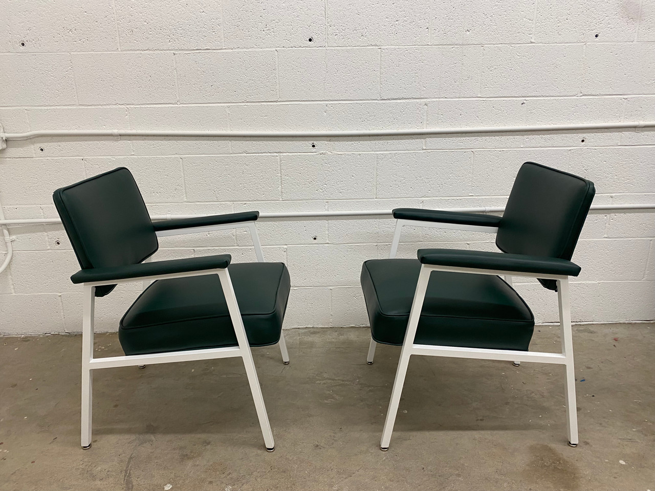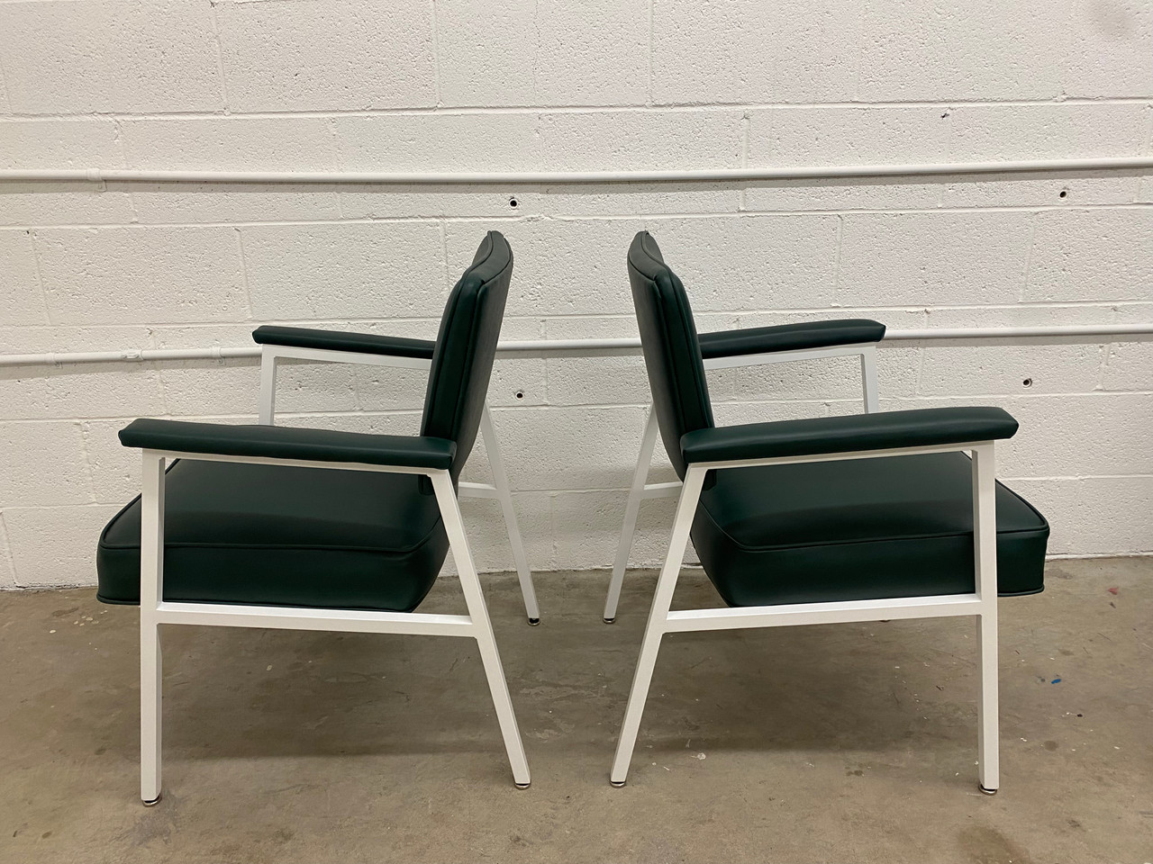 Classic sleek arm chairs from the 1970s. Built to last! Refinished in gloss white powder coat & dark green vinyl.