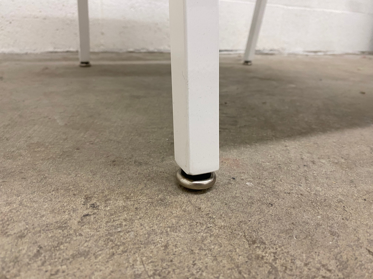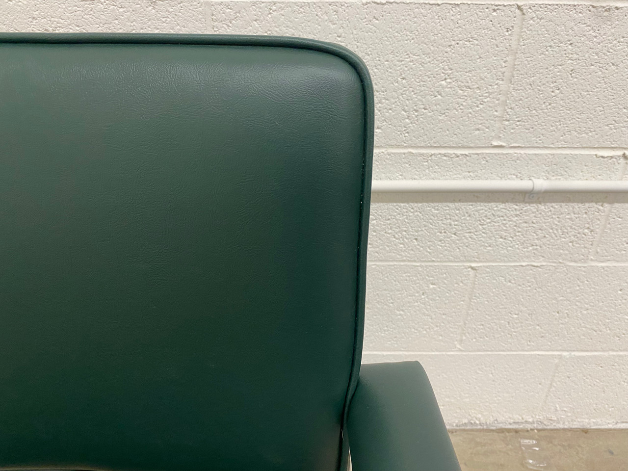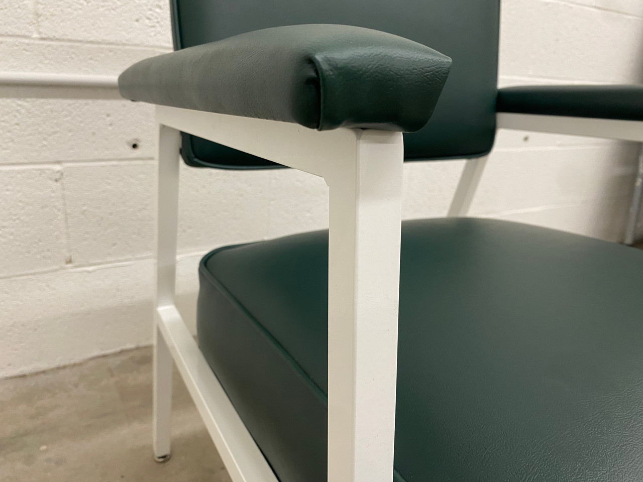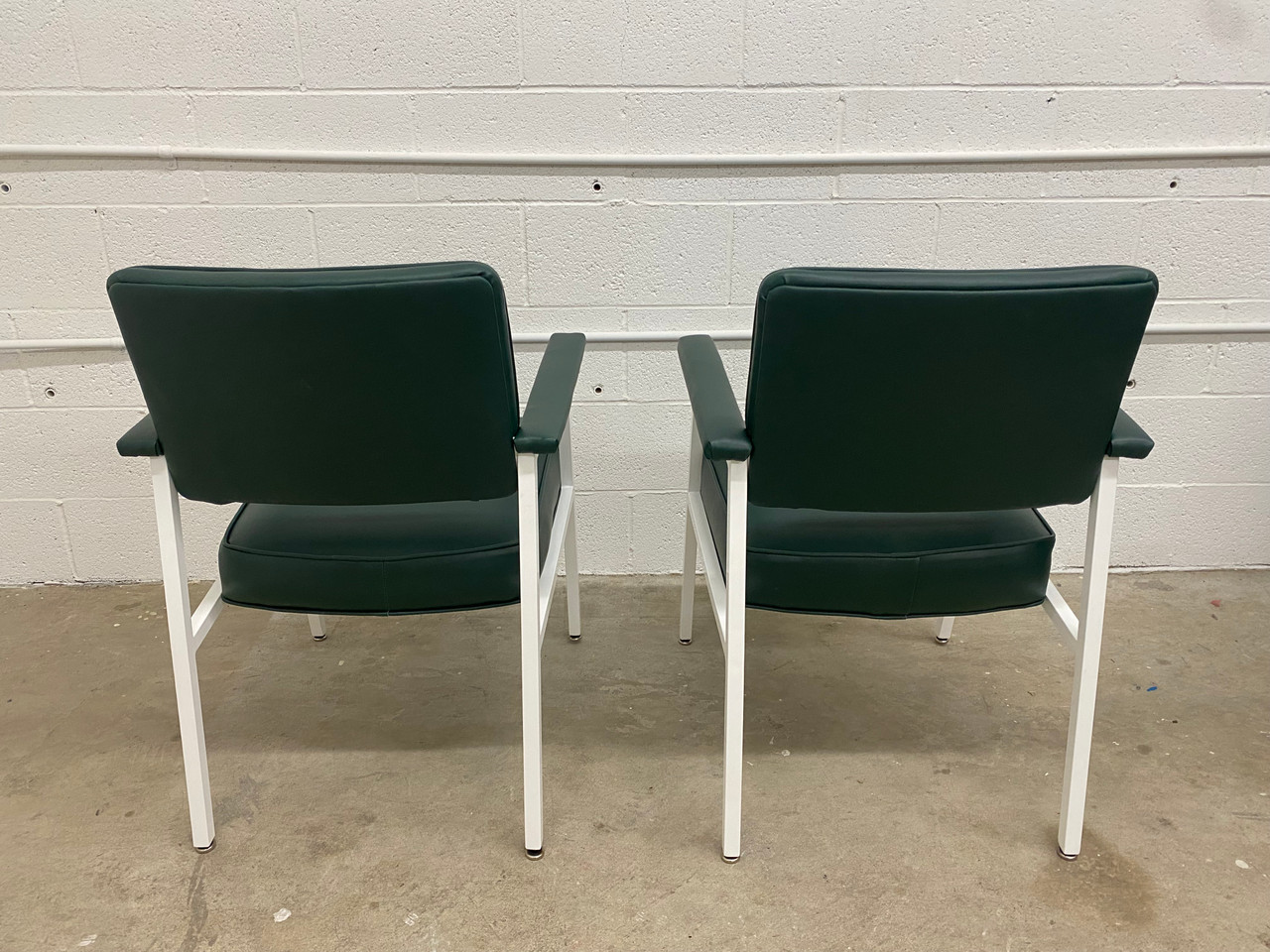 Classic sleek arm chairs from the 1970s. Built to last! Refinished in gloss white powder coat & dark green vinyl.