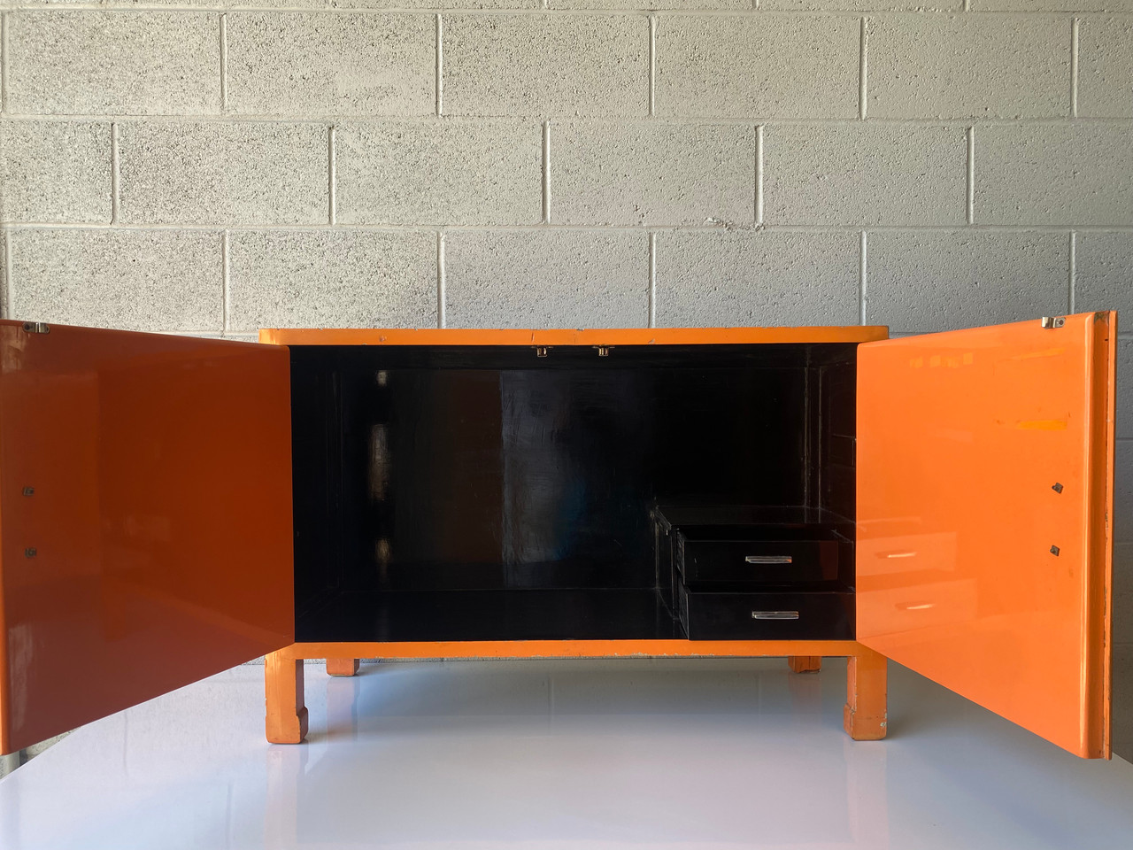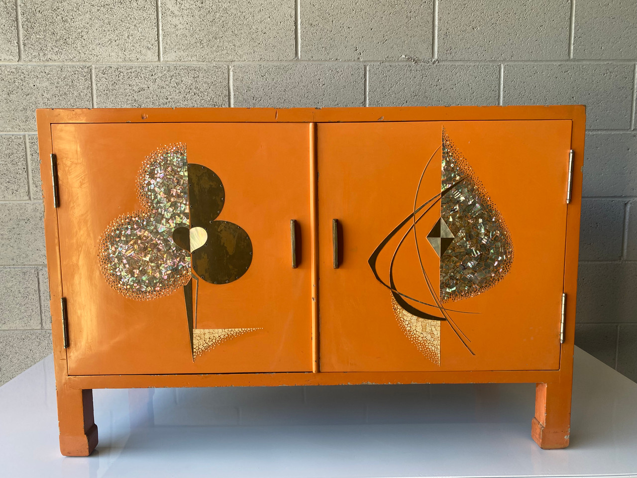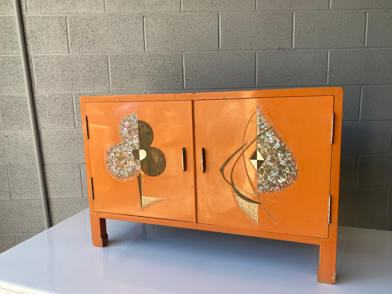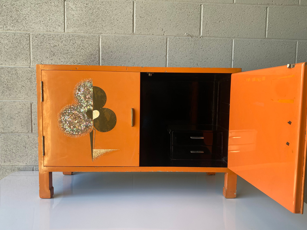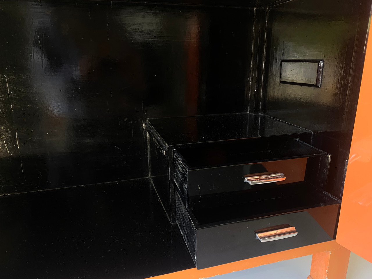Orange lacquer cabinet with groovy mosaic artwork on doors. Black lacquer finish inside with two small drawers. Hand-made in the 1980s.
