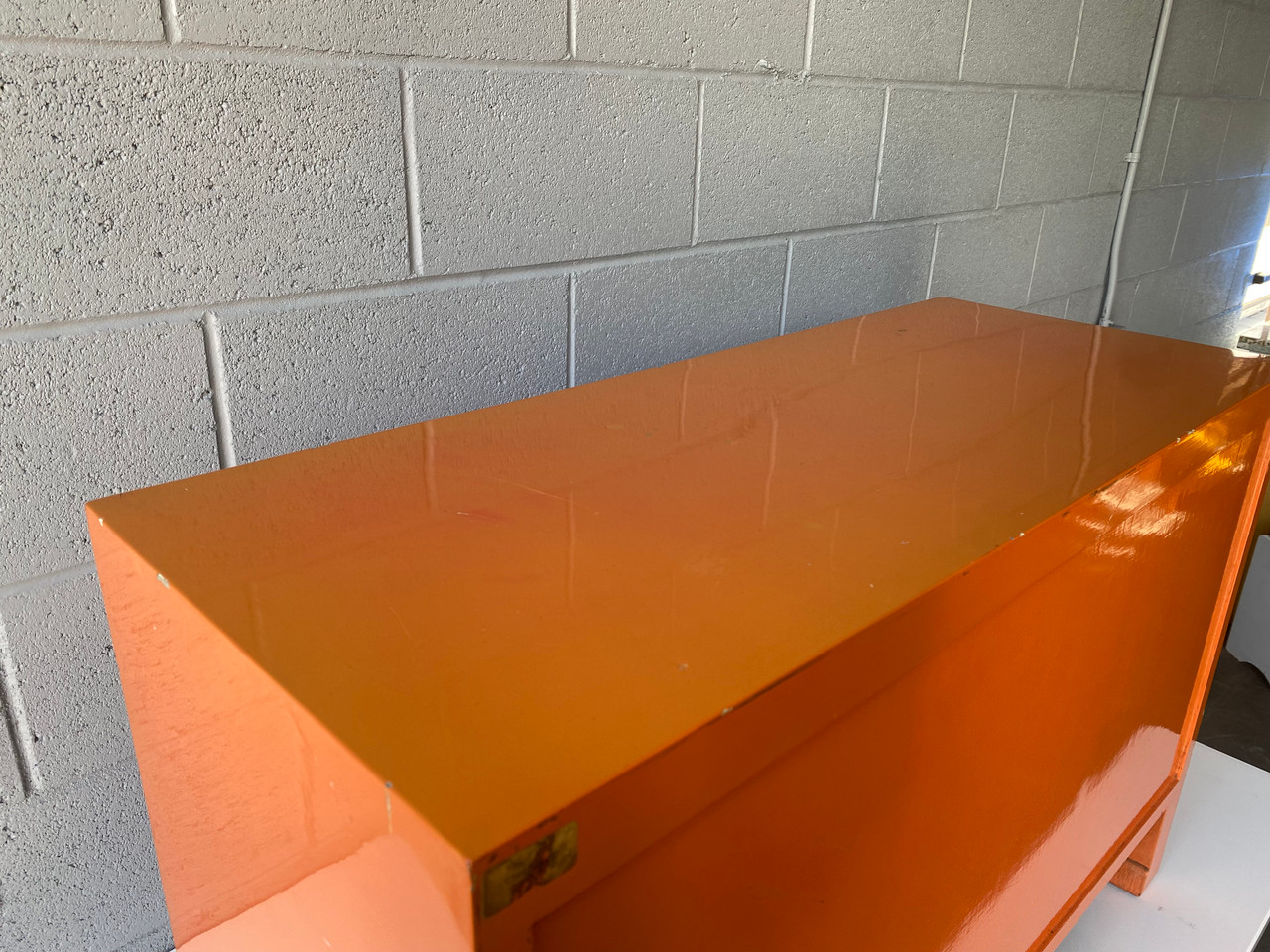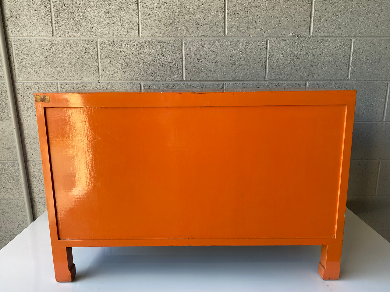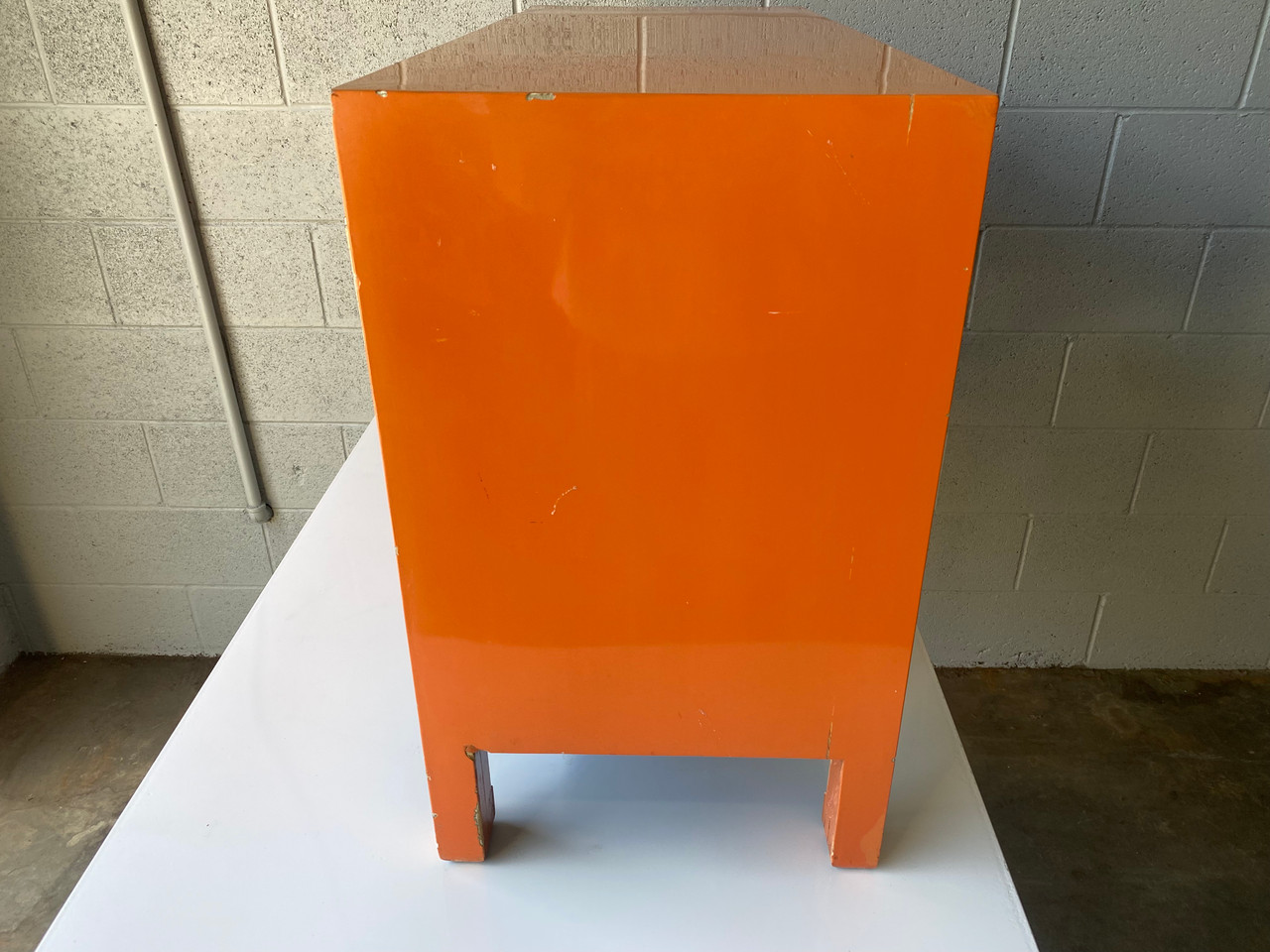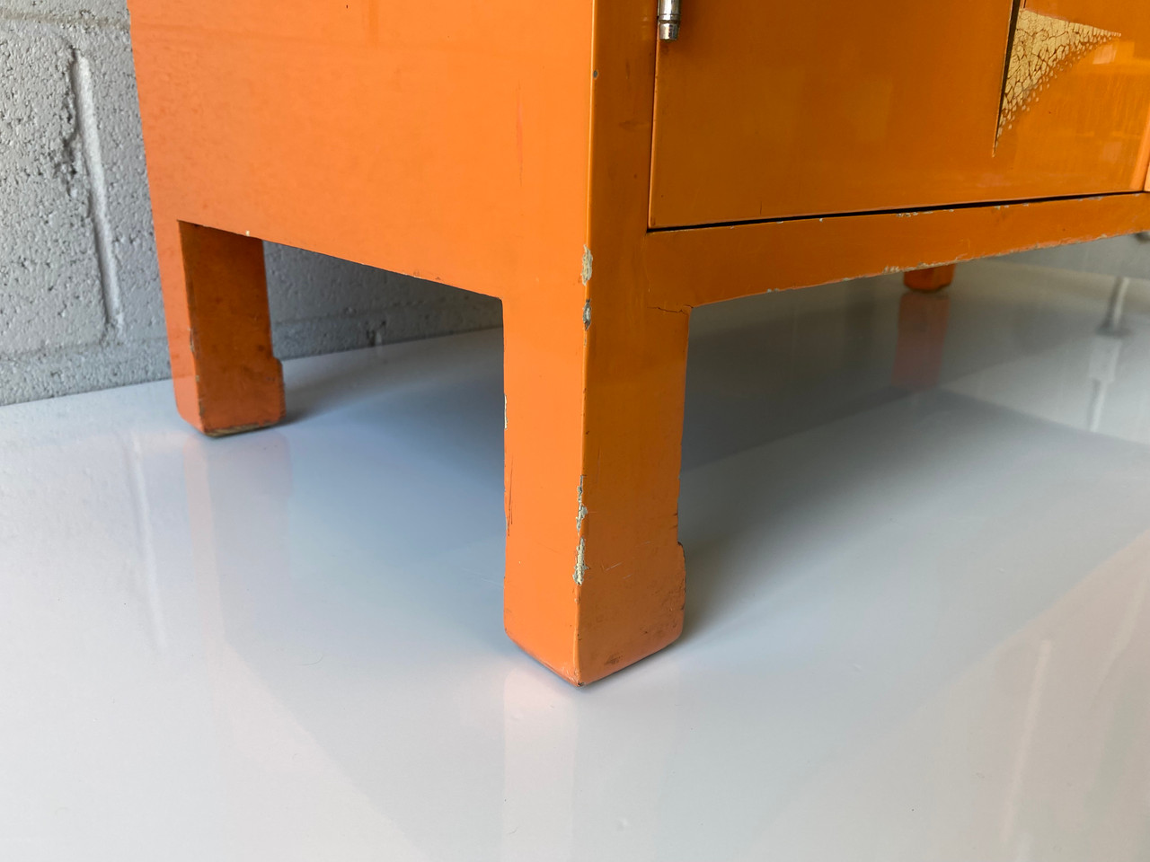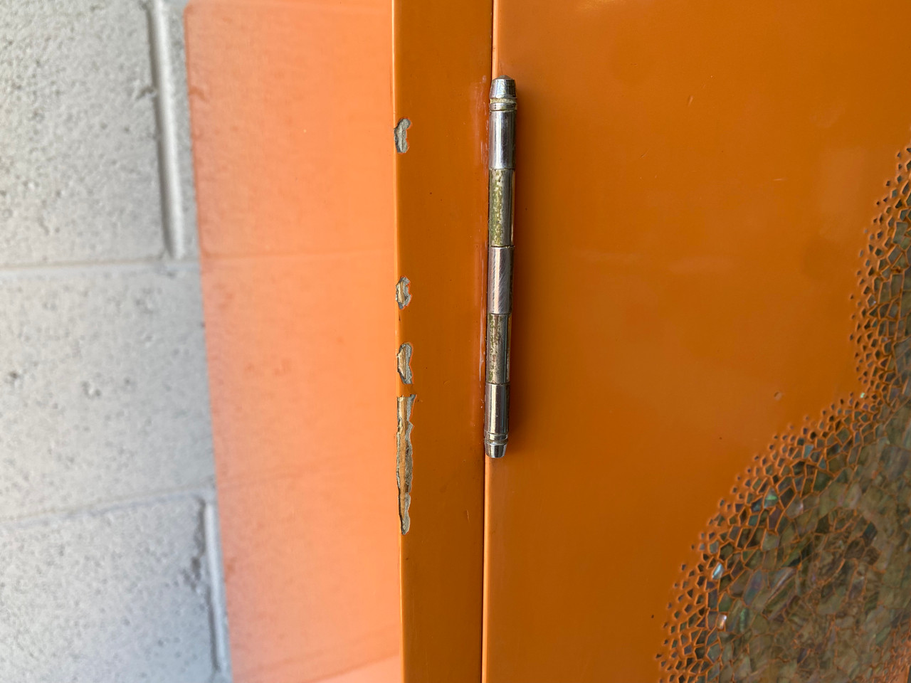 Orange lacquer cabinet with groovy mosaic artwork on doors. Black lacquer finish inside with two small drawers. Hand-made in the 1980s.