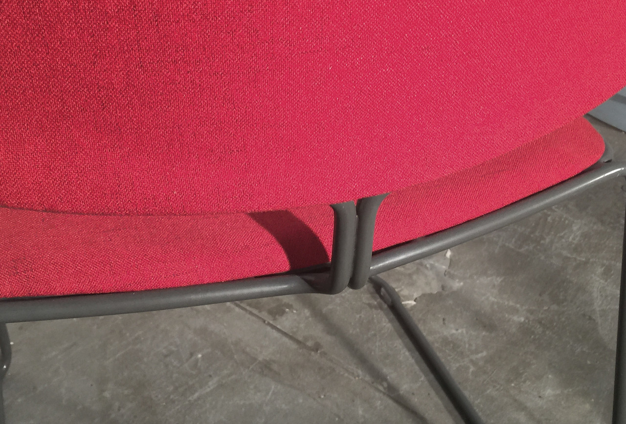 It's the 1980s minimalist Steelcase "stacking chair" newly reupholstered in high quality red mico-linen. Works beautifully in a home office, lobby or conference room alike. In great vintage condition. 1 available.