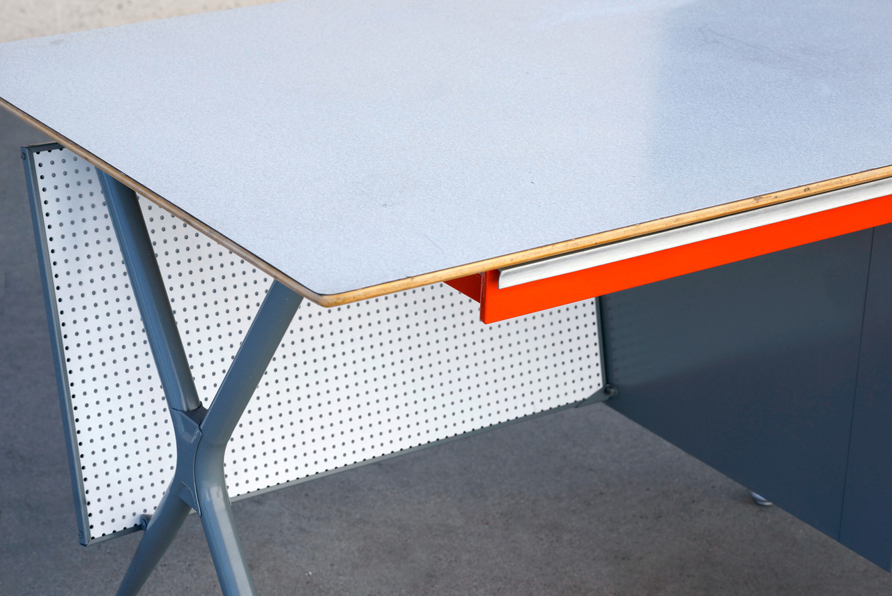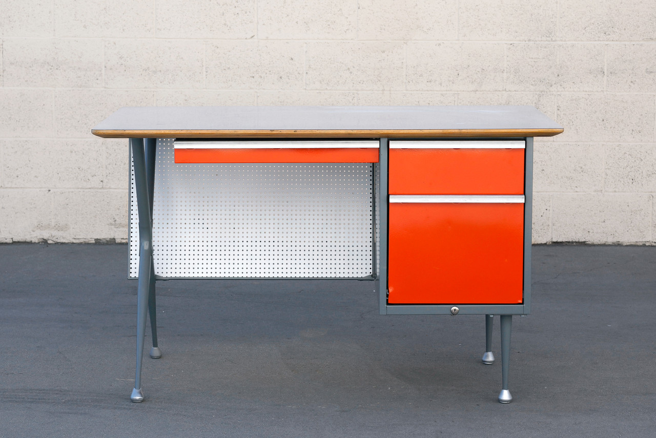 Fantastic 1950s desk by celebrated industrial designer Raymond Loewy desk for Chicago manufacturer Brunswick. We restored this beauty with powder coated light gray frame and orange drawers. Features unique pegboard modesty panel, aluminum trim and rubber foot caps. Original Formica top – good condition. Please note some light scratches and marks. Damage on side/back corner of cabinet as pictures.
