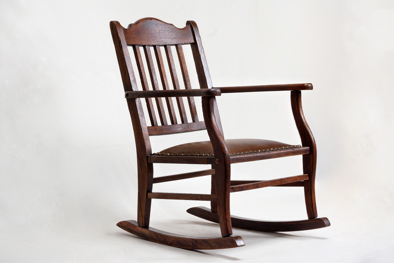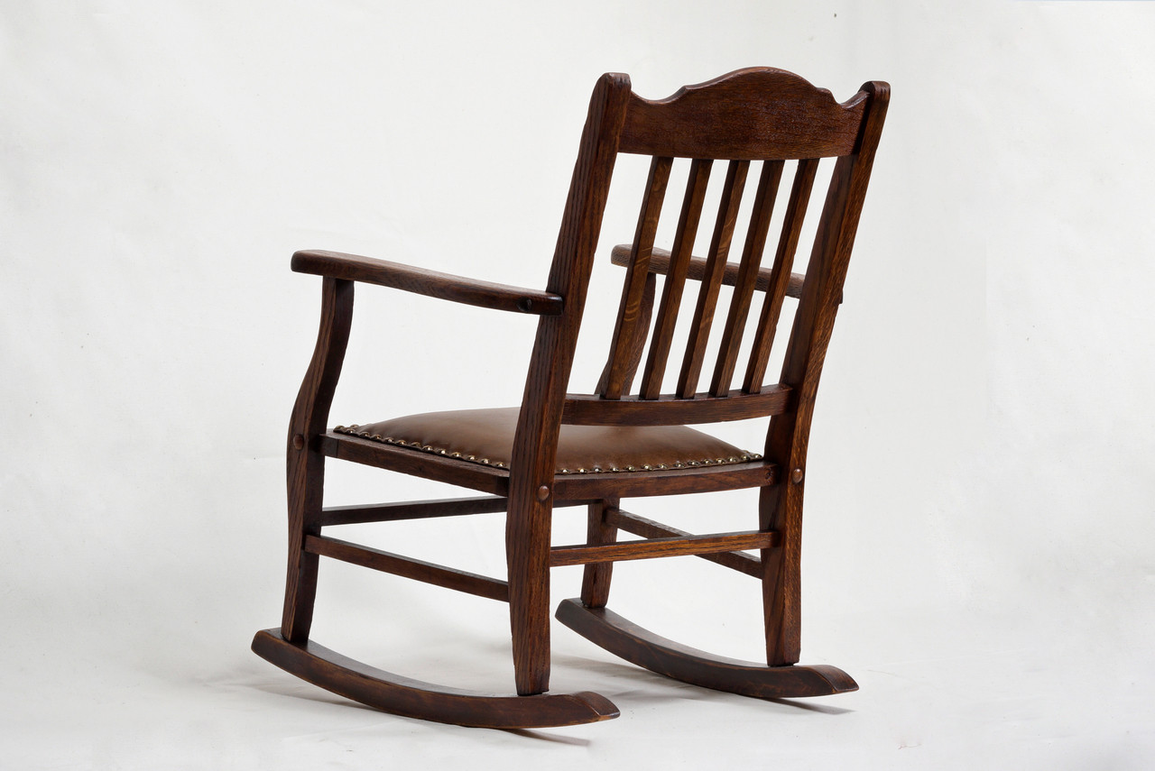 American Craftsman child size rocking chair. Reconditioned oak frame. New leather seat with hammered brass upholstery tacks. Your little one will be sitting in classic Americana comfort and style.