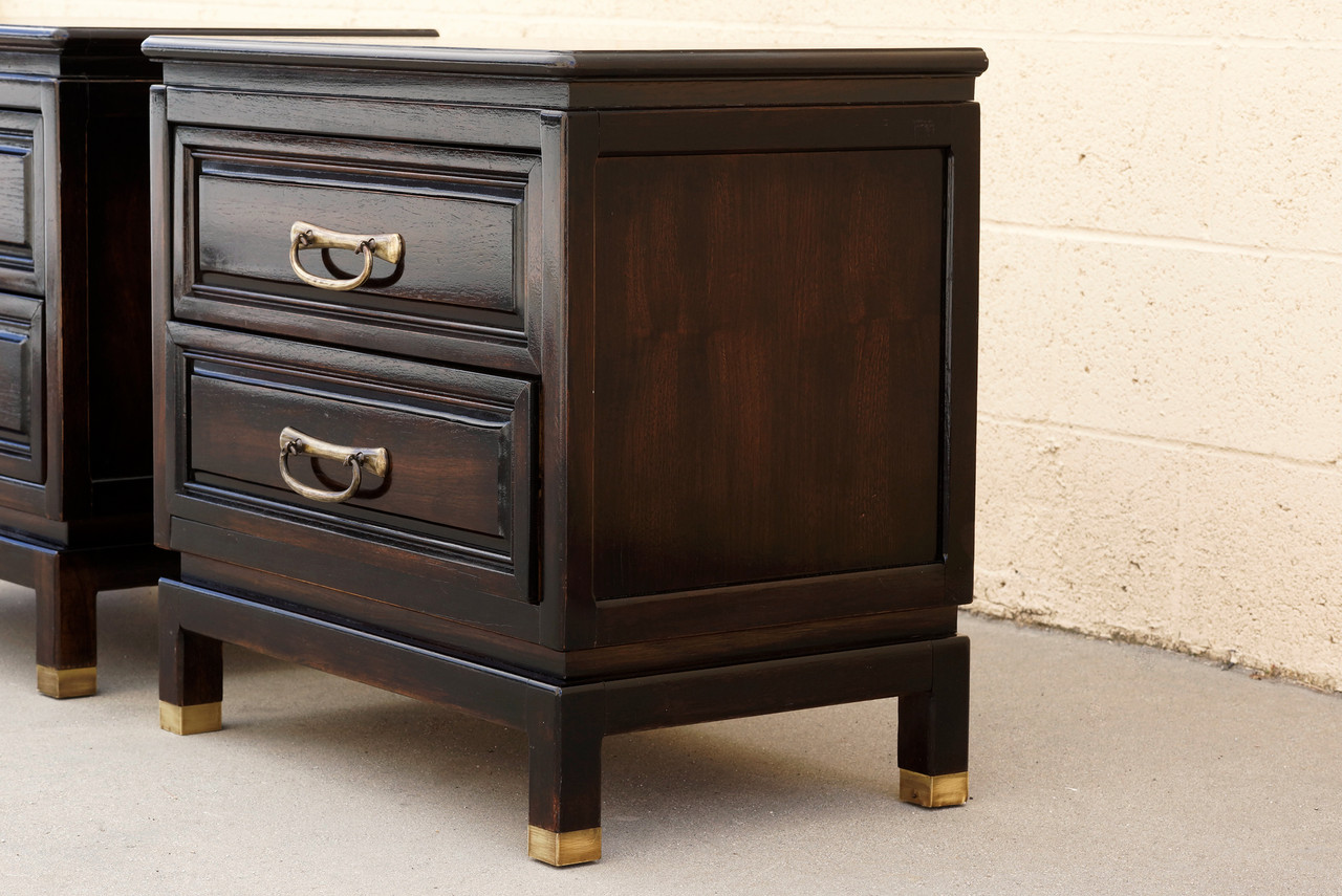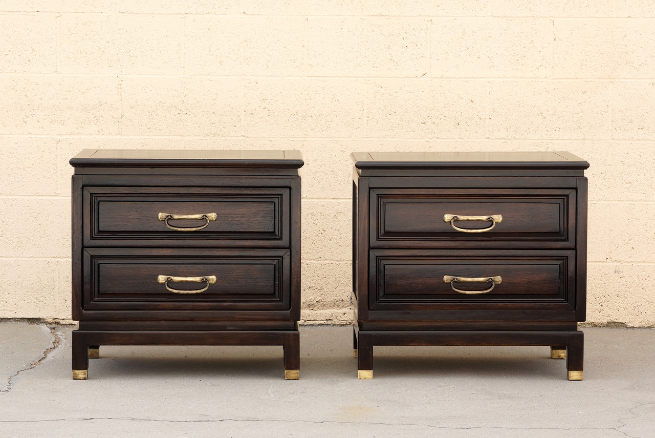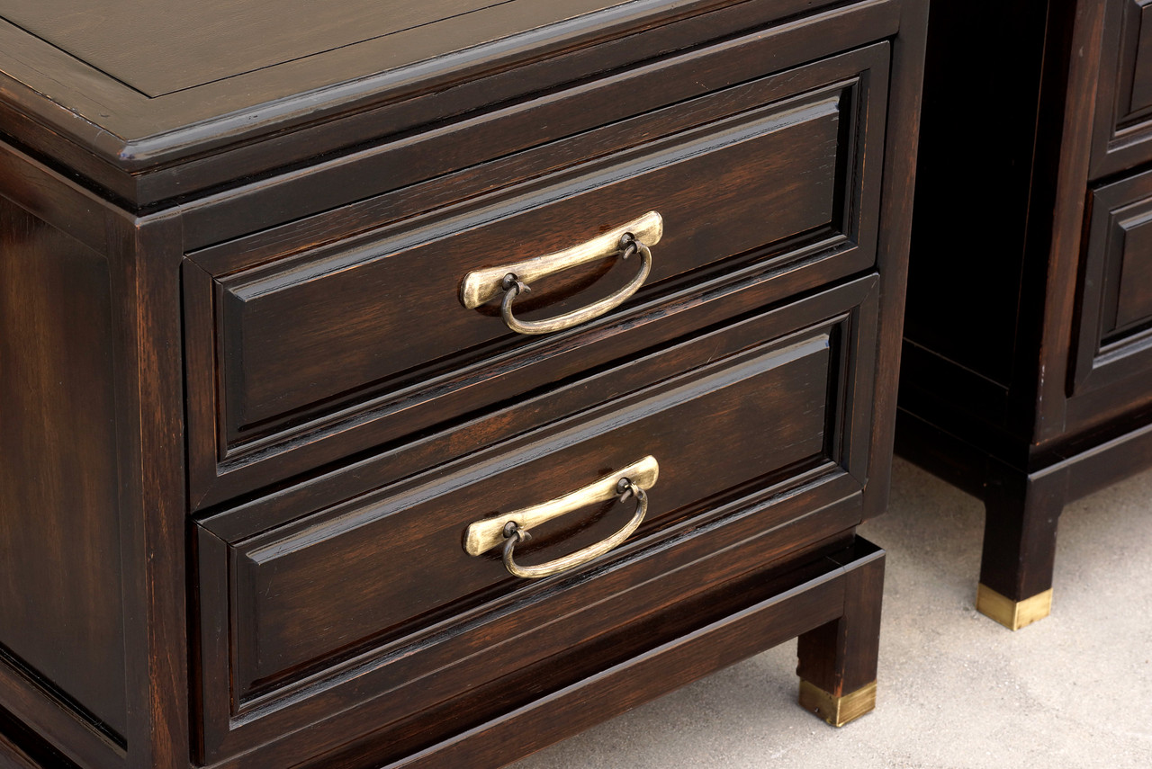 Wonderful pair of 1960s nightstands by American of Martinsville. Refinished rosewood with rich ebony patina. Antique brass hardware, polished to a shine. Take these beauties home tonight!