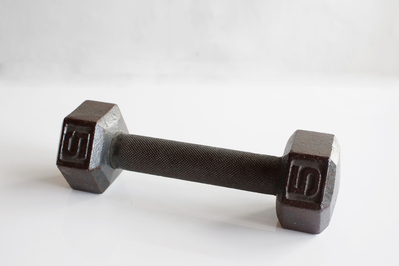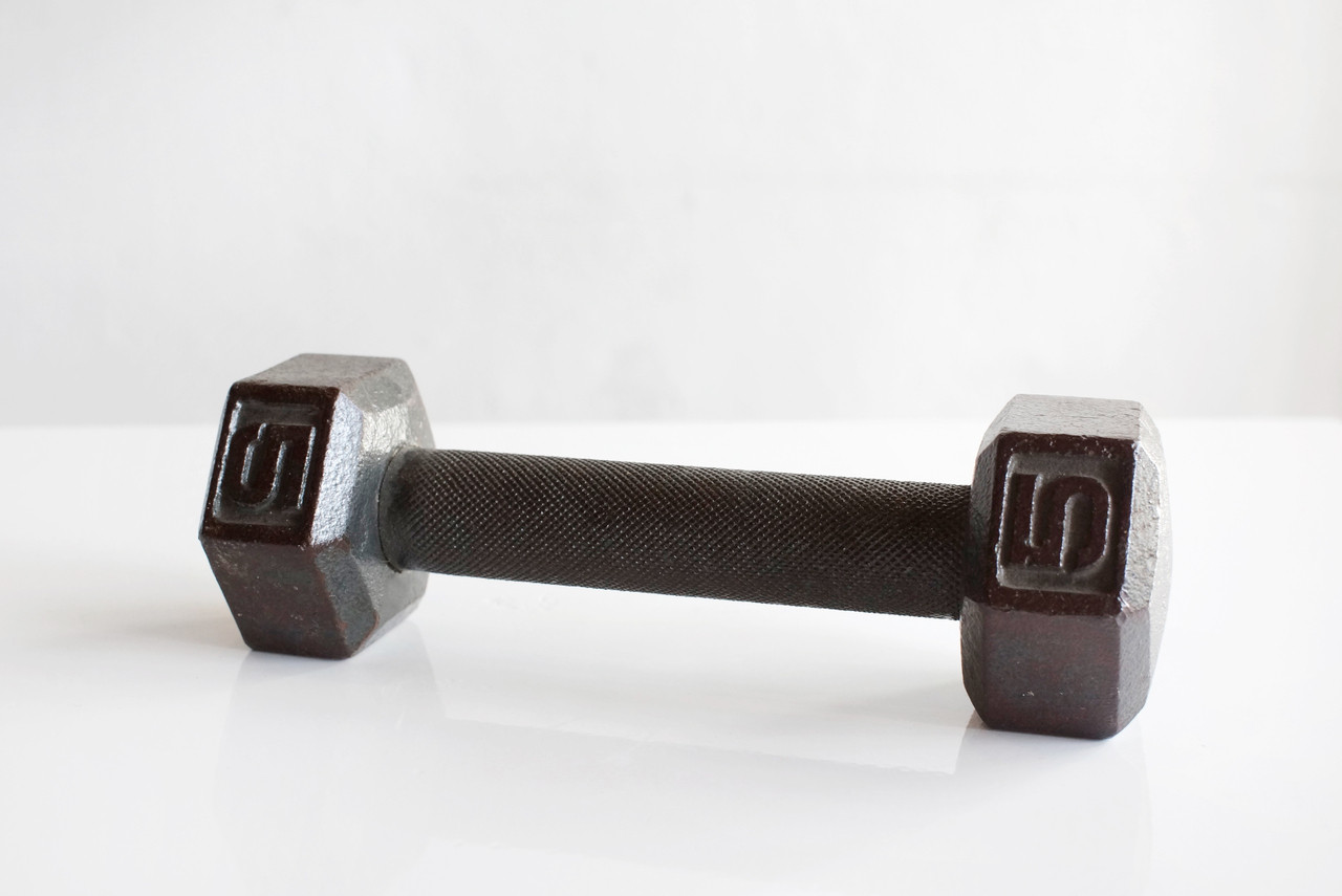 Unique cast iron dumbbell, c. 1920s. Heavy duty and in excellent condition with a beautiful antique patina. Weighs in at a solid 5 LBS. Awesome as a paper weight, bookshelf curio or gym accessory. A genuine piece of antique sporting equipment!