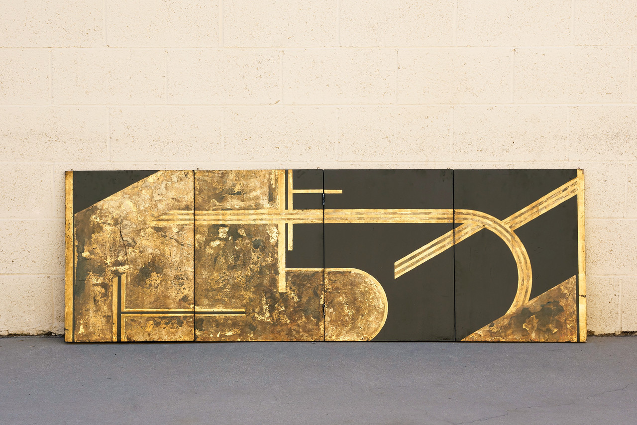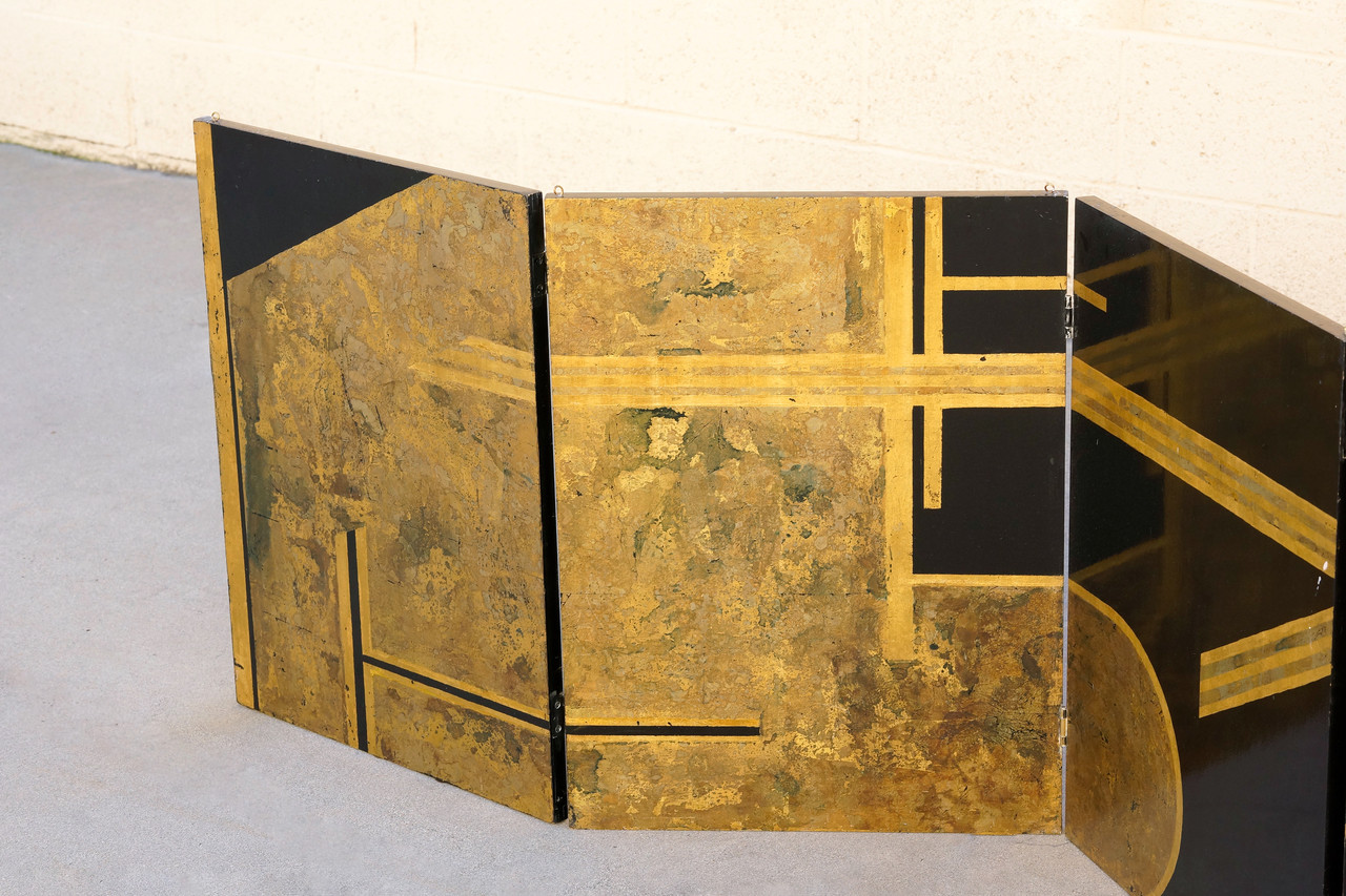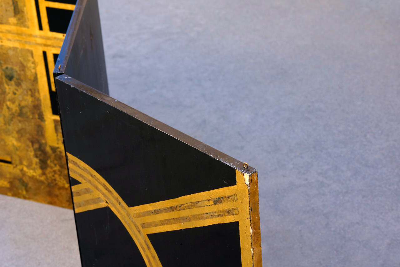Original art deco era folding screen composed of gold leaf and black lacquer on wood panels. Four hinged panels in total comprise this 6ft piece. While it is constructed with hooks to be mounted from the ceiling, it can be utilized in a number of different ways. The the design iconography is reminiscent of Donald Deskey. C. 1930s. Structurally sound with gentle surface wear as pictured.
