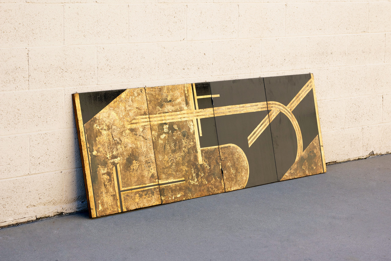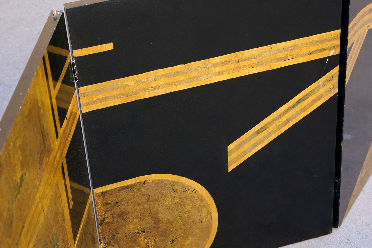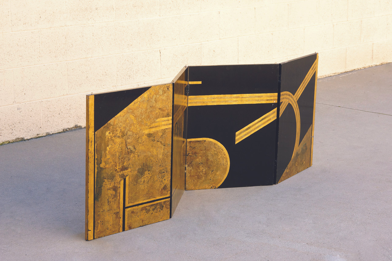 Original art deco era folding screen composed of gold leaf and black lacquer on wood panels. Four hinged panels in total comprise this 6ft piece. While it is constructed with hooks to be mounted from the ceiling, it can be utilized in a number of different ways. The the design iconography is reminiscent of Donald Deskey. C. 1930s. Structurally sound with gentle surface wear as pictured.