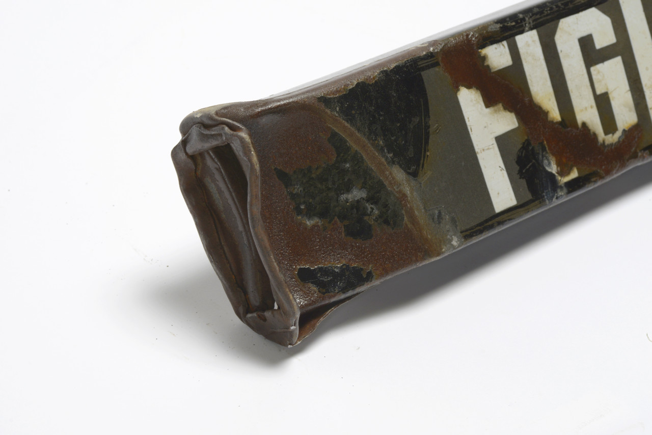 In distressed industrial condition; cleaned and lightly clear-coated to bring out unique surface patina.