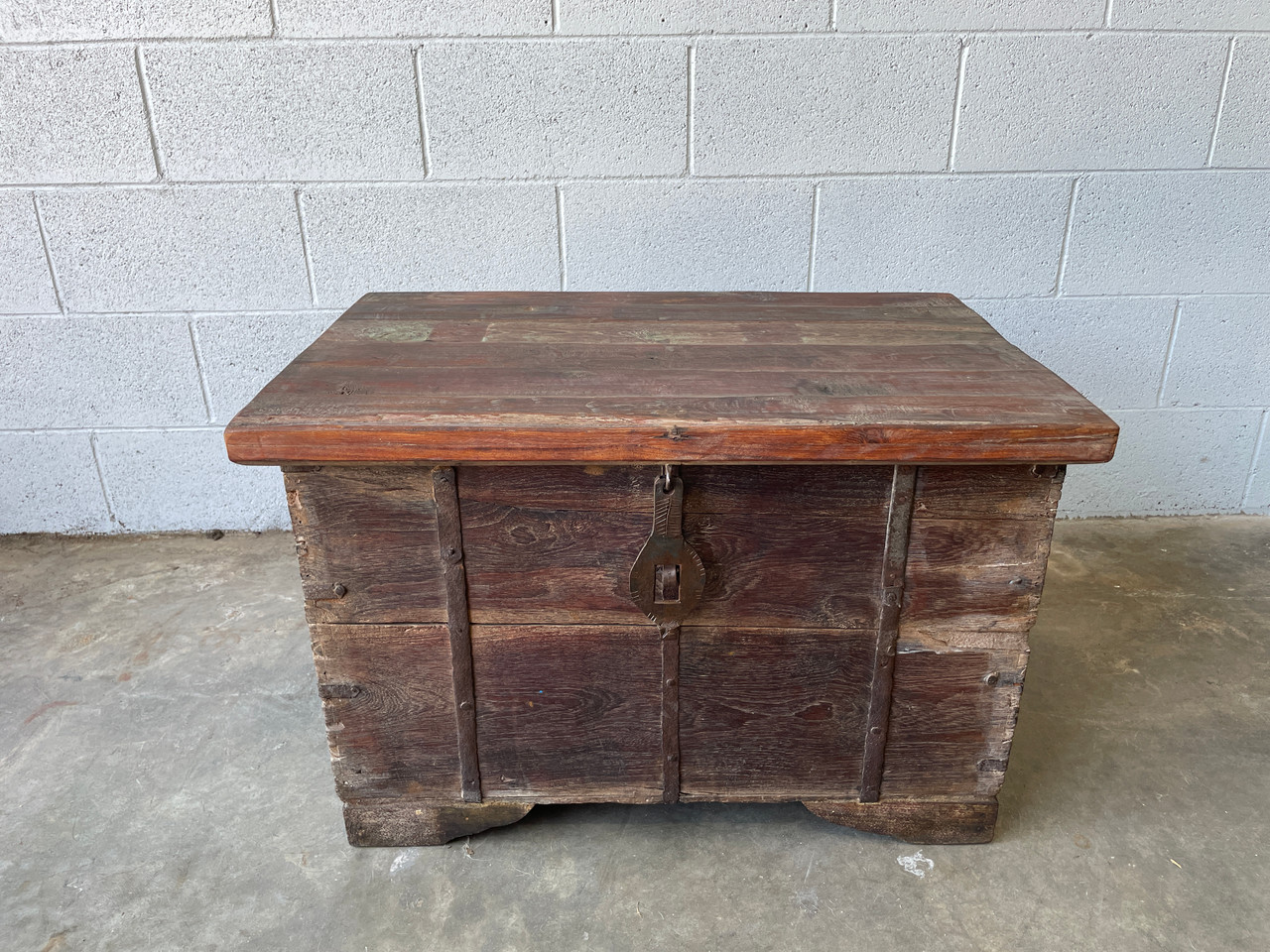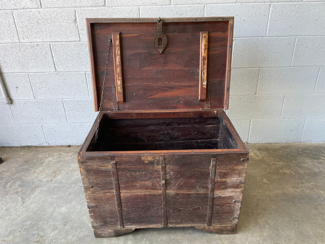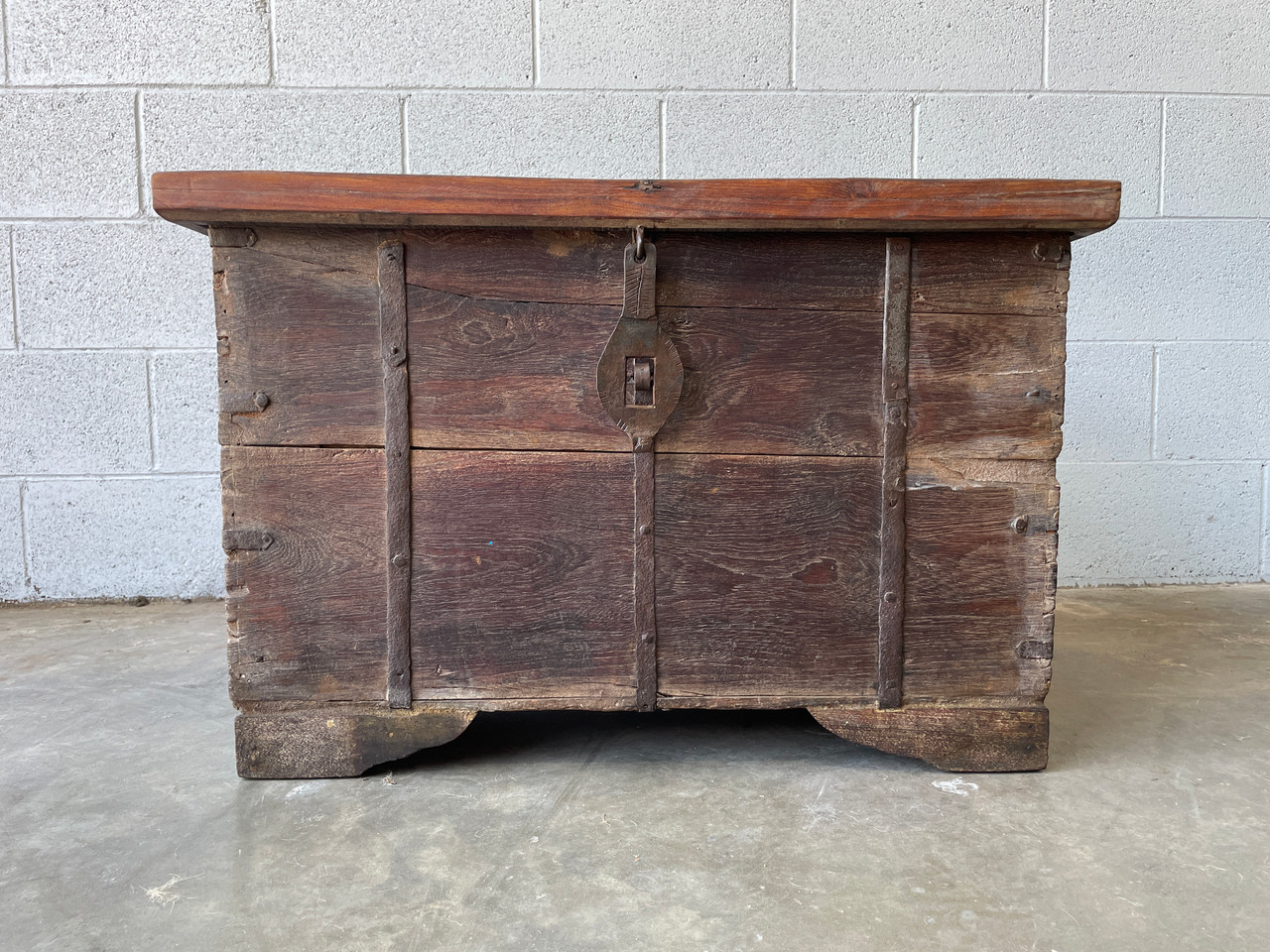 Antique Indian teak wood trunk. Handcrafted with wrought iron & brass hardware. Very heavy! Perfect vintage storage solution. Use it to store your bedding, and linens, or even use it as a toy chest! In excellent condition as pictured.