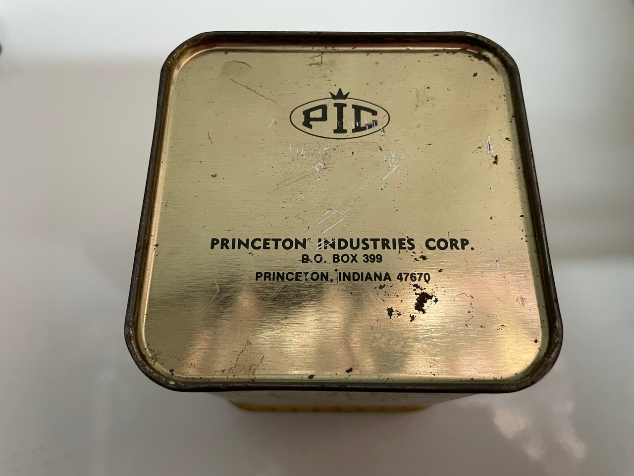 Set of 7 vintage and antique tobacco and tea tins. Use it to store your sewing kit and trinkets or use them as antique decorations. Set includes: Vintage Velvet Pipe & Cigarette Tobacco tin. Prince Albert Crimp Cut Tobacco Tin. Lipton tea bags tin. Bell's waterproof wax vestas. Golden virginia hand rolling tobacco. Princeton Industries Corp. PIC Butterfly Square Tin from the 1980s.