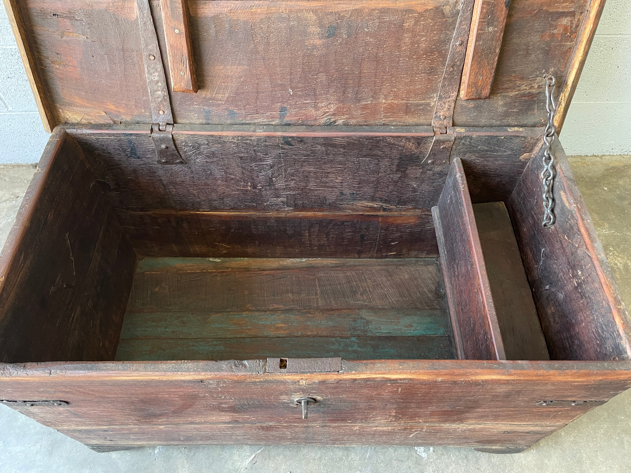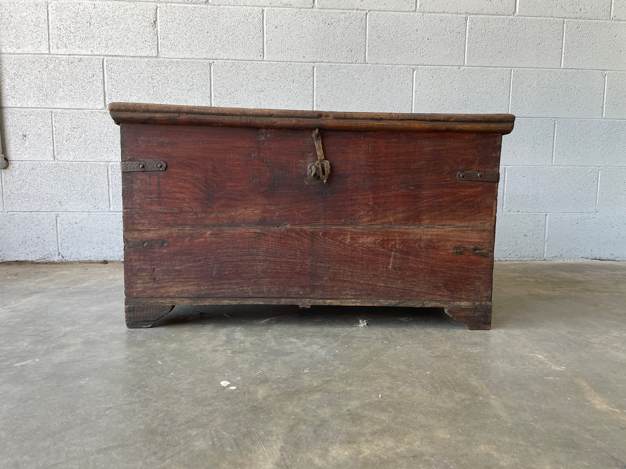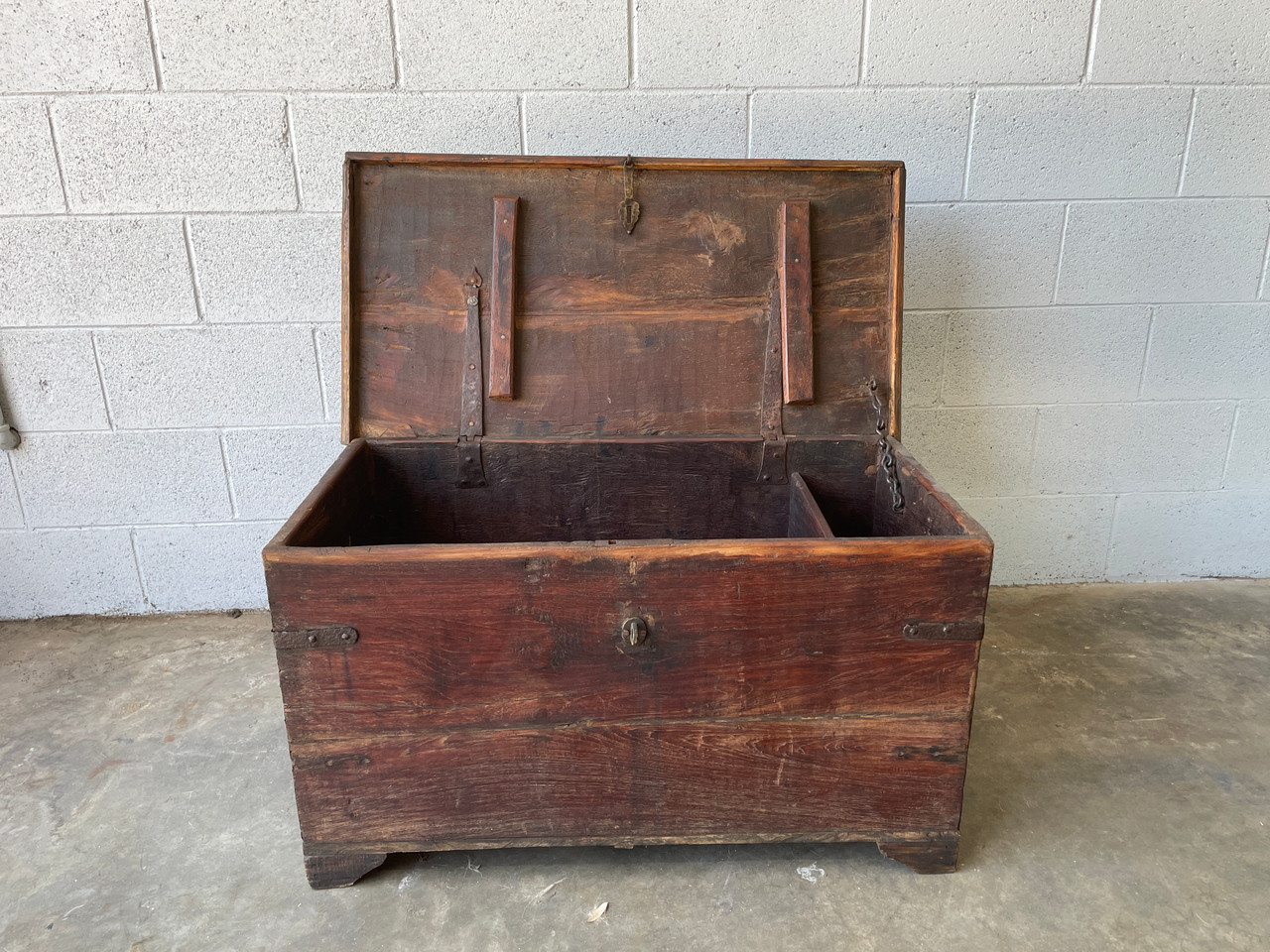 Antique Indian teak wood trunk. Handcrafted with wrought iron & brass hardware. Very heavy! Perfect vintage storage solution. Use it to store your bedding, and linens, or even use it as a toy chest! In excellent antique condition as pictured.
