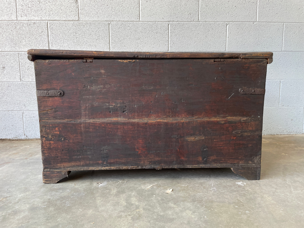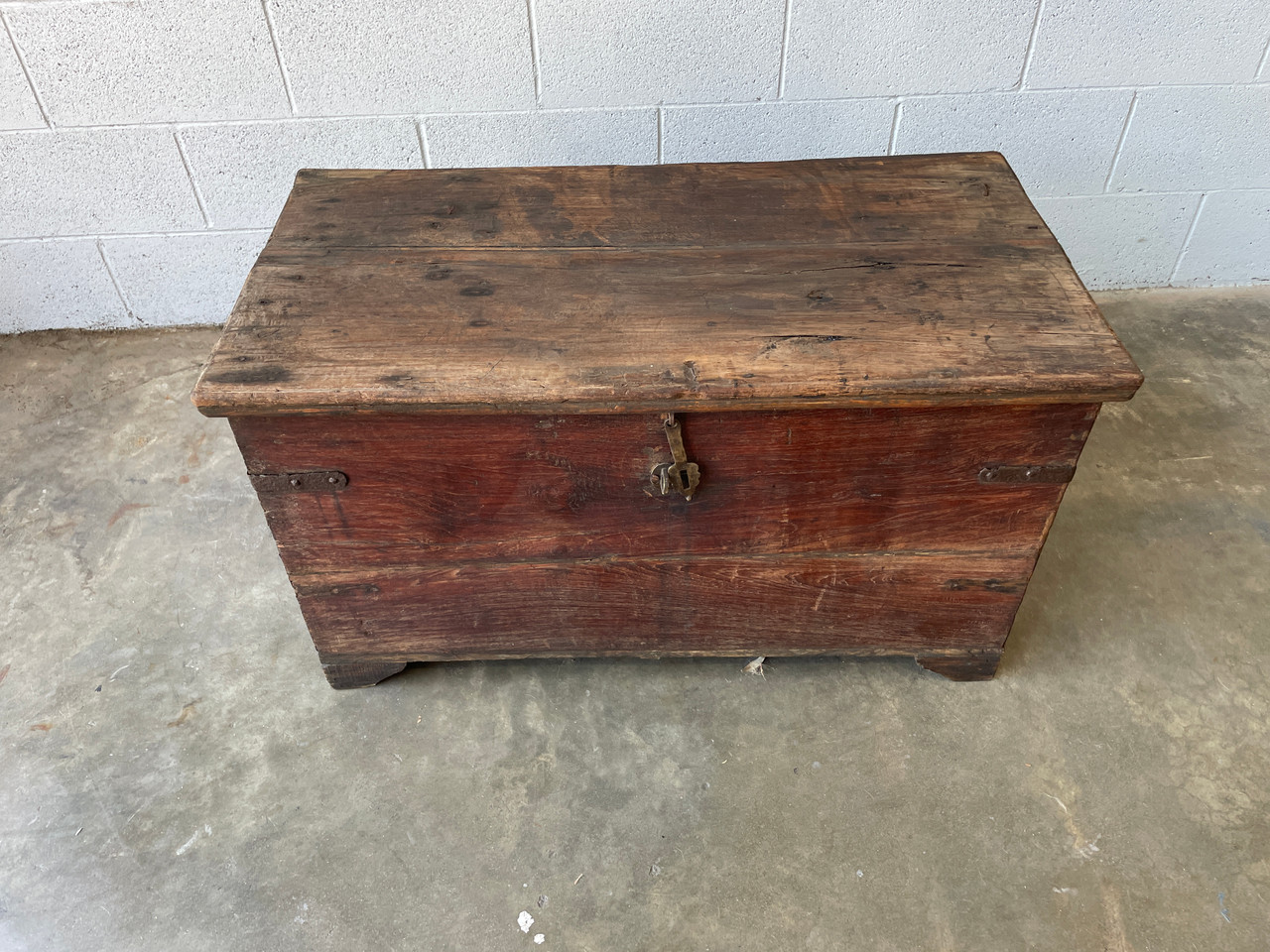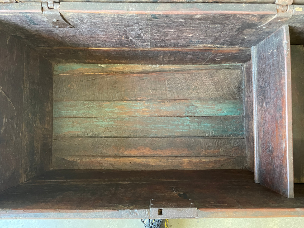 Antique Indian teak wood trunk. Handcrafted with wrought iron & brass hardware. Very heavy! Perfect vintage storage solution. Use it to store your bedding, and linens, or even use it as a toy chest! In excellent antique condition as pictured.