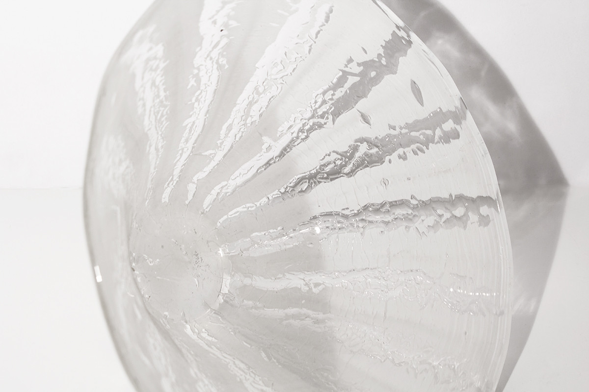 Sexy clear glass serving bowl with cylinder base and tapered body. Unique vertical swirl relief work.