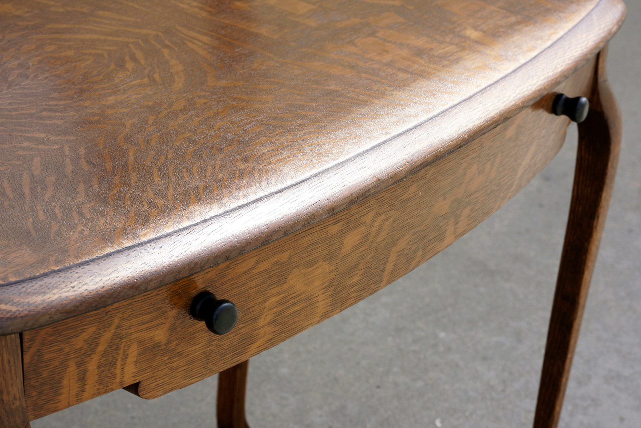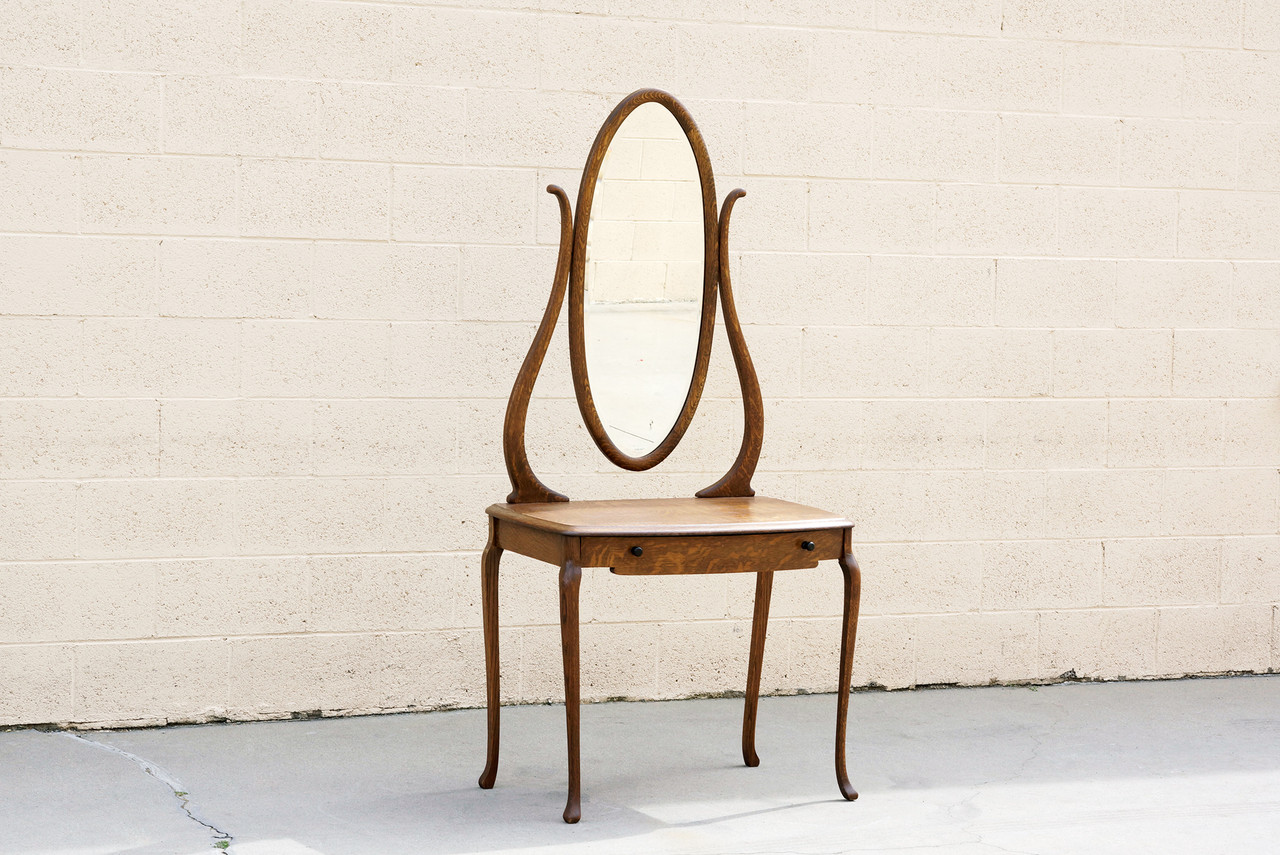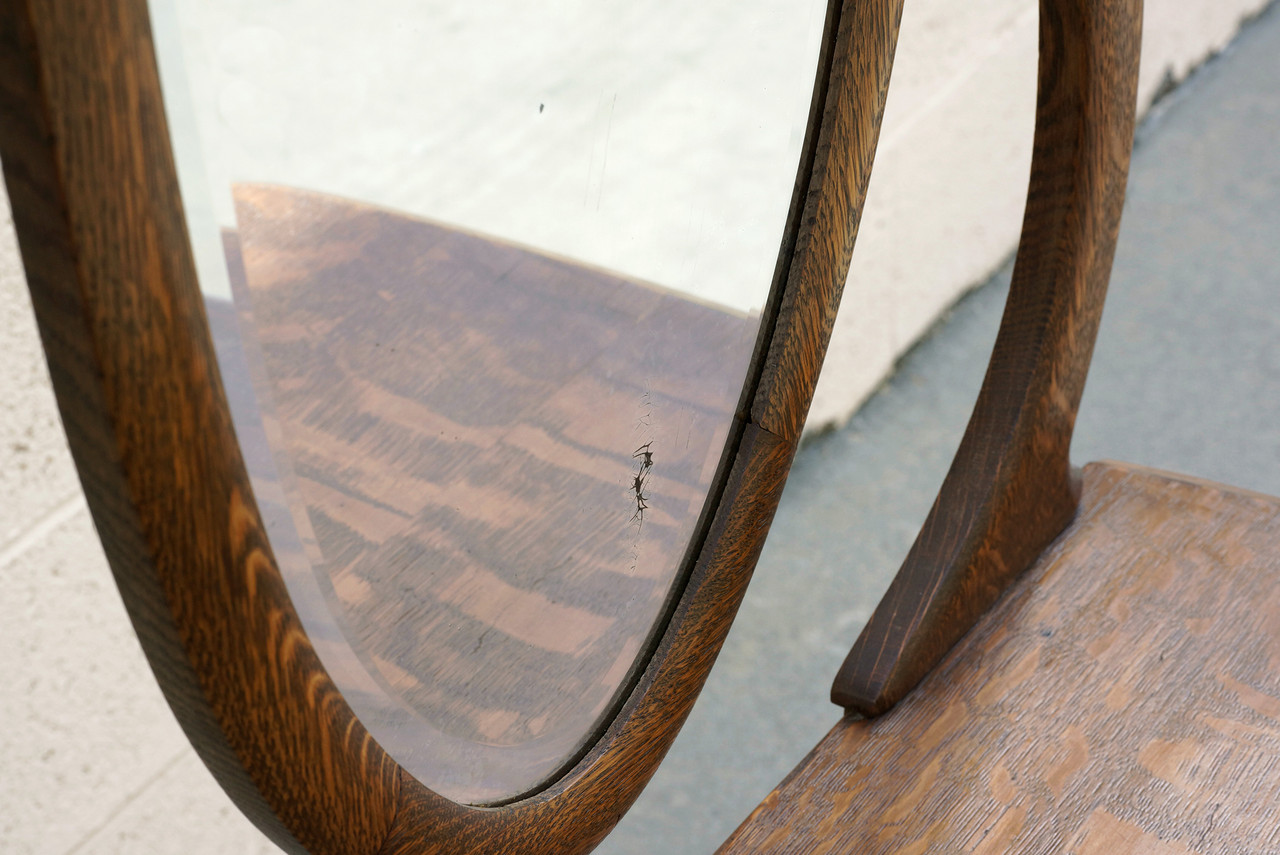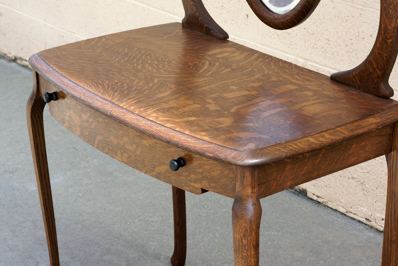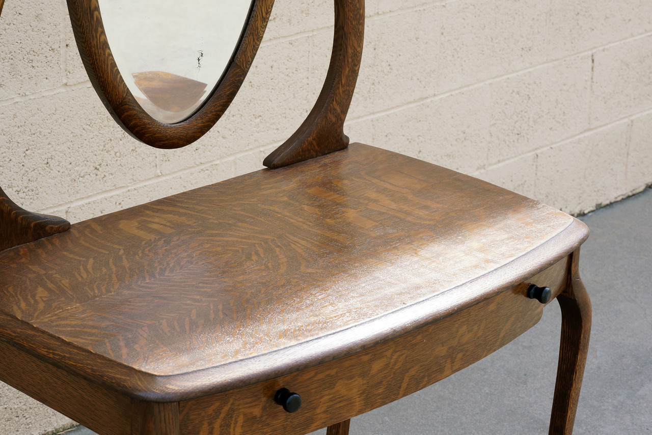 Lovely turn of the century antique vanity of tiger oak with hinged (adjustable) glass mirror and single drawer. Original mirror and painted wood drawer pulls. Wonderful organic curves and rich wood grain pattern. Reconditioned wood. In very good condition for age and use with light antique patina; please refer to photos.
