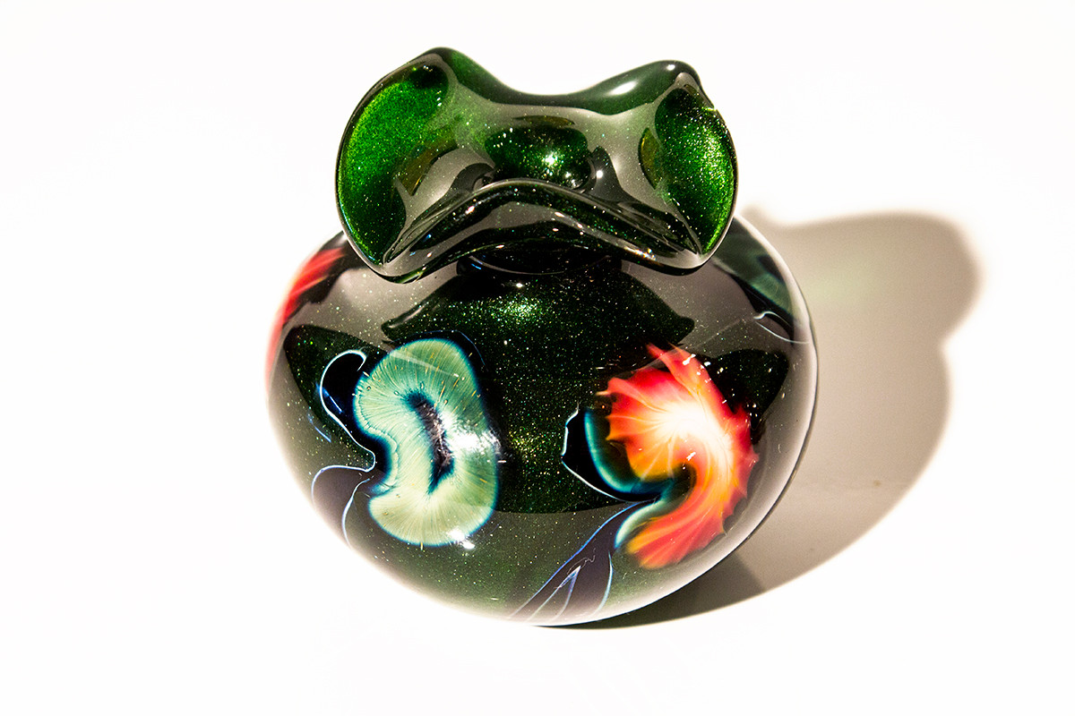 This beautiful art nouveau style glass vase is masterfully handcrafted. Unusual Iridescent, opaque green glass with abstract floral design, hand-blown in the shape of a pouch. Excellent condition. Signature on bottom appears to read Alter Studios, 1999, though this cannot be confirmed.