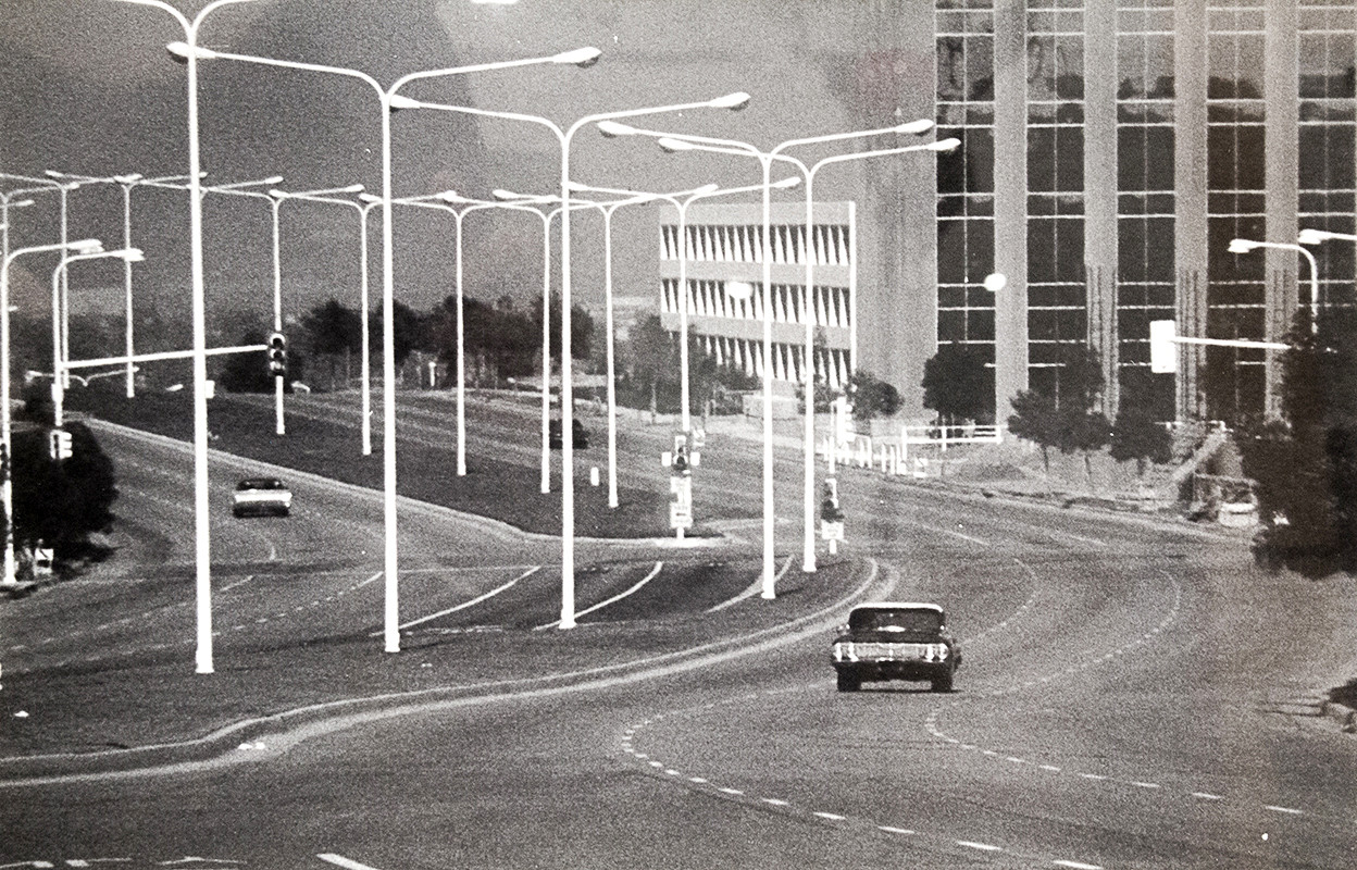 Rare image of a Los Angeles freeway by amateur photographer Robert Webber. Only two cars on the road!
