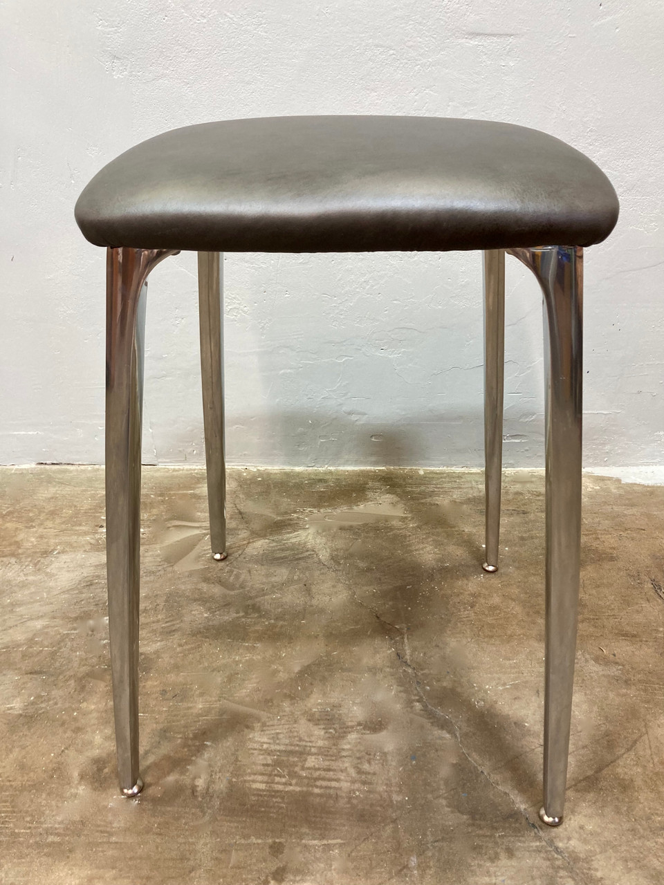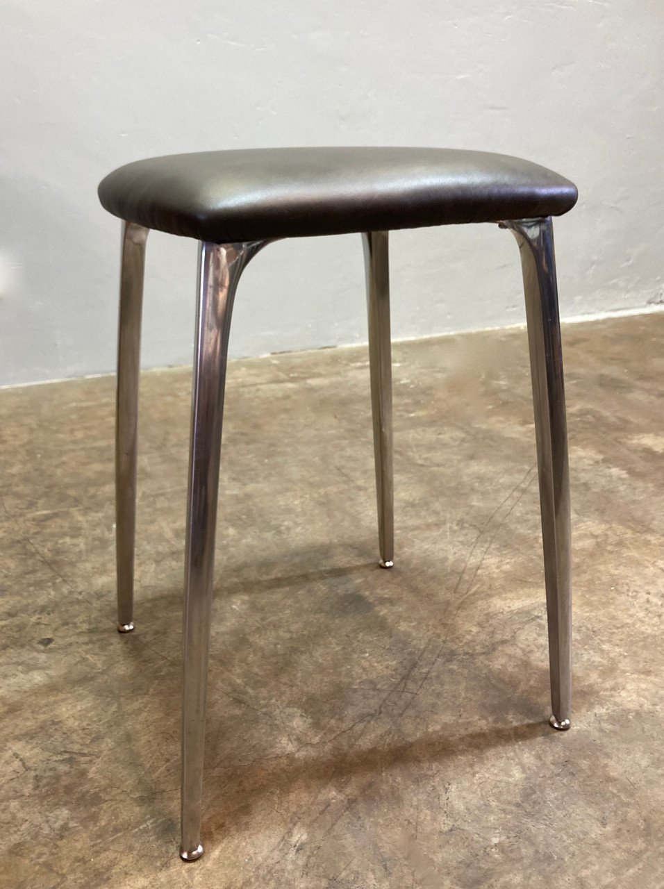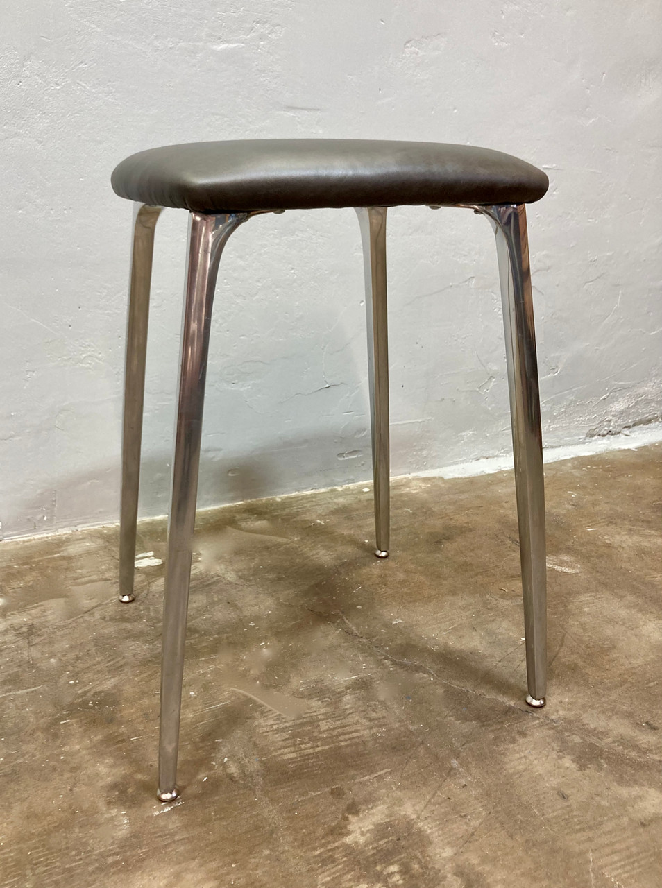 Elegant McM "futuristic" stool, made of cast aluminum and newly uphulstred stormy-brown leather cushion. Shelby Williams "Gazelle" chair inspired design. Stool is a medium height, and would fit great with a drawing desk or under a kitchen counter.