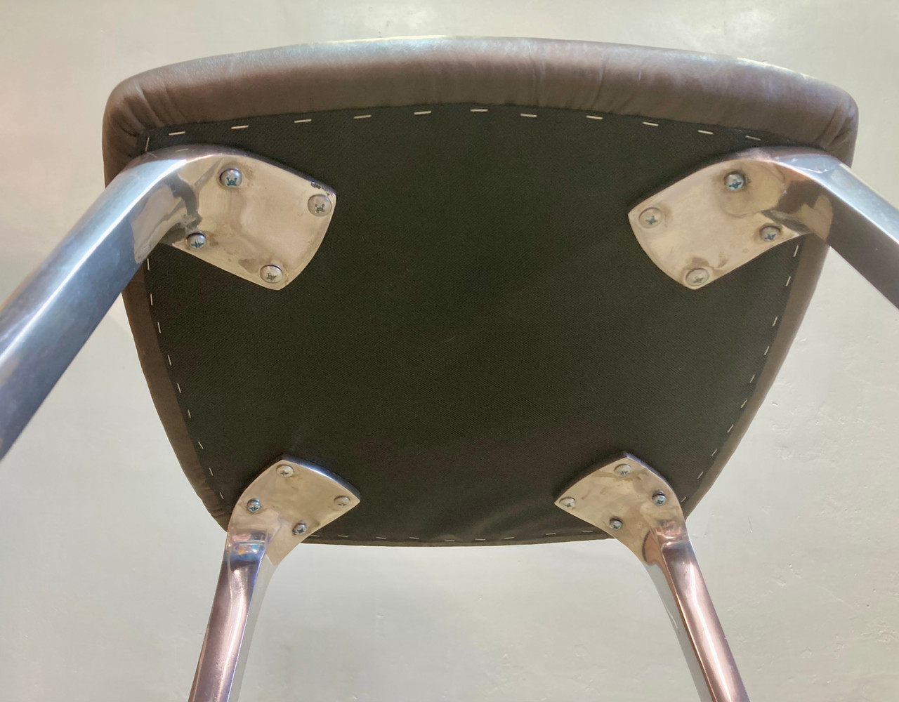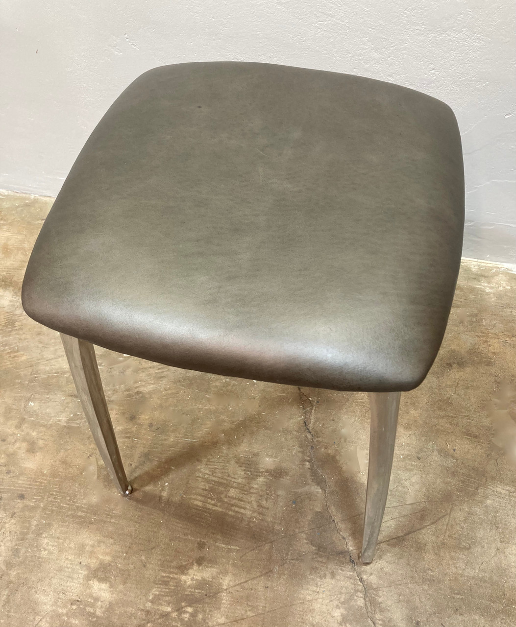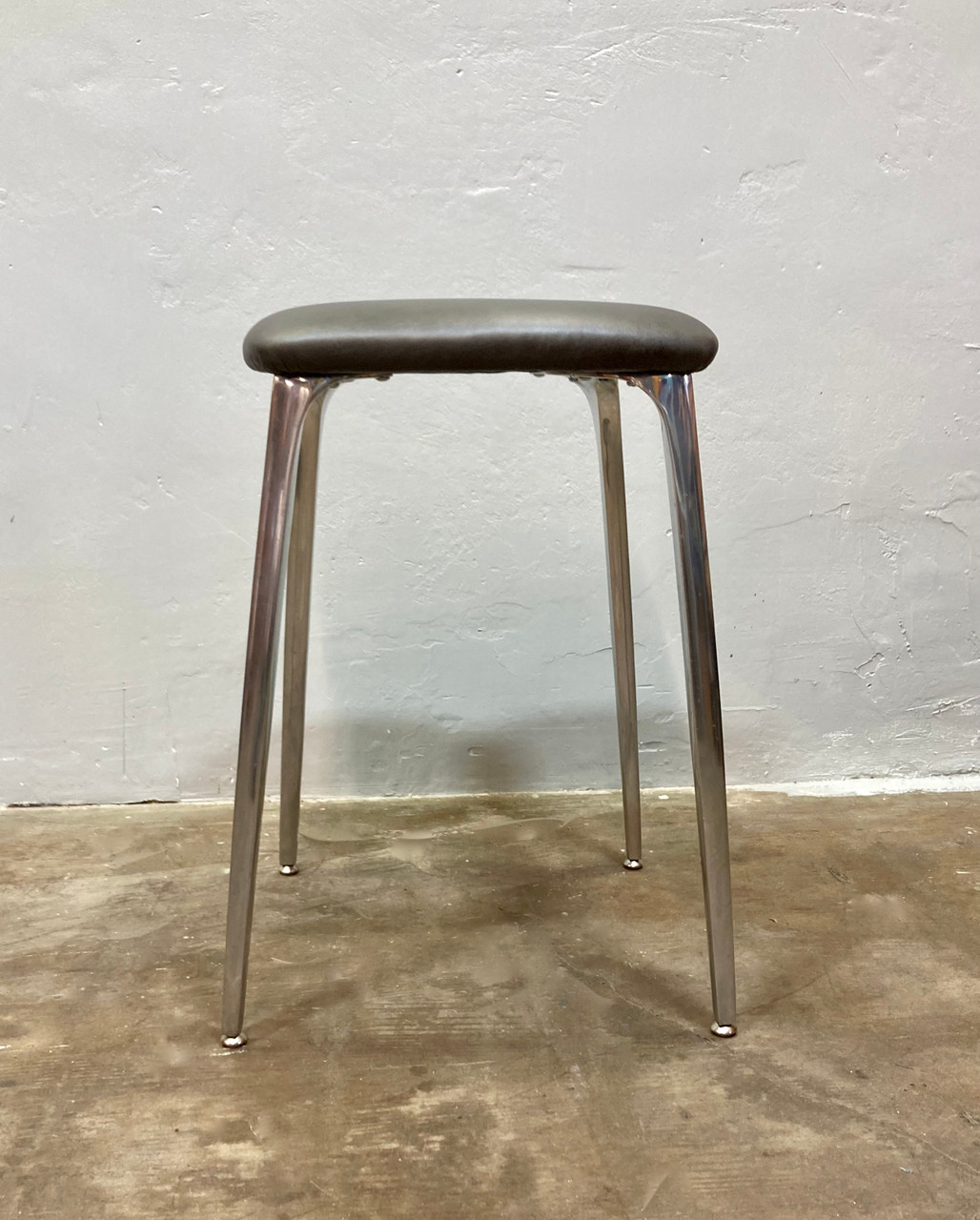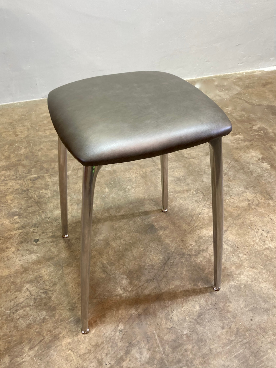 Elegant McM "futuristic" stool, made of cast aluminum and newly uphulstred stormy-brown leather cushion. Shelby Williams "Gazelle" chair inspired design. Stool is a medium height, and would fit great with a drawing desk or under a kitchen counter.