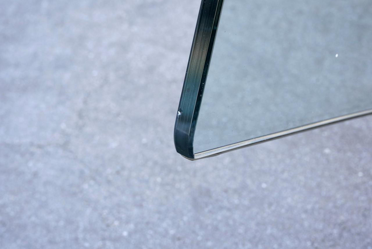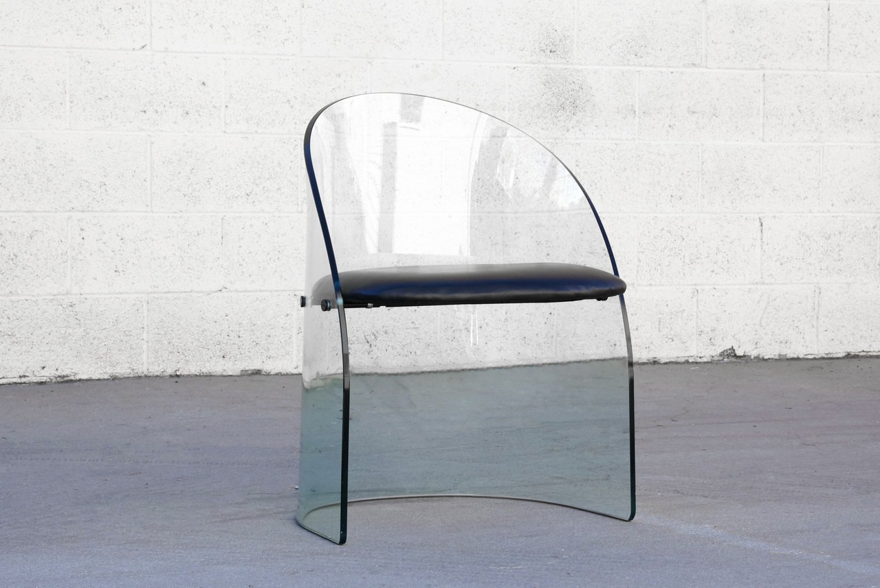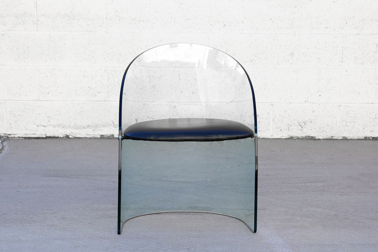 This excellent vintage glass side chair makes statement! Created in the likeness of the famed 1939 Glass Center Pavillon chair designed by Louis Dierra and manufactured by the Pittsburgh Plate Glass Co, this uniquely designed piece celebrates glass as a material of the future. Newly reupholstered seat in high quality black vinyl.
