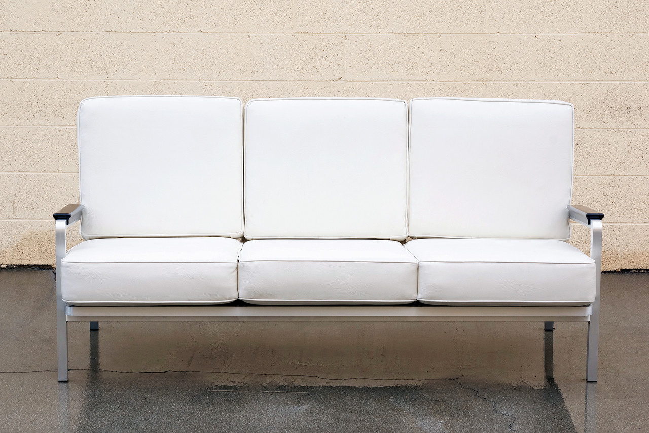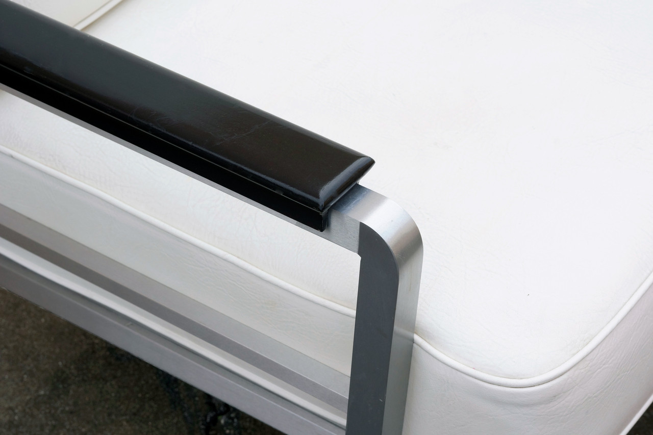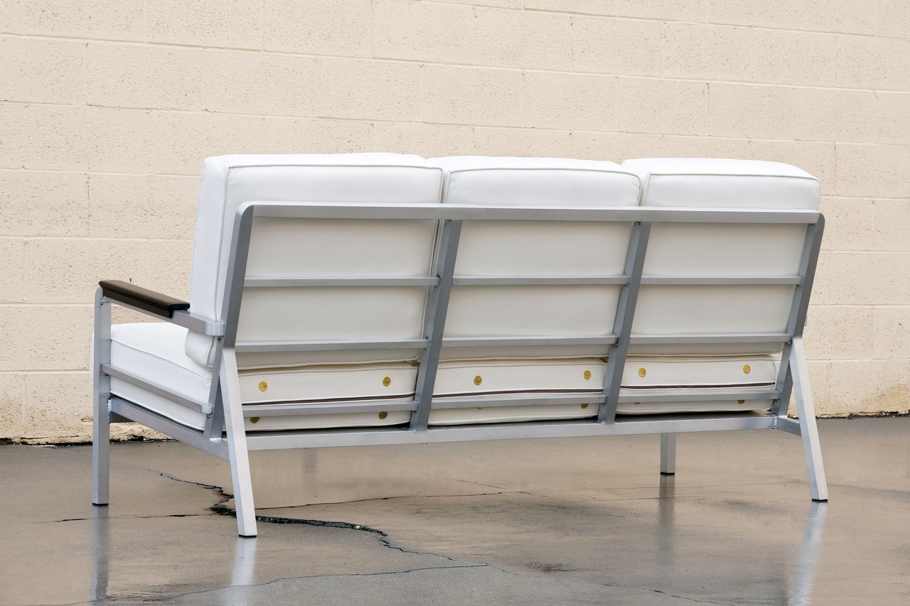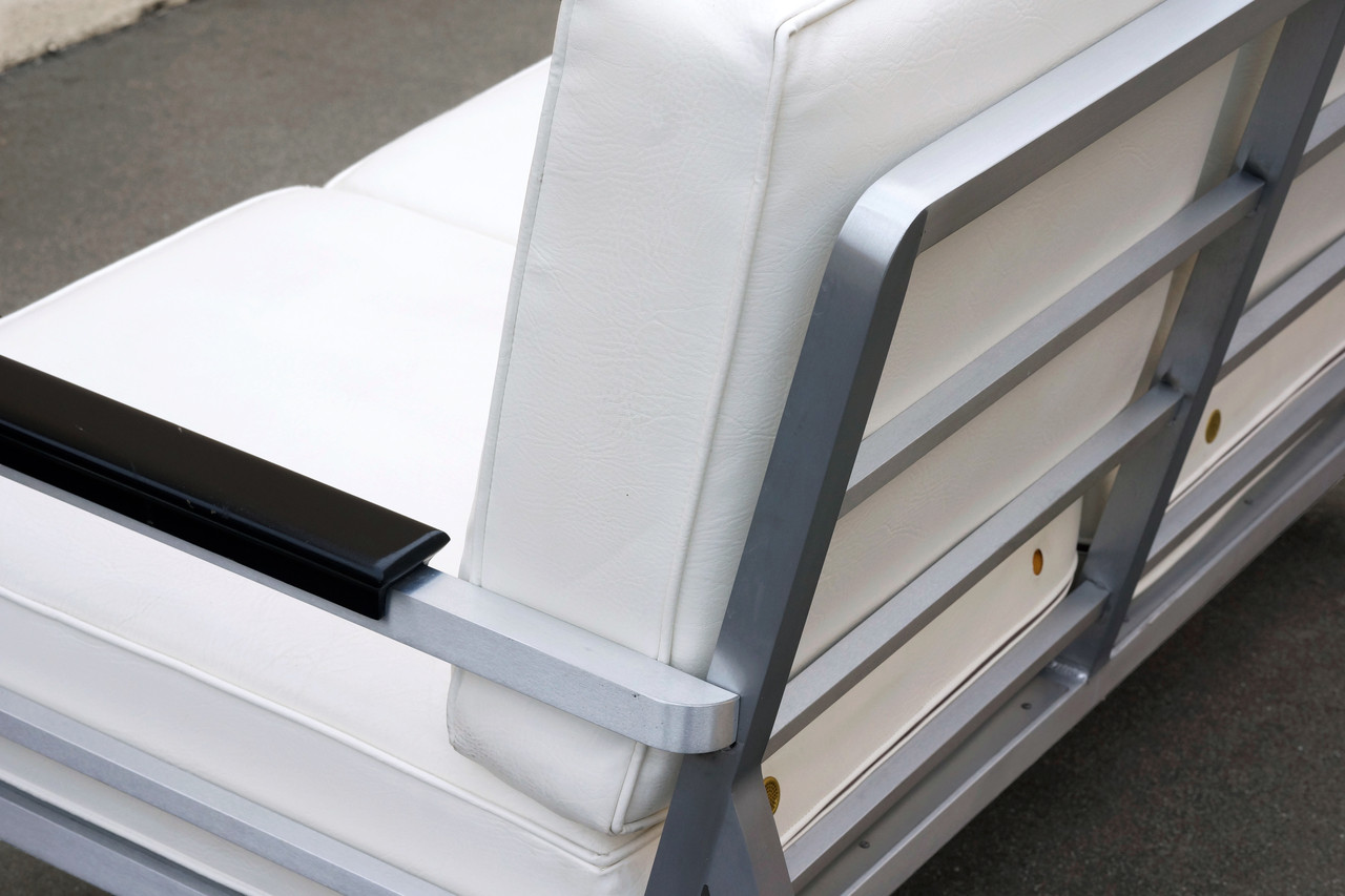Our custom made Lobby series sofa is inspired by 1940s Emeco furniture originally made for Naval ships. Composed of an aluminum frame, white vinyl upholstery and black lacquer arm-caps. Designed an manufactured in Los Angeles by Rehab Vintage Interiors. 1 available as pictured; like new condition with minimal signs of wear.