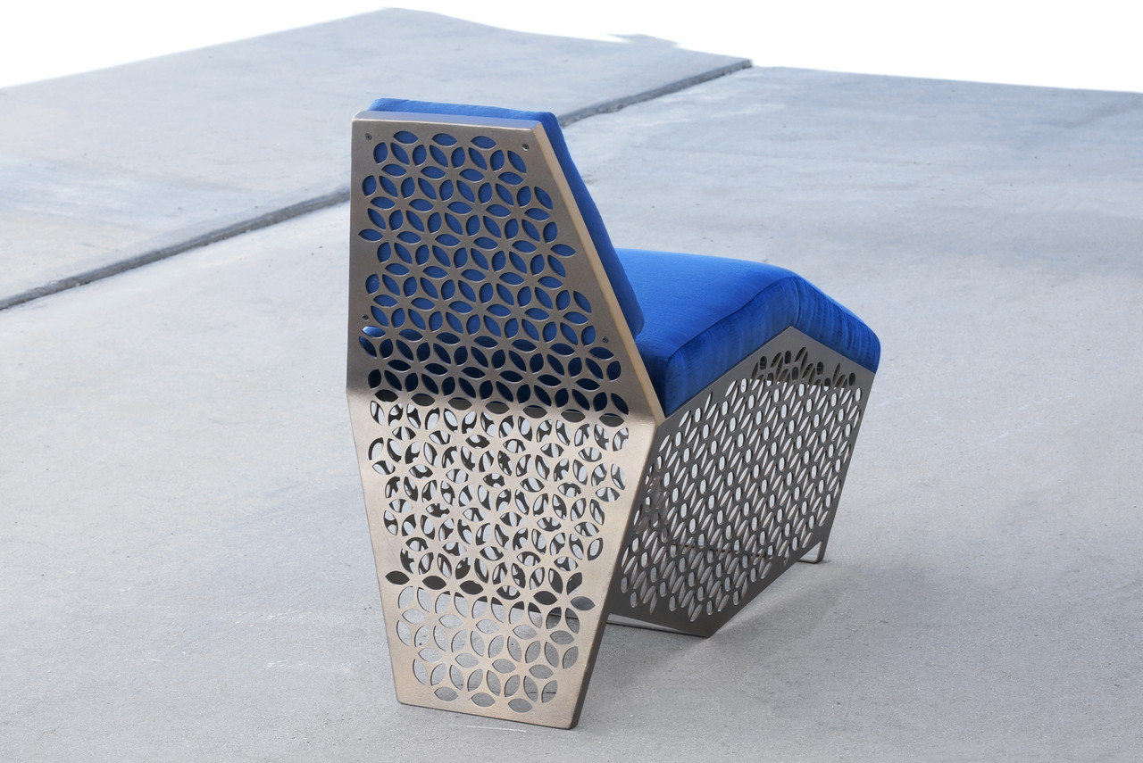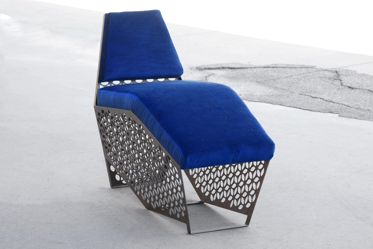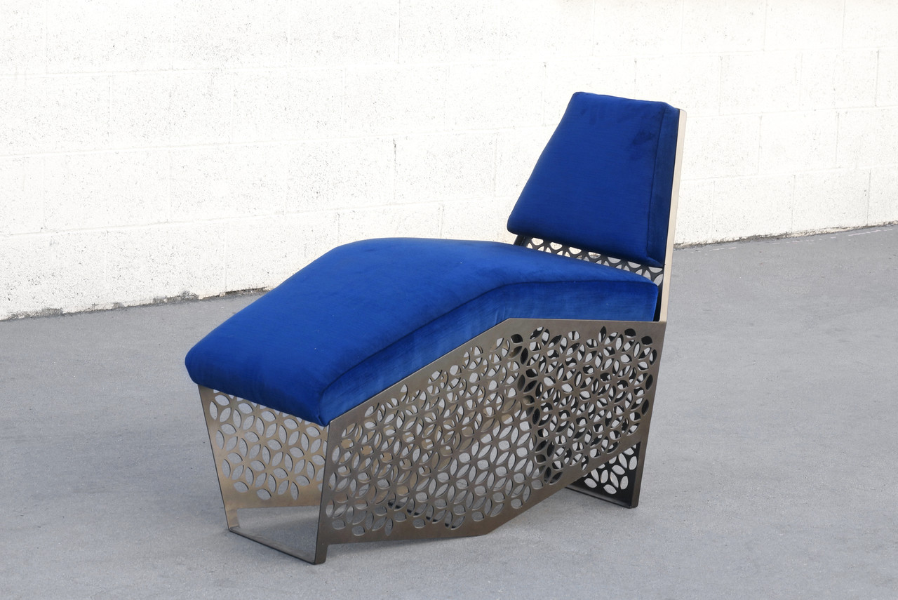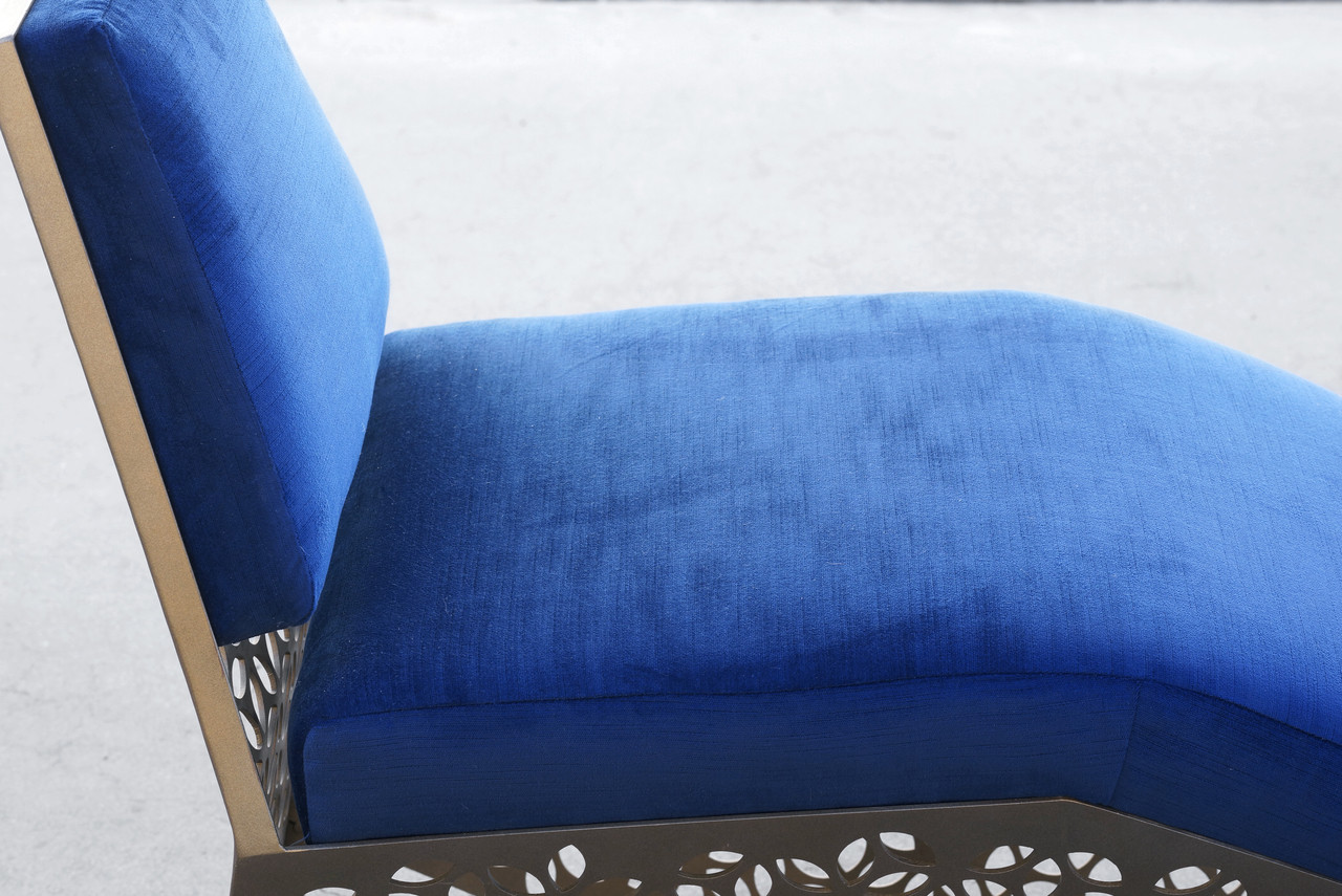 Rehab Vintage Interiors petite chaise lounge chair. Features custom laser cut sheet metal with a metallic bronze powder coated finish and blue velvet upholstery. Excellent geometric mod styling.