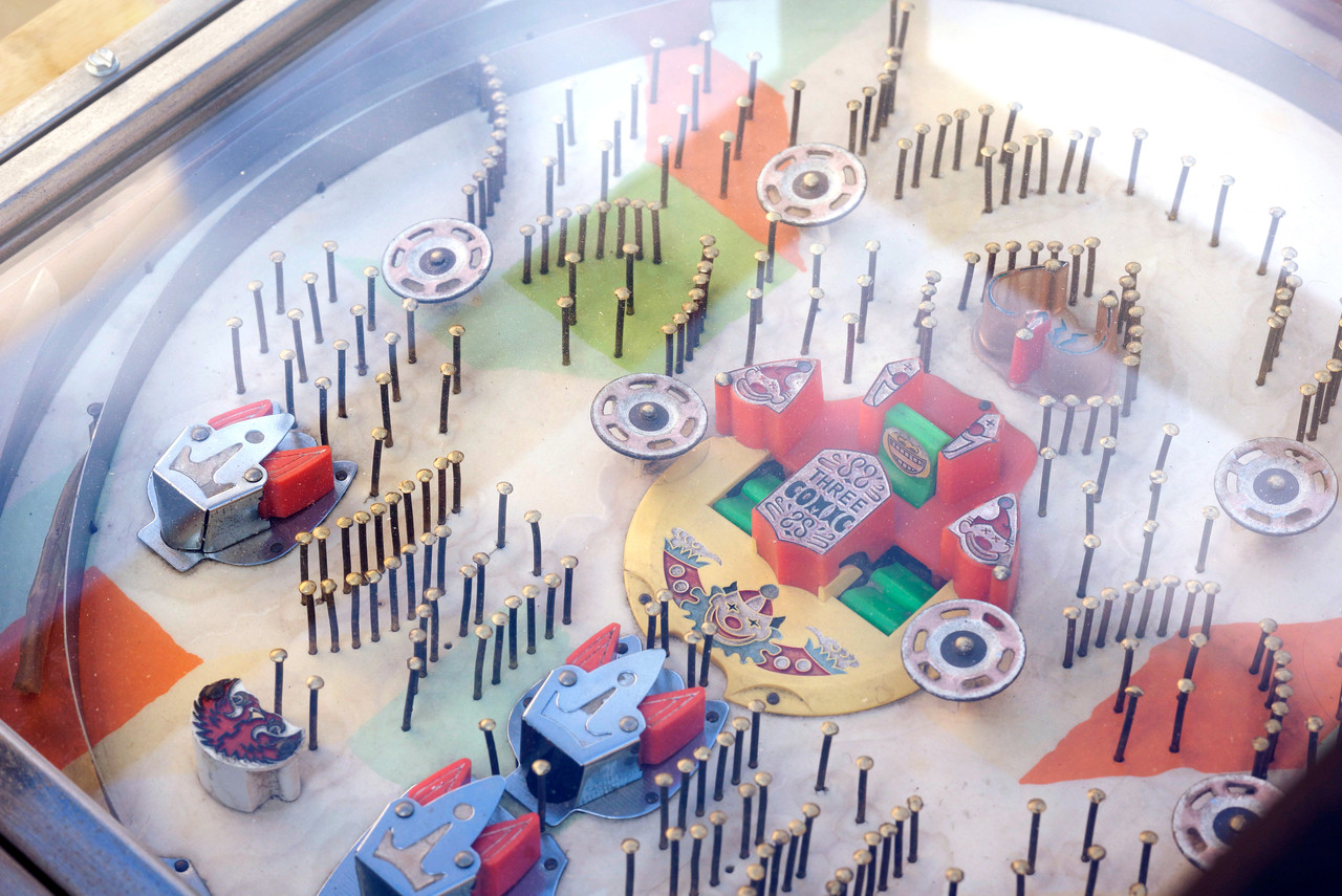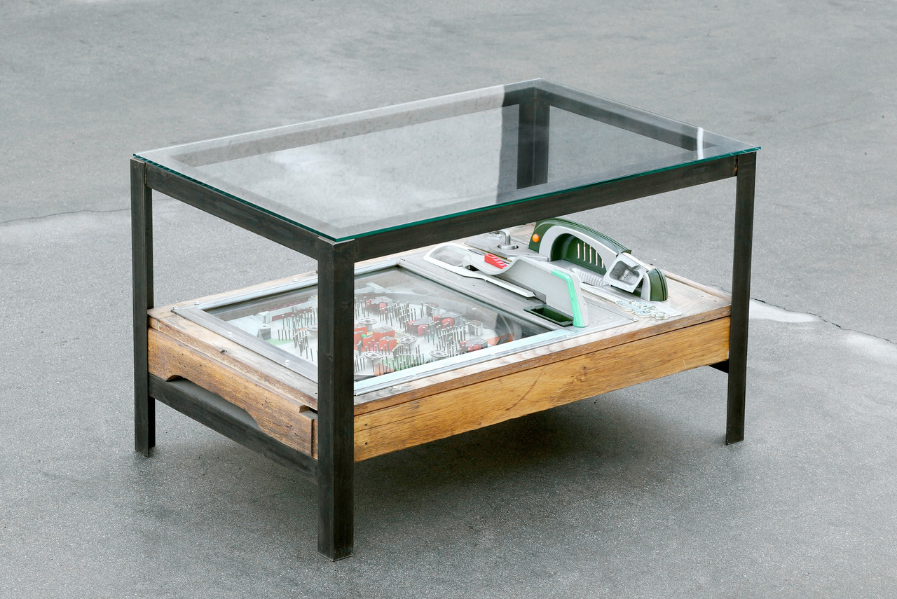 Our unique coffee table combines a vintage Japanese Pachinko arcade game in a custom-made steel frame with a tempered glass top. Pachinko is a mechanical game originating in Japan; Like pinball machines, Pachinko boards have a fantastic retro vibe. Our Pachinko coffee table is a one-of-a-kind conversation piece :)