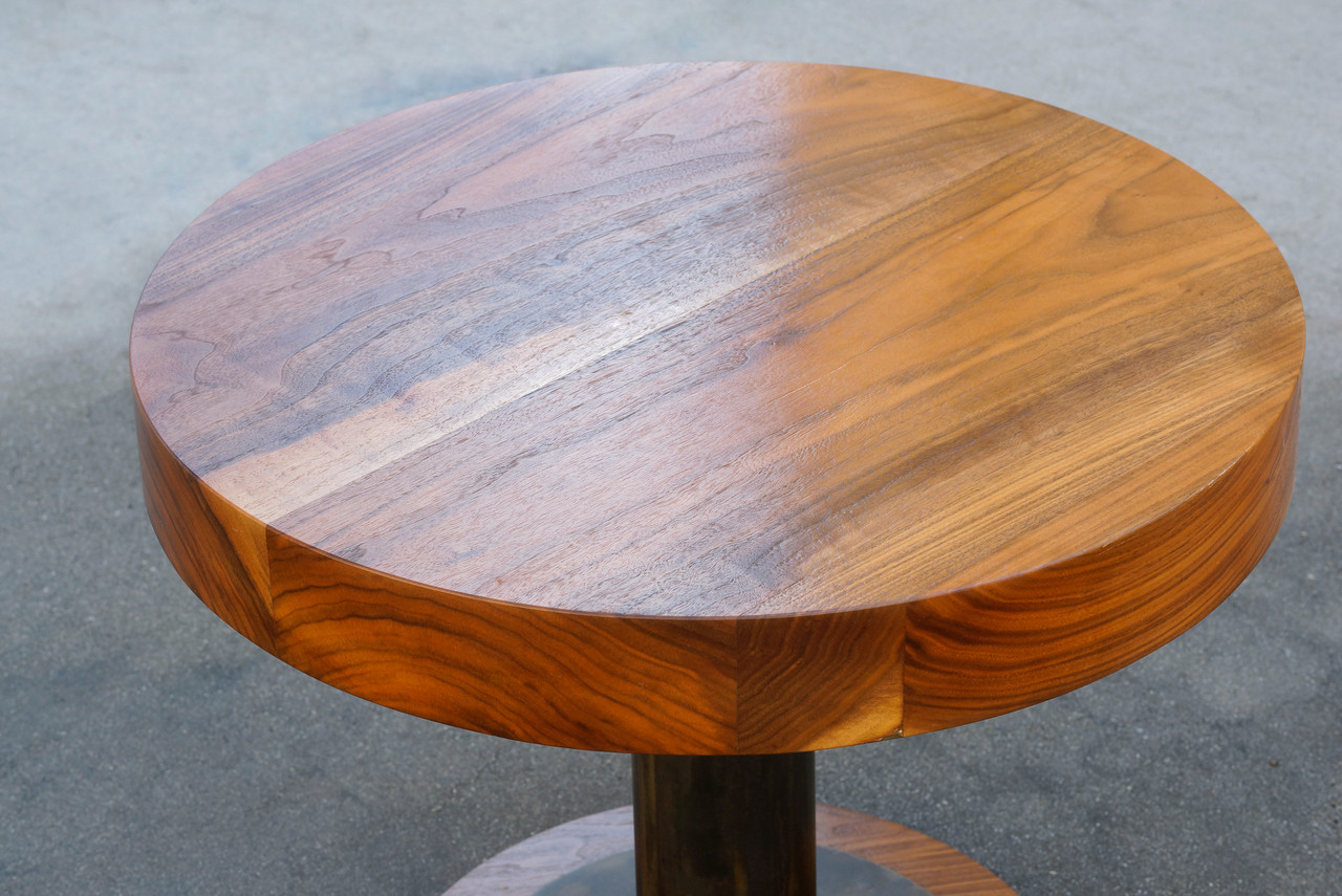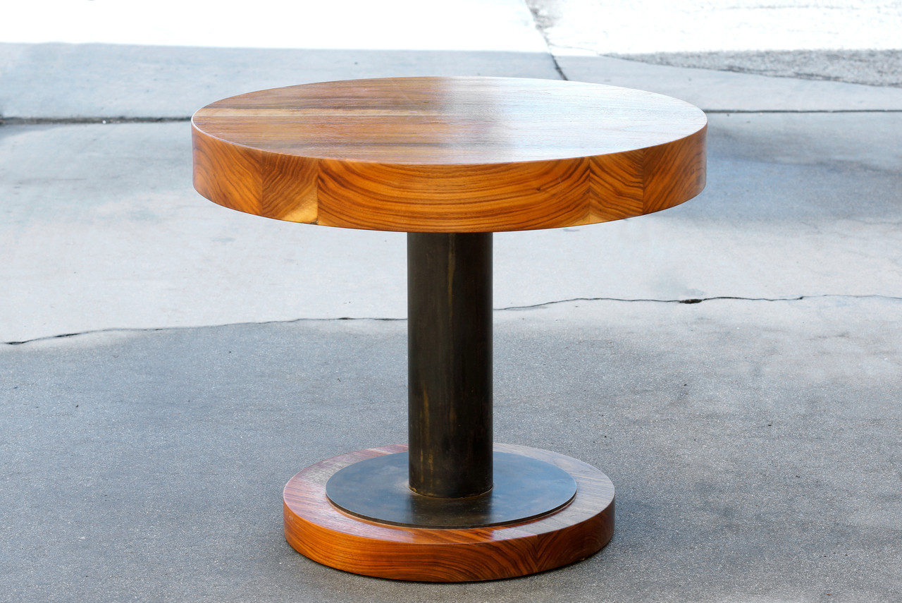 This gorgeous wood and steel table is composed of a lacquered 3" walnut slab top and 4" tube steel pedestal with patina. Wood features beautiful grain pattern. Excellent for use as side or display table.