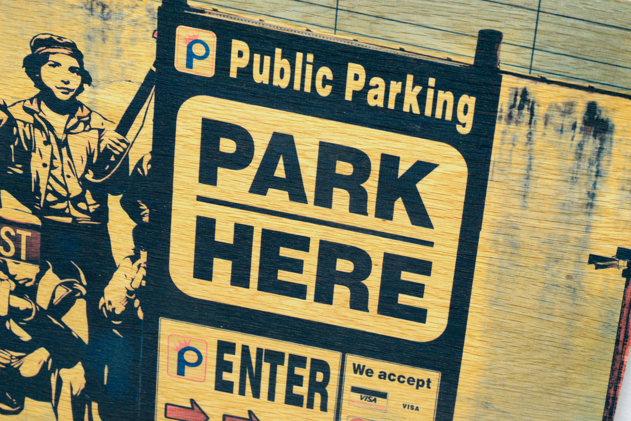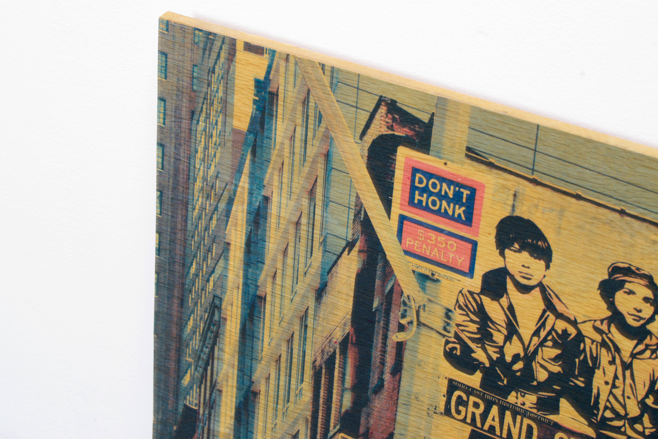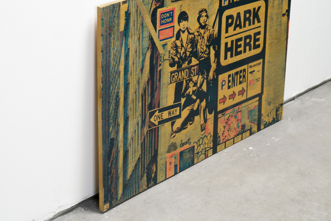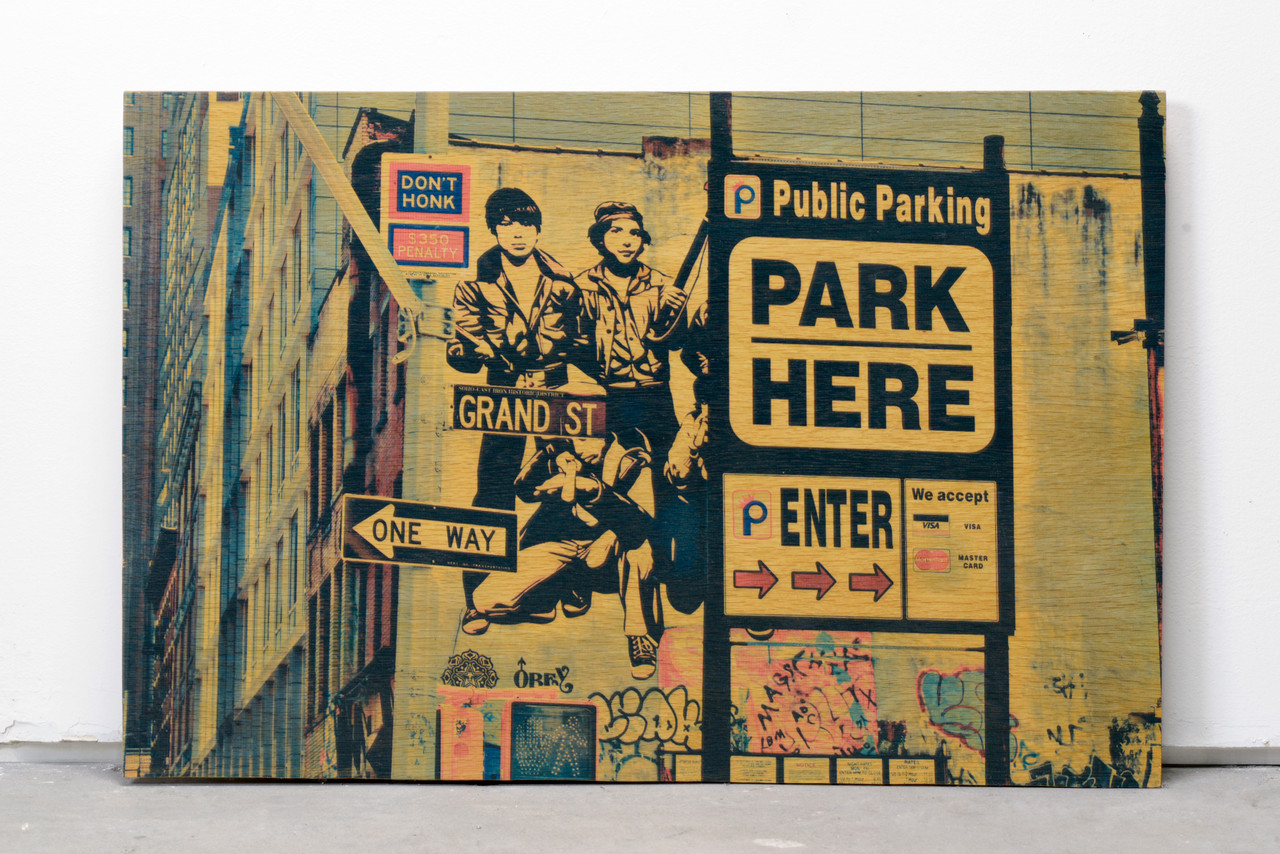 Original Daniel Siboni "Park Here" street art themed wood print. Made via the artist's unique practice of photo collage mounted on wood. Siboni's imagery reflects his long standing interest in the juxtaposition of street art, urban landscapes and graphic design. Although this print is not numbered, we believe it to be one of a kind. This is a vintage piece; please note losses as pictured.
