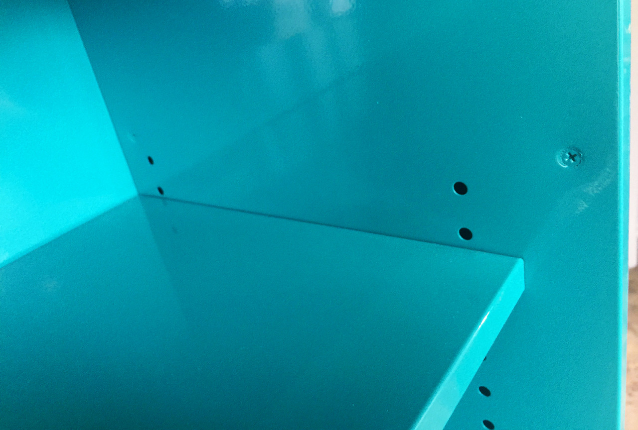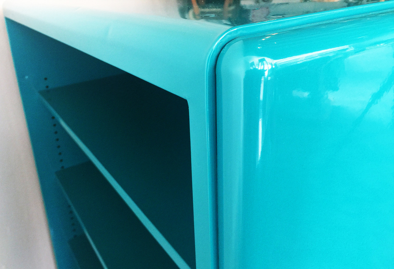It's the classic AllSteel four-shelf tanker bookcase, refinished in a fresh turquoise gloss powder-coat. This 1940s deco-era piece is especially unique for its double-lip "waterfall" frame. A modular unit with adjustable shelves; perfect for storage and display. This unit is in excellent refinished condition with gentle wear to the steel as described in photos.