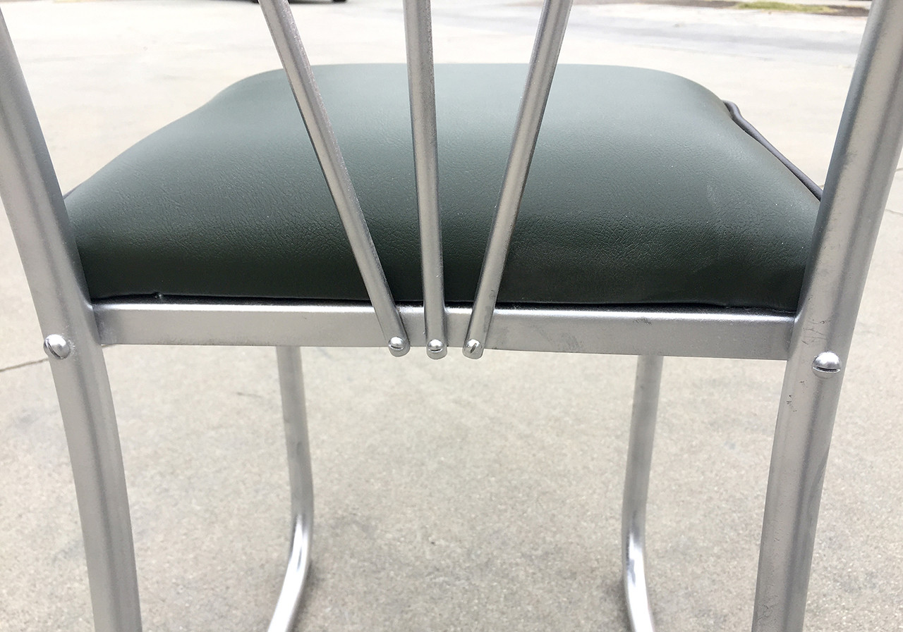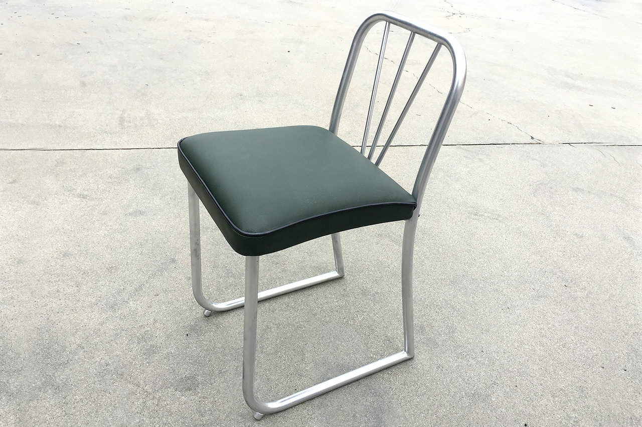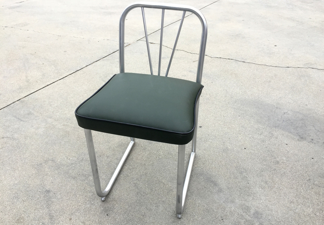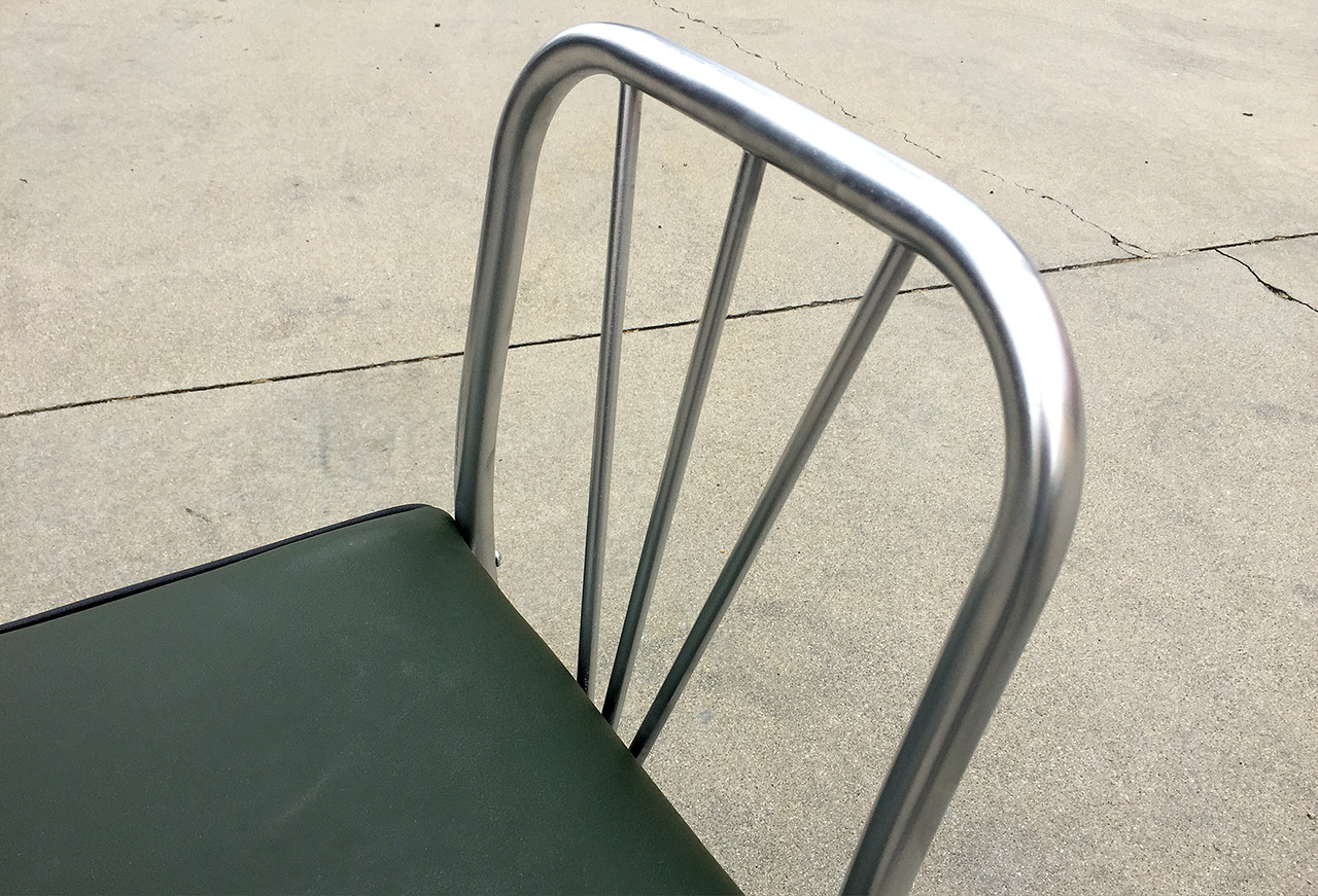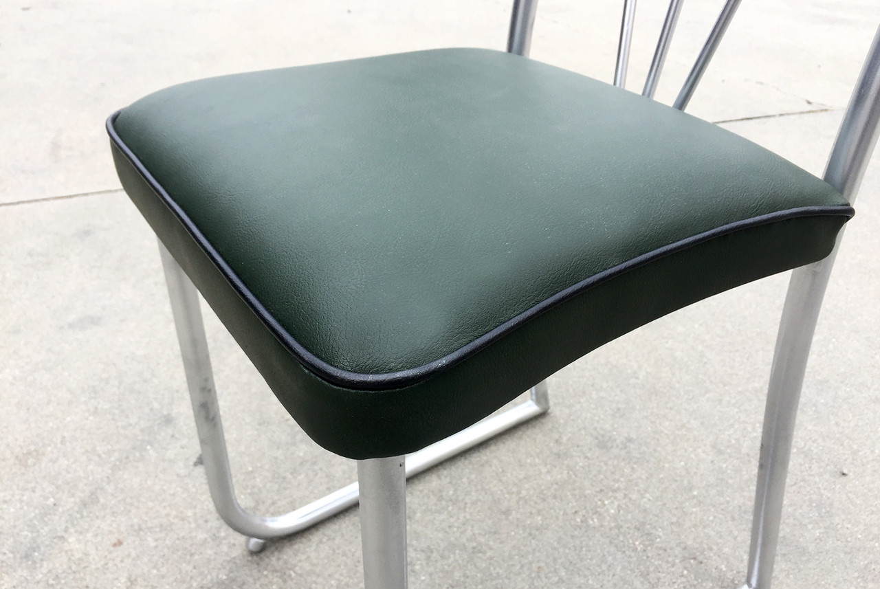 Uncommon Art Deco-era nurses chair, circa 1930s. Sculptural steel frame with unique V-shape back. Newly reupholstered seat in high-quality green vinyl with black piping. Repainted steel.