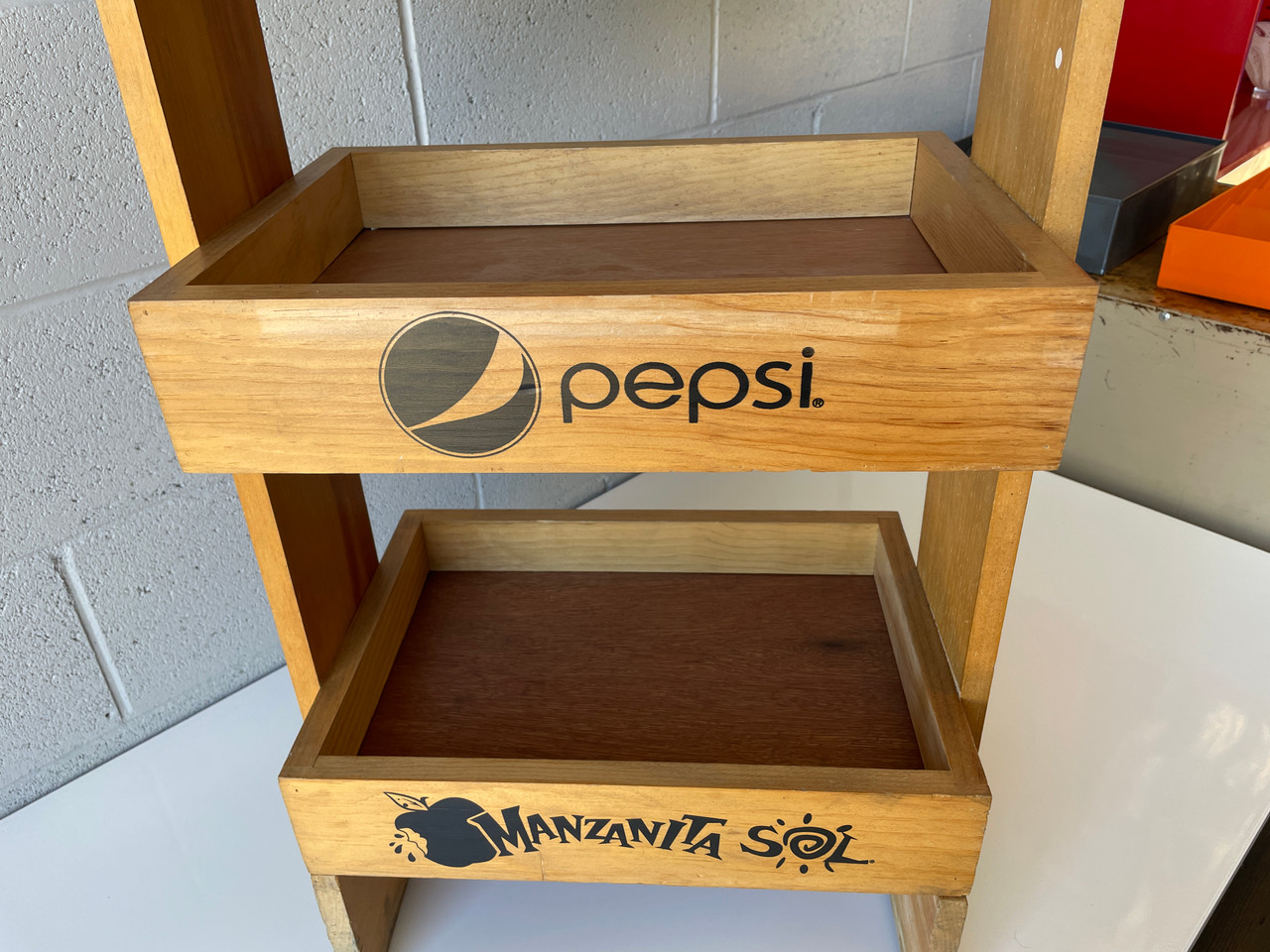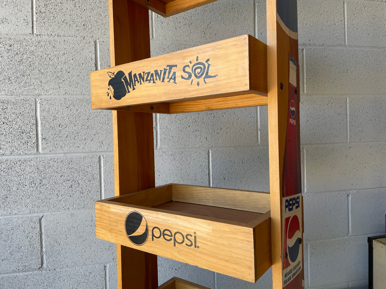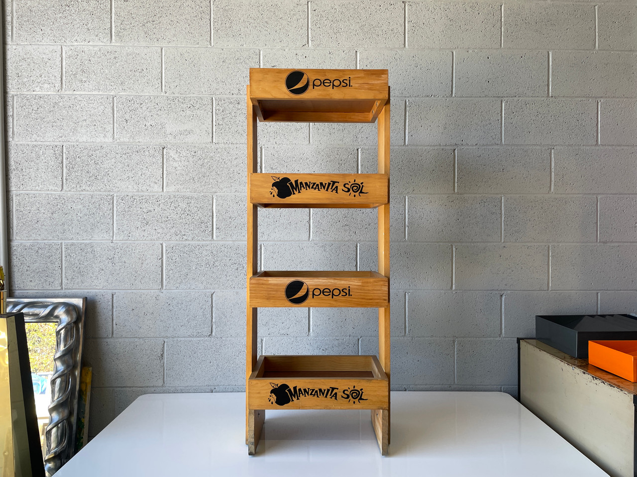 Solid wood, vintage Pepsi shelf by InterMaket Technology Inc. Features four individual shelves, Manzanita Sol and Pepsi decals.