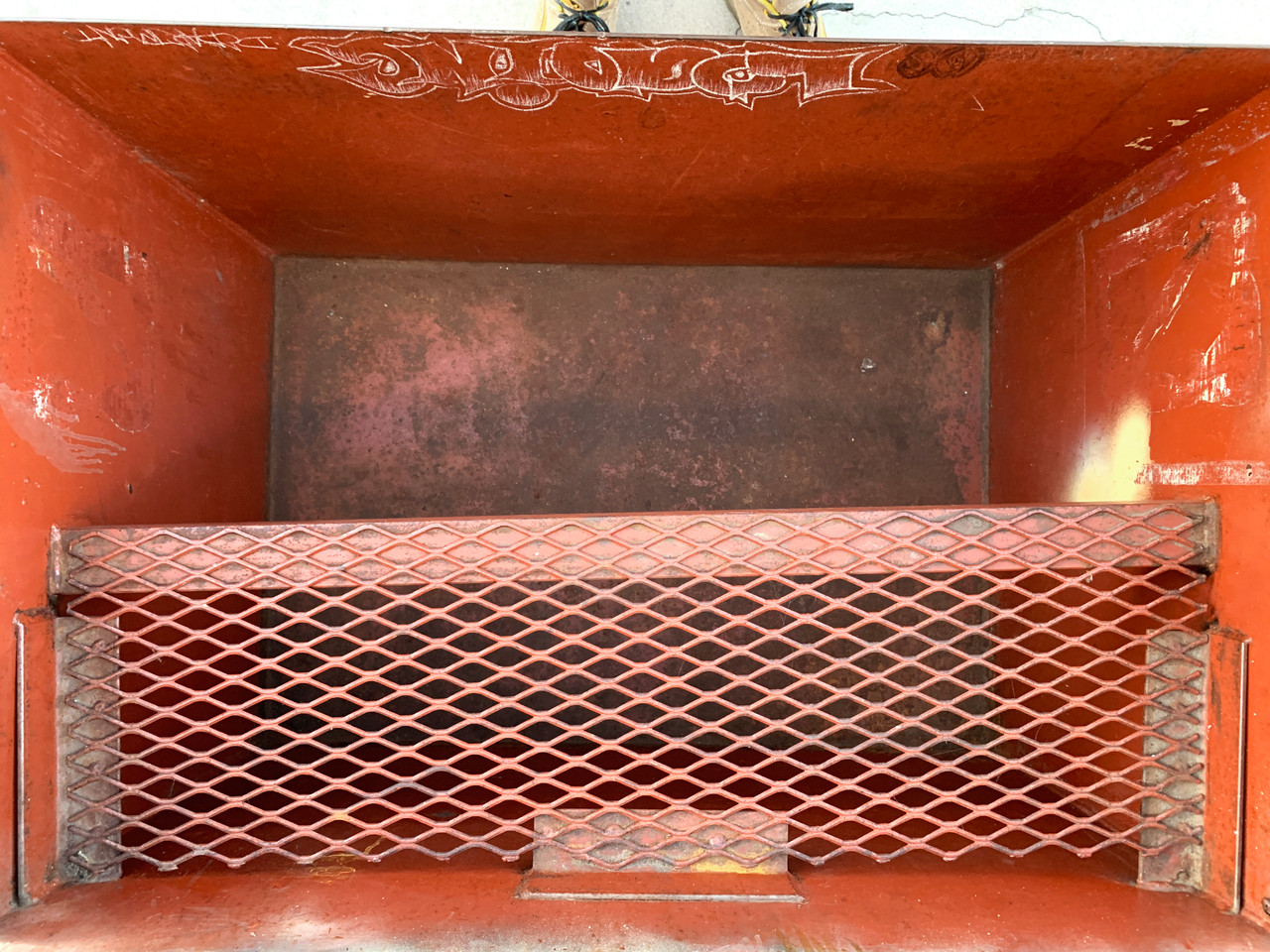 Heavy-duty metal storage box, full of character. It's old, probably dates back to the 1950s. Handmade with distressed red paint and rust patina, this well-made (and very heavy) industrial piece is truly one-of-a-kind. Complete with an expanded metal shelf inside. Use it to store tools in your workshop or as an accent piece or side table in a rustic-inspired interior.