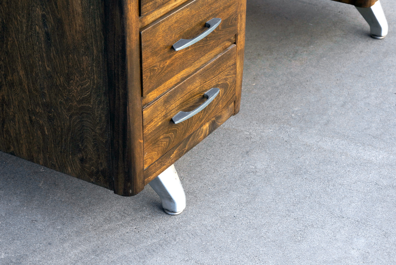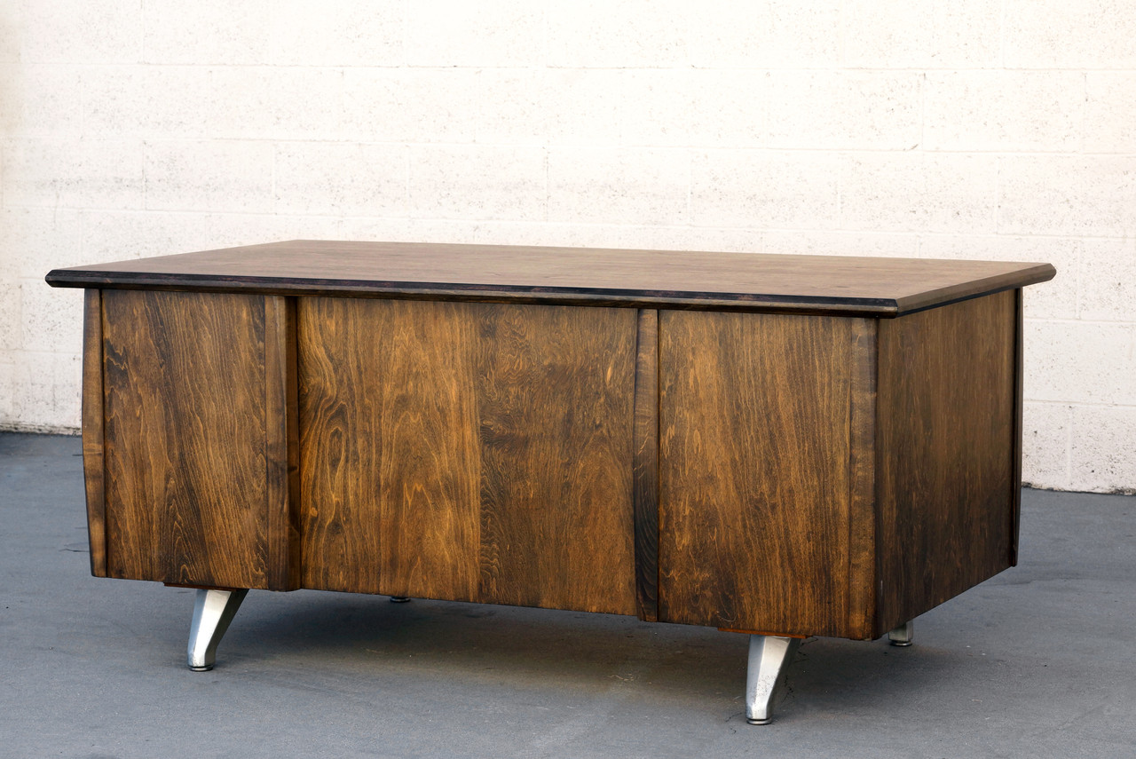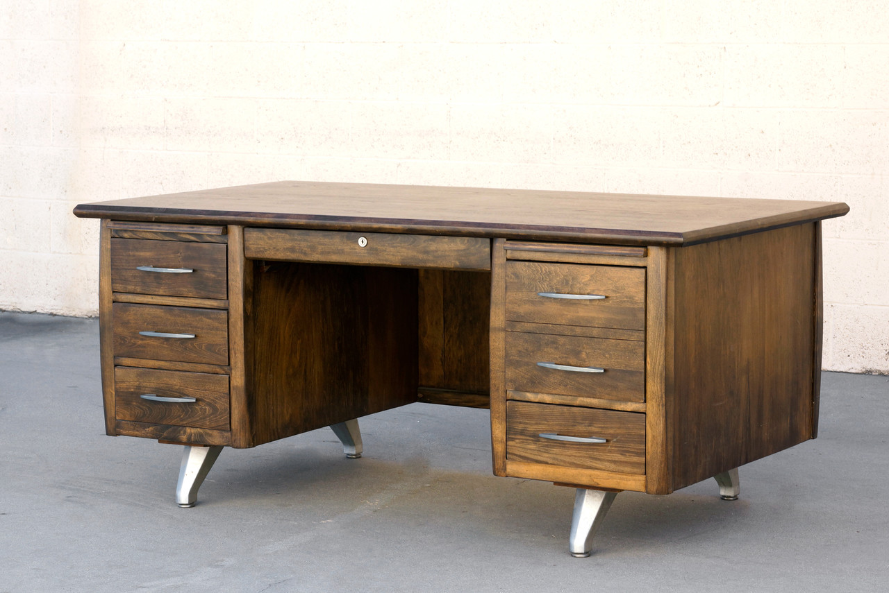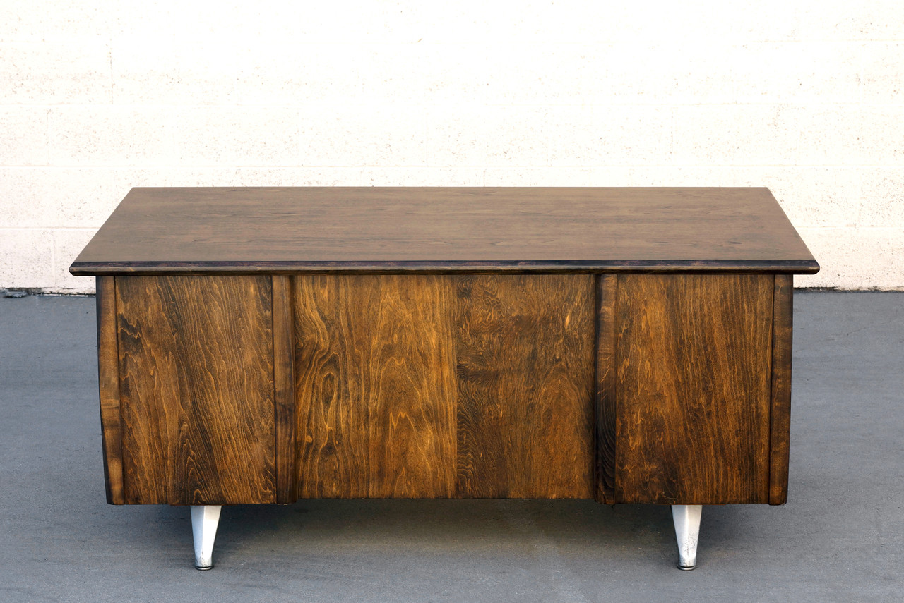 Stately 1950s executive desk of ebonized walnut. With polished brass handles and aluminum legs. Stamp indicates the desk was originally produced in California, however the desk's manufacturer is unknown.