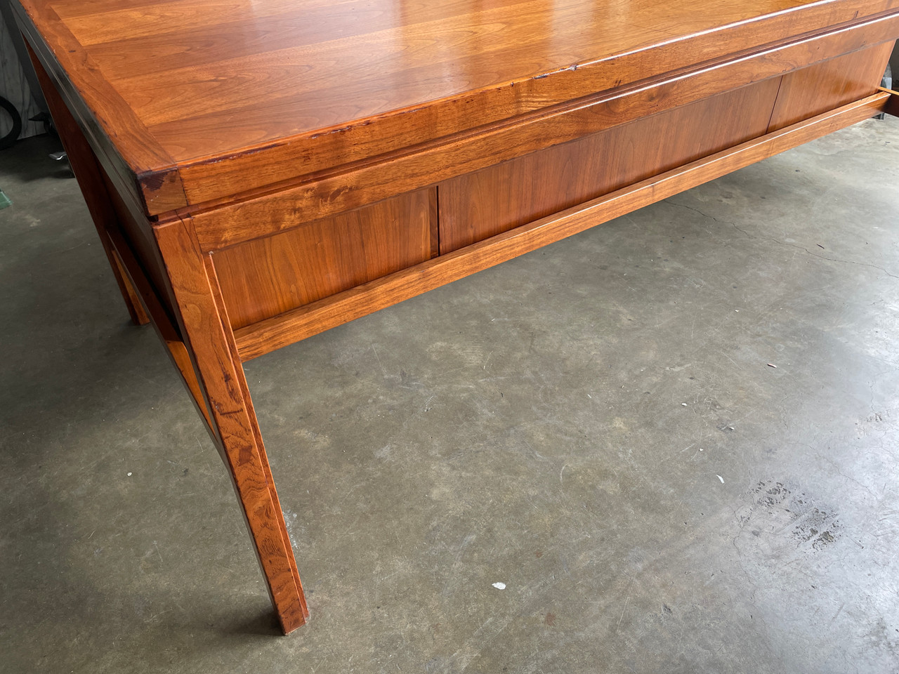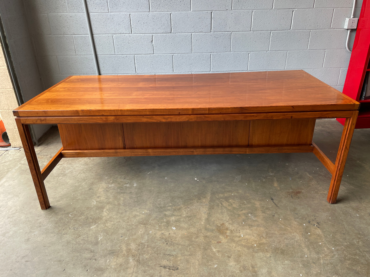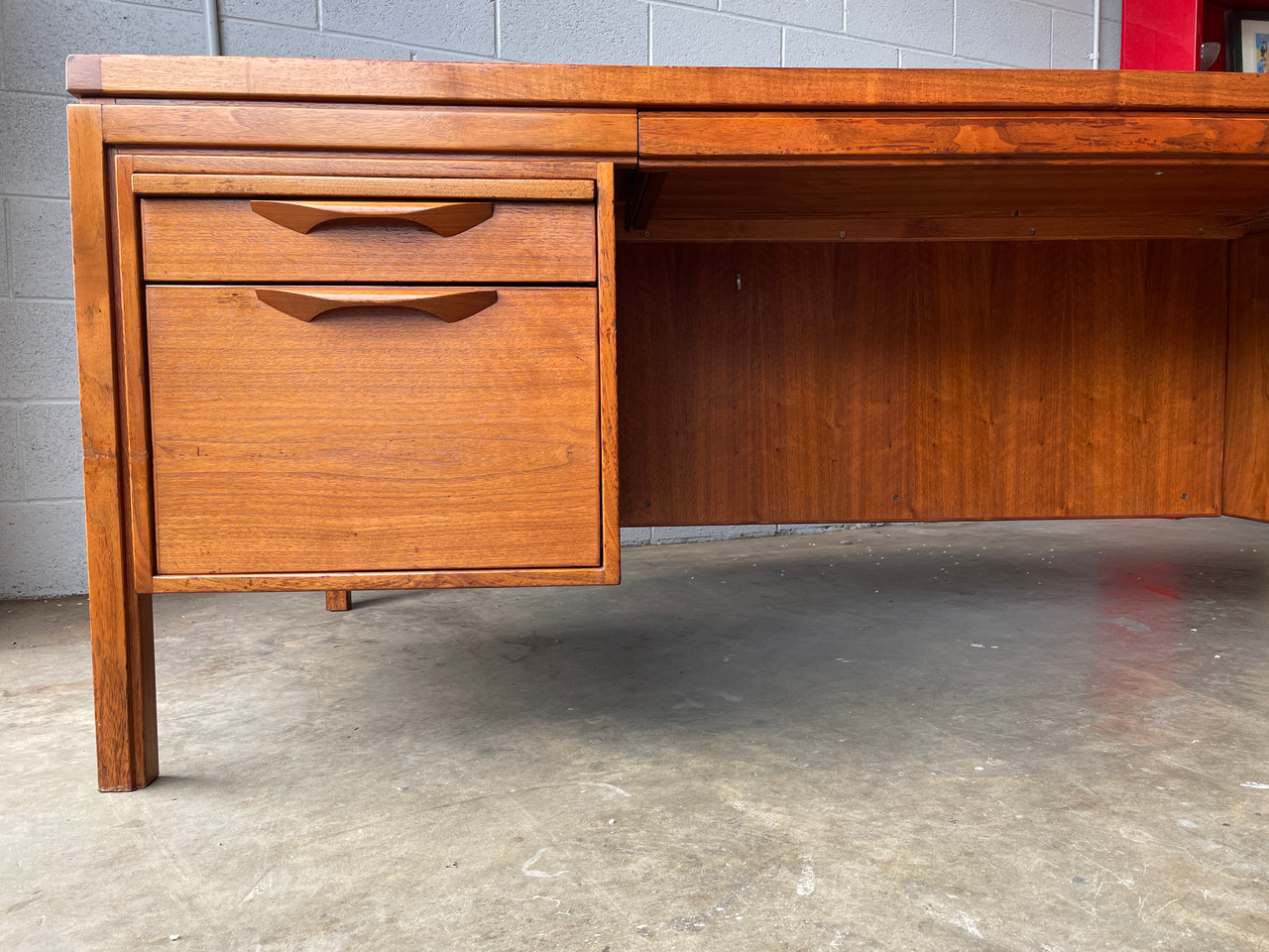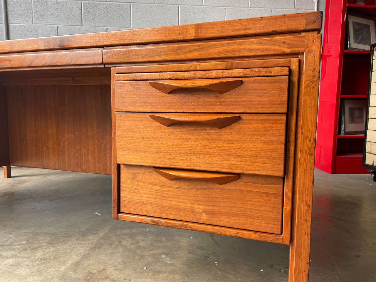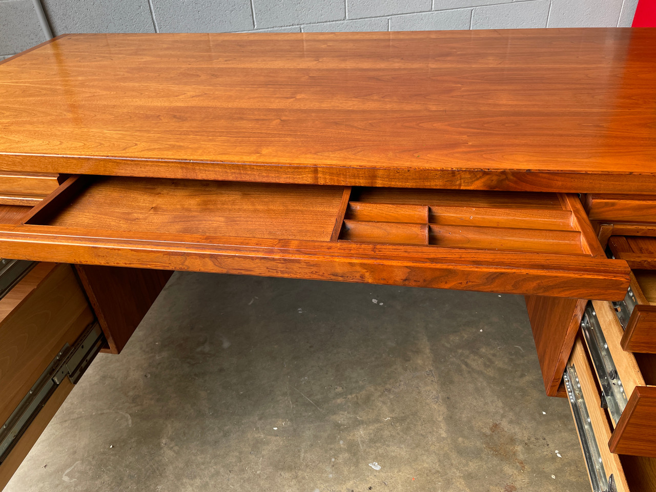 Beautiful double-pedestal mid-century walnut executive desk by Jens Risom. Four utility drawers and one file drawer. Large middle drawer with pencil tray. Featured reconditioned walnut wood.