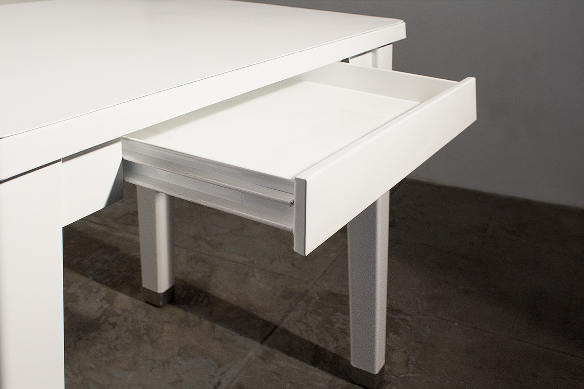 General fireproofing four-leg tanker table. Refinished in gloss white power coat finish. Single center drawer. Brushed steel leg caps. Great example of American made industrial workhorse. The perfect size for laptop workstation in the home or office. 1930s