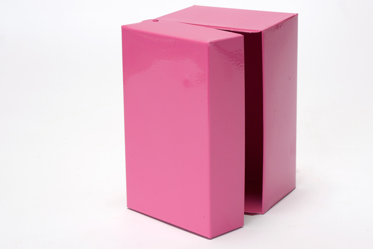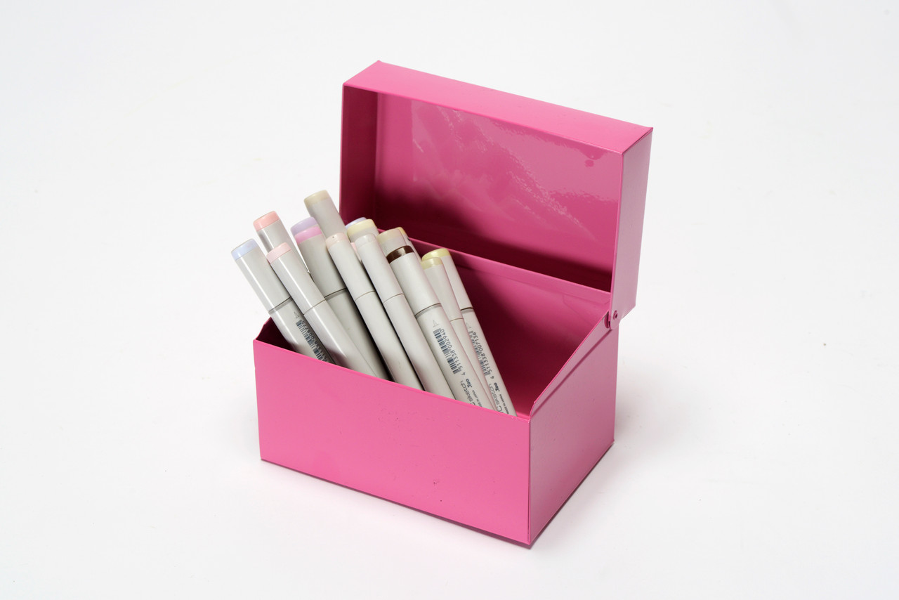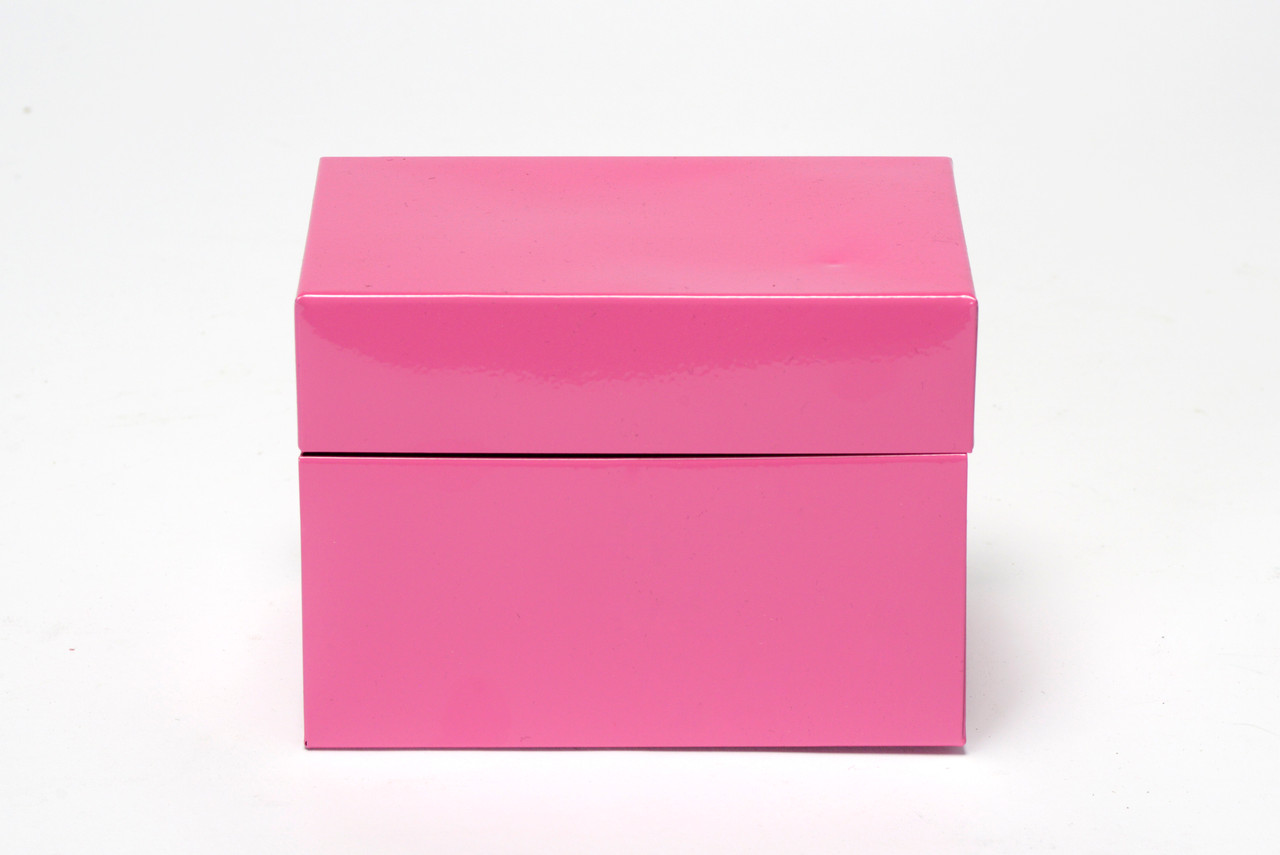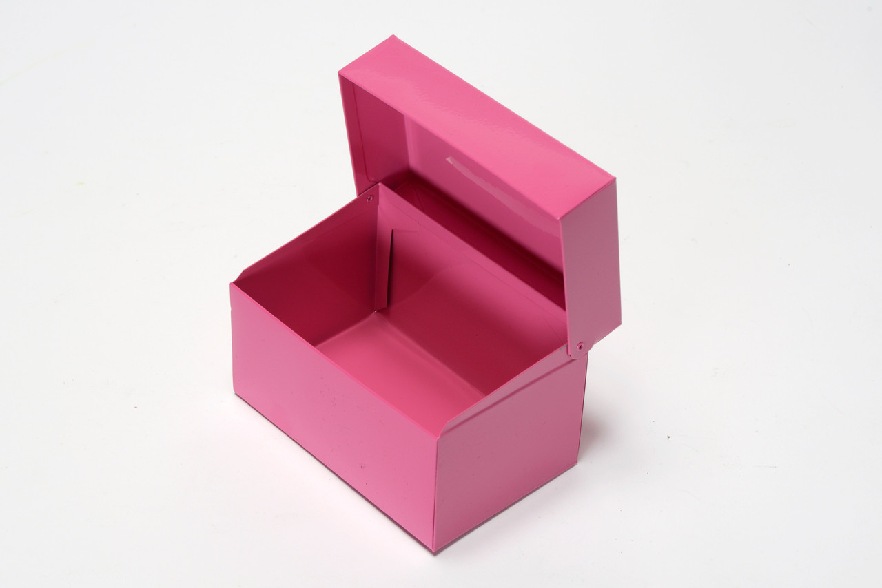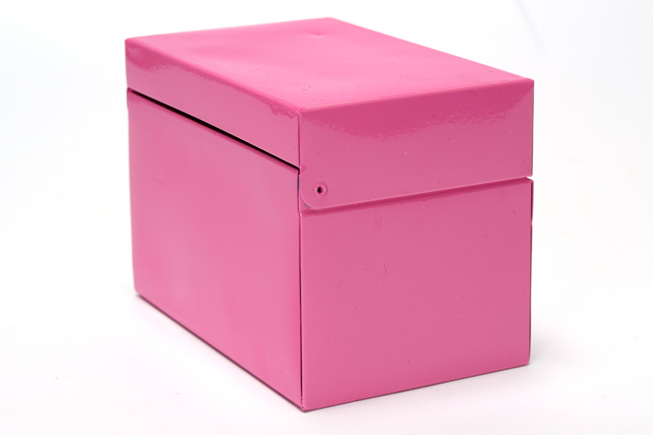 1960s steel recipe card box refinished in pink. Fresh powder coat on vintage steel. Ideal for storing all your recipe cards, office supplies and doo-dads.