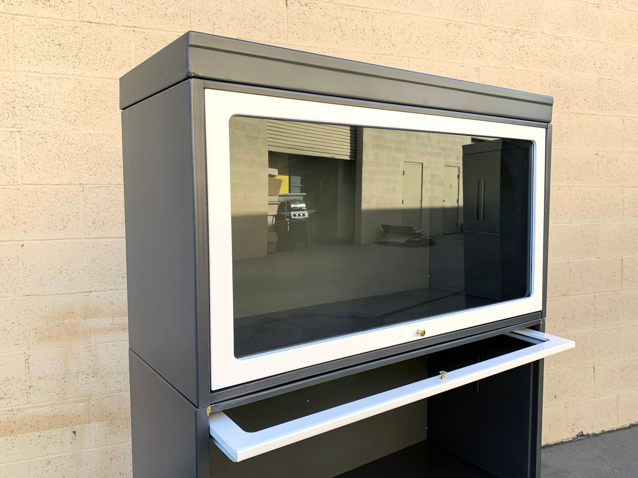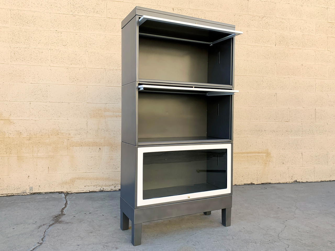 Three stack vintage lawyer bookcase refinished in a two-tone natural steel and gloss white powder coat. Glass doors lift and slide into each box for easy access to books or collectibles. A classic piece for the home or office.