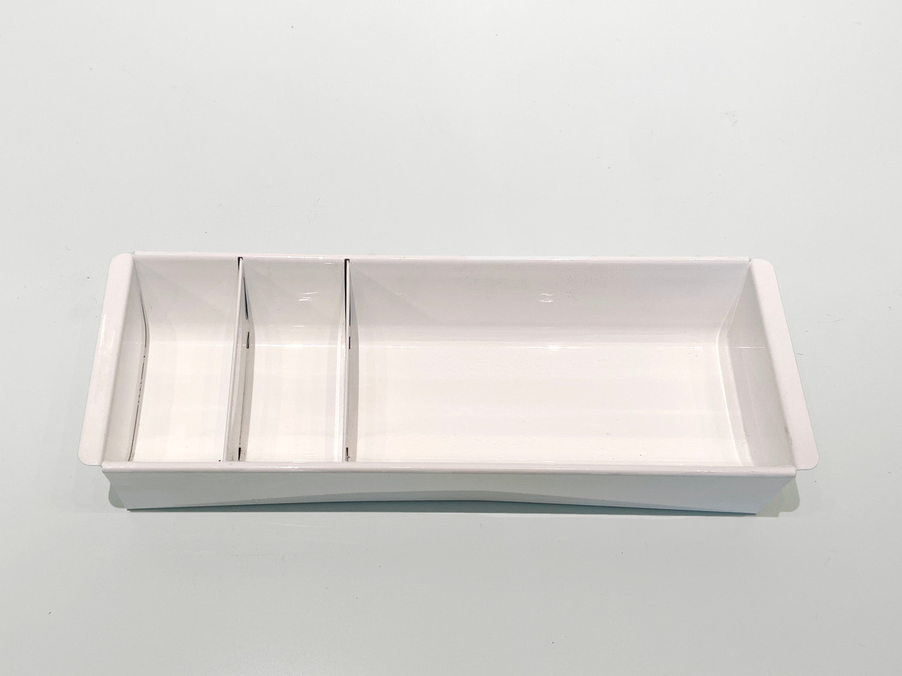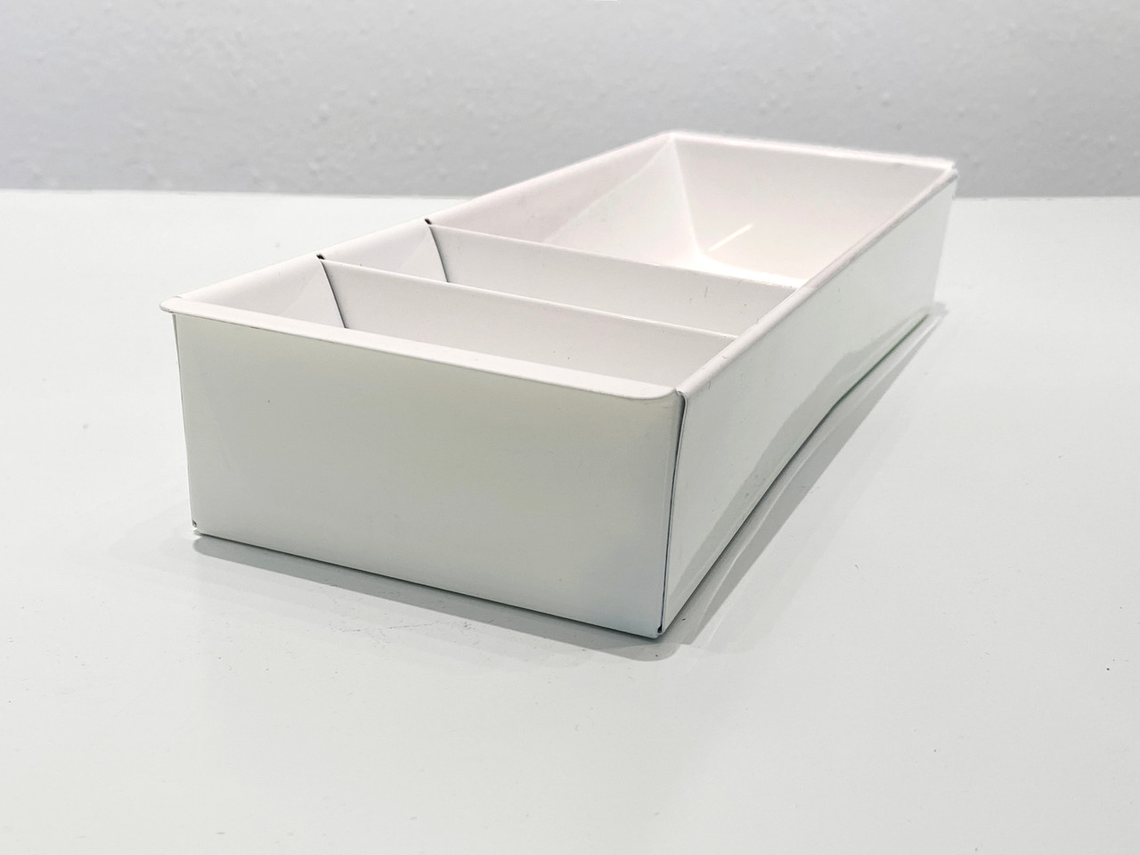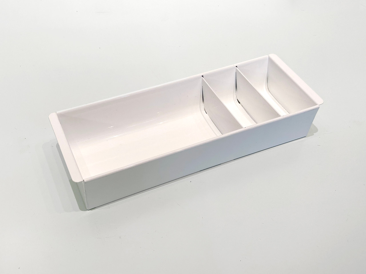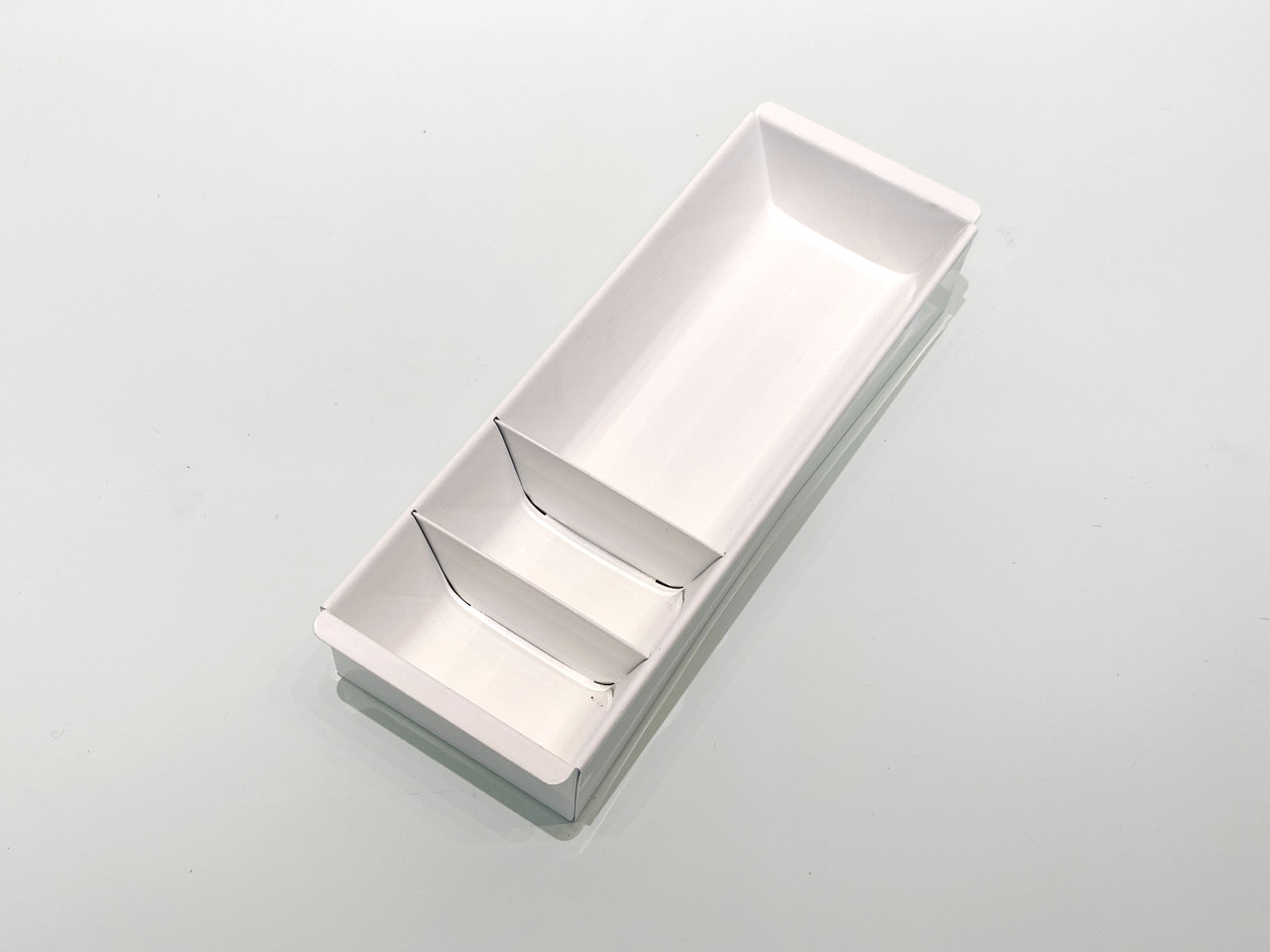 Once the insert to a mid century tanker desk's utility drawer, we repurposed this neat industrial piece for use as a desktop organizer. Steel has been newly powder-coated in gloss. Features three slots, ideal for storing coins, pens and pencils and other small office or workshop supplies. Works great as a valet for your keys and wallet or vanity tray for makeup and jewelry.