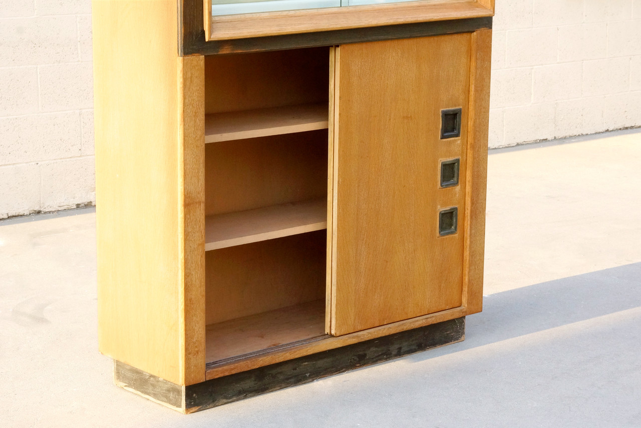 A most unique modernist display cabinet, unattributed but in the style of Paul Laszlo, c. 1940s. Composed of solid oak with sliding glass doors, adjustable glass shelves and mirror back on the top and sliding wood doors with wonderful inverted square handles on the bottom. Top portion of the cabinet is wired for a light.
