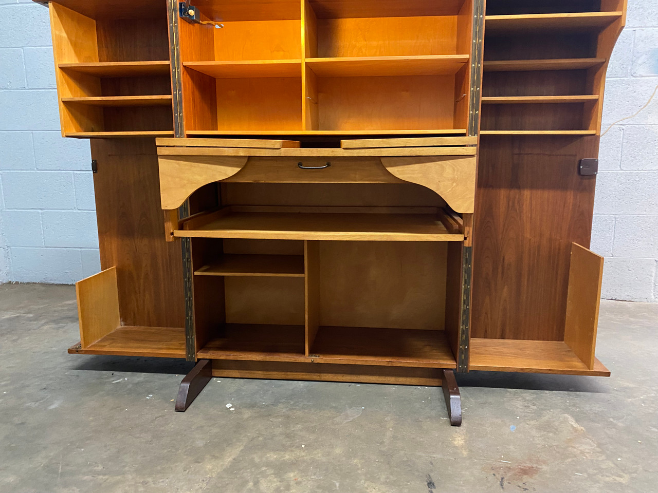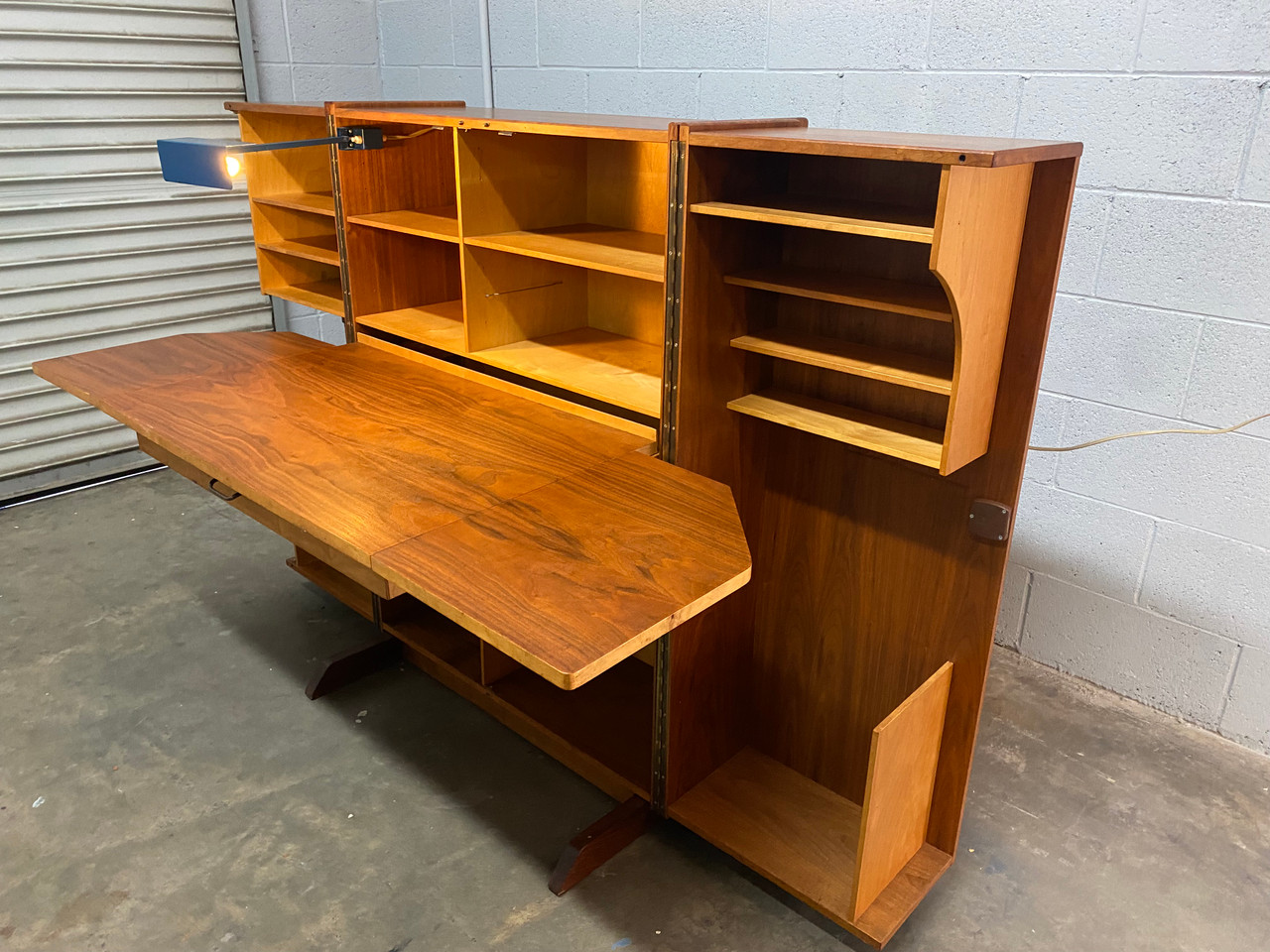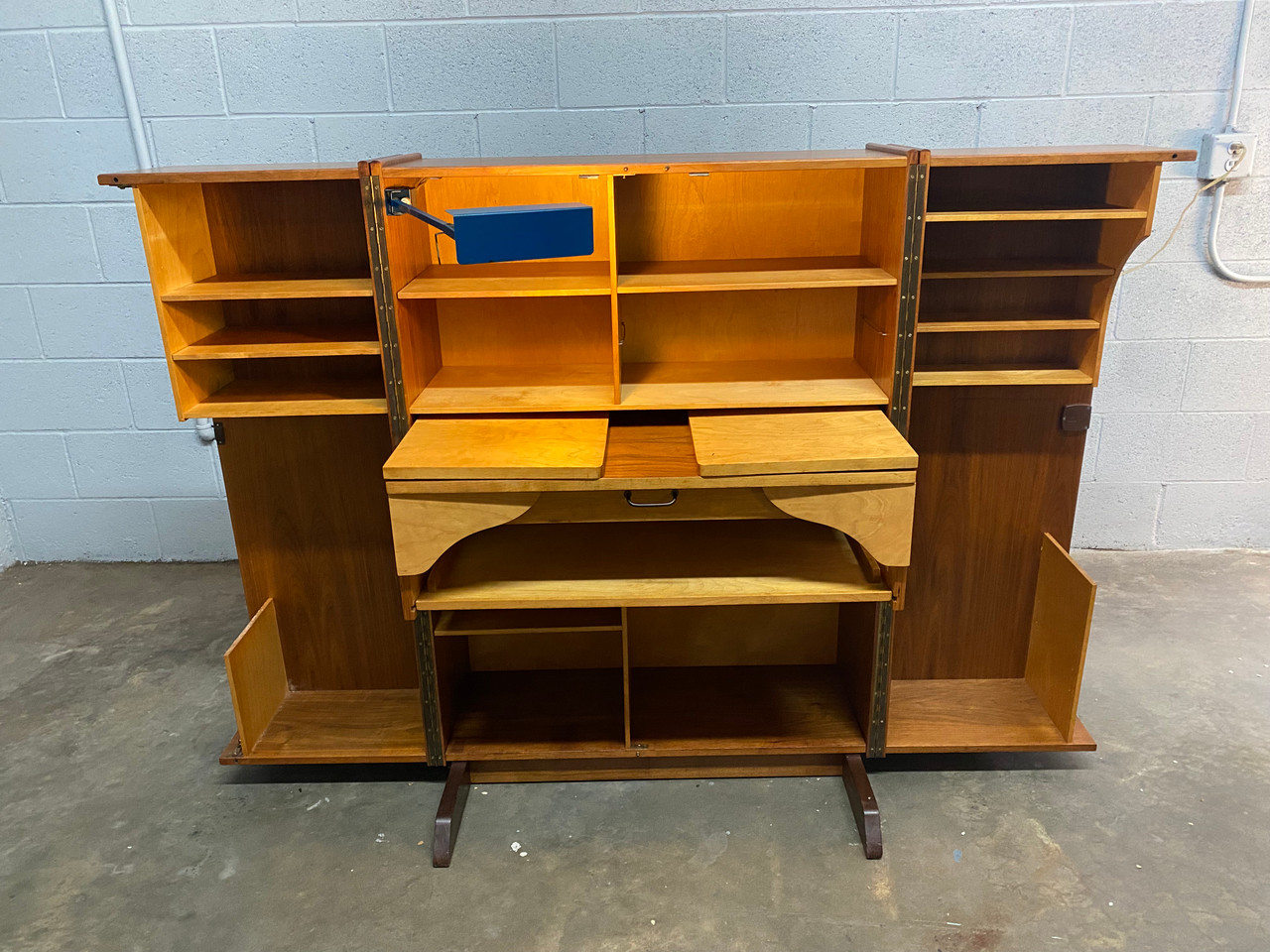 What a gem! Designed by Mummenthaler & Meier in Switzerland c. 1955, this collapsable cabinet can be transformed into a complete work station in a breeze. Features a built-in drafting lamp, drawers, shelves and ample storage space. Modular flexible use- Ideal as an animation desk, drafting table or work station. Refinished in dark walnut. Minimal repair work on sides and supports as pictured. Overall in good vintage condition. Please refer to photos and feel free to reach out with any questions :)