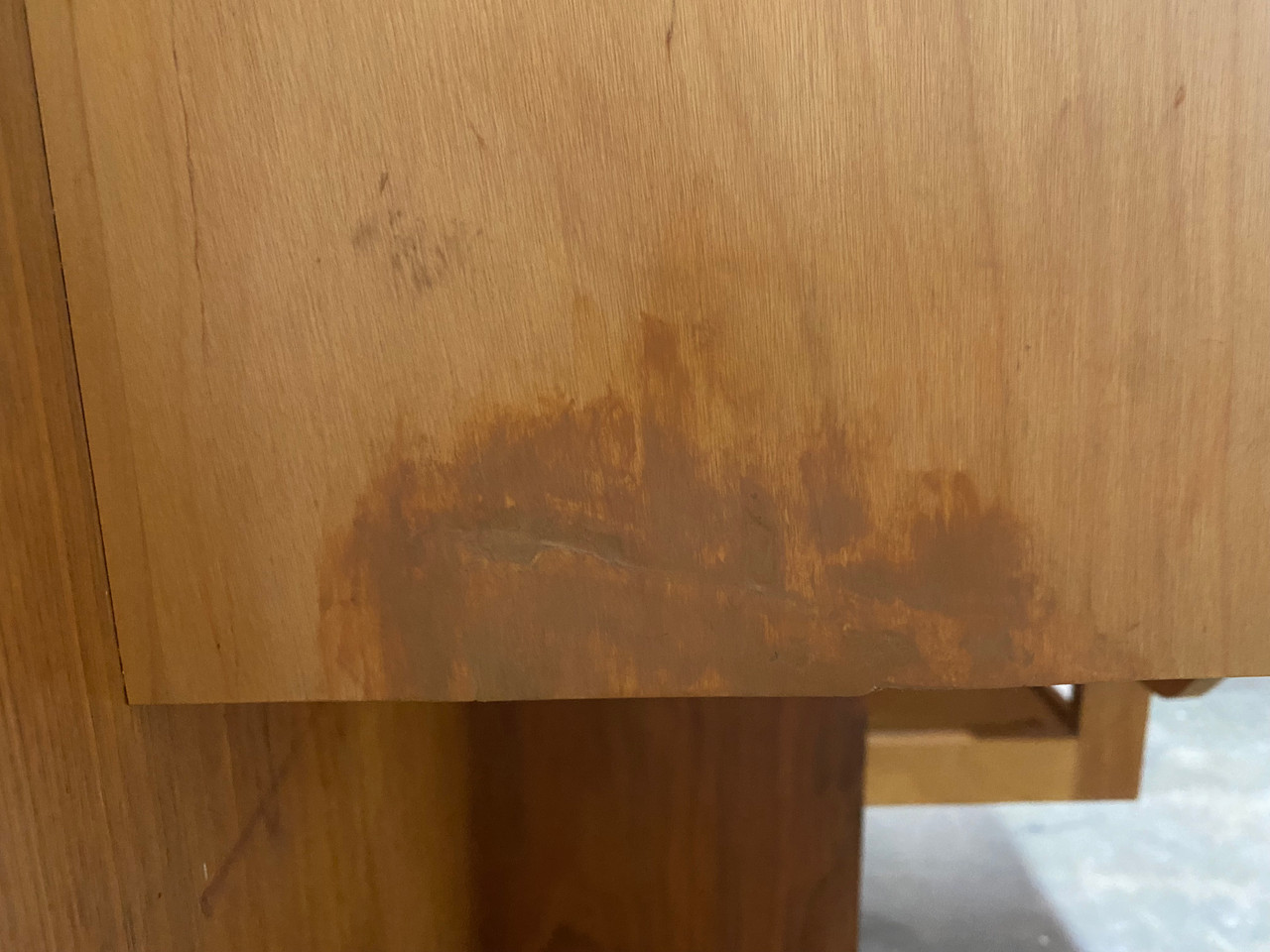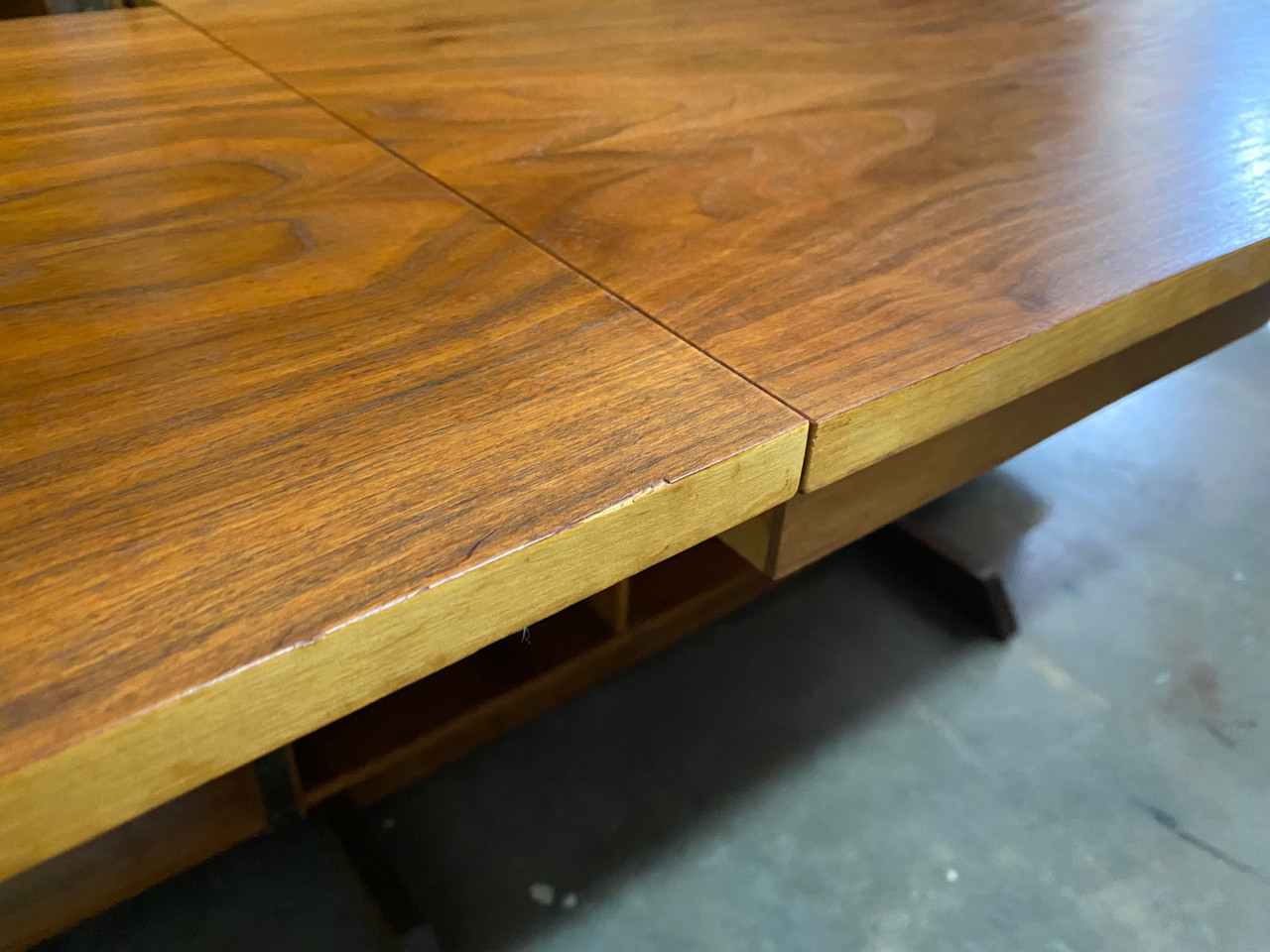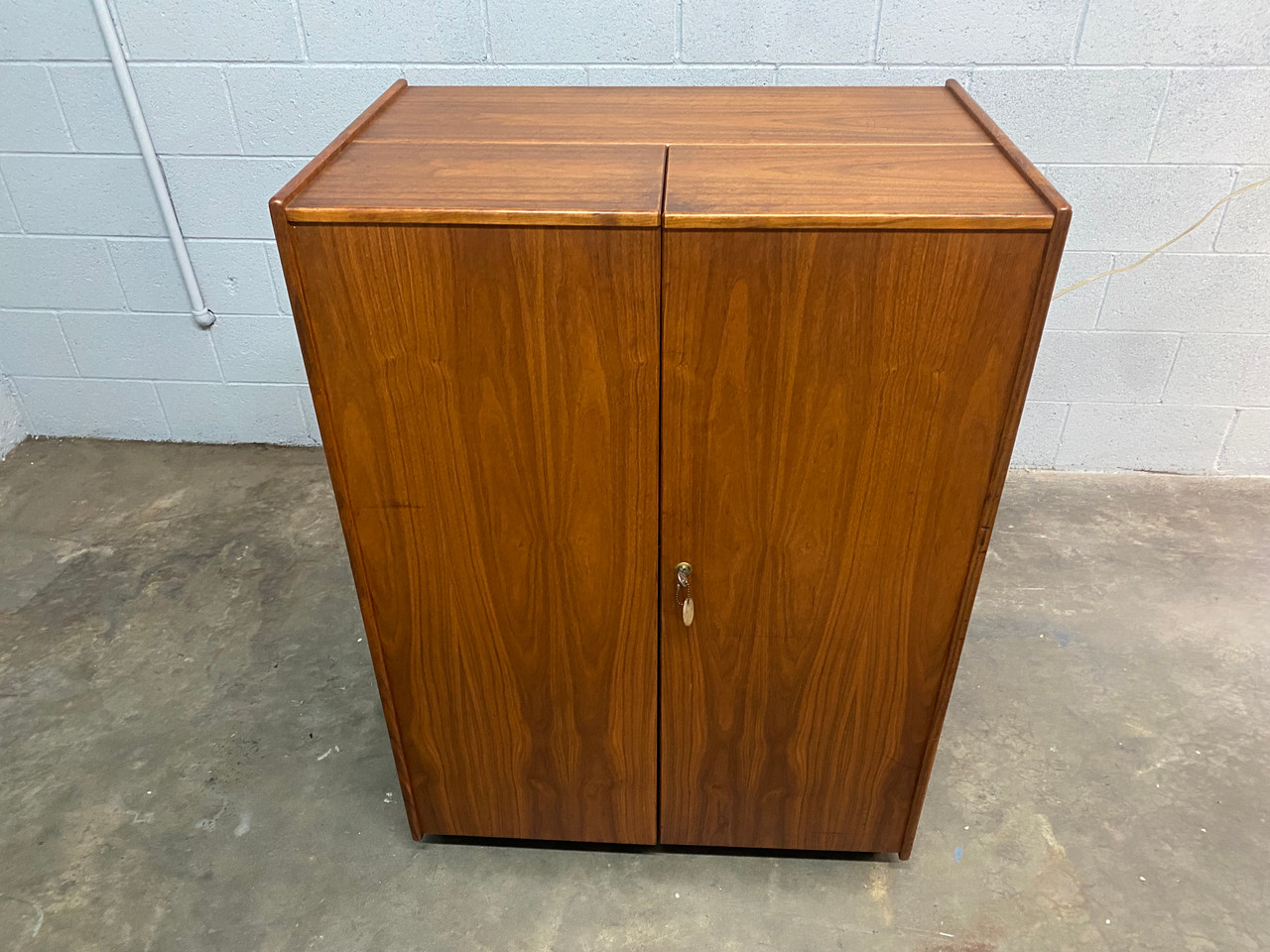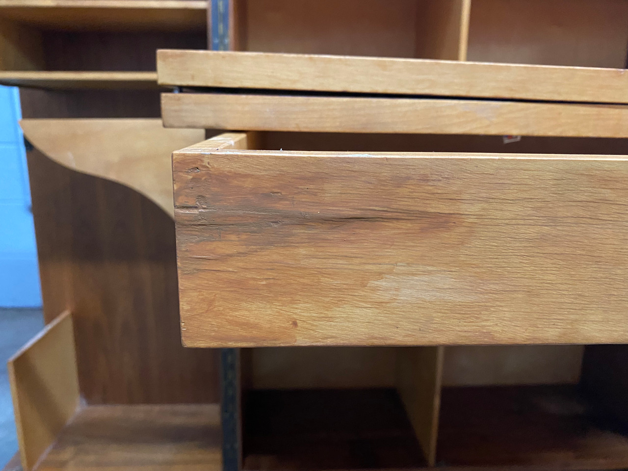 What a gem! Designed by Mummenthaler & Meier in Switzerland c. 1955, this collapsable cabinet can be transformed into a complete work station in a breeze. Features a built-in drafting lamp, drawers, shelves and ample storage space. Modular flexible use- Ideal as an animation desk, drafting table or work station. Refinished in dark walnut. Minimal repair work on sides and supports as pictured. Overall in good vintage condition. Please refer to photos and feel free to reach out with any questions :)