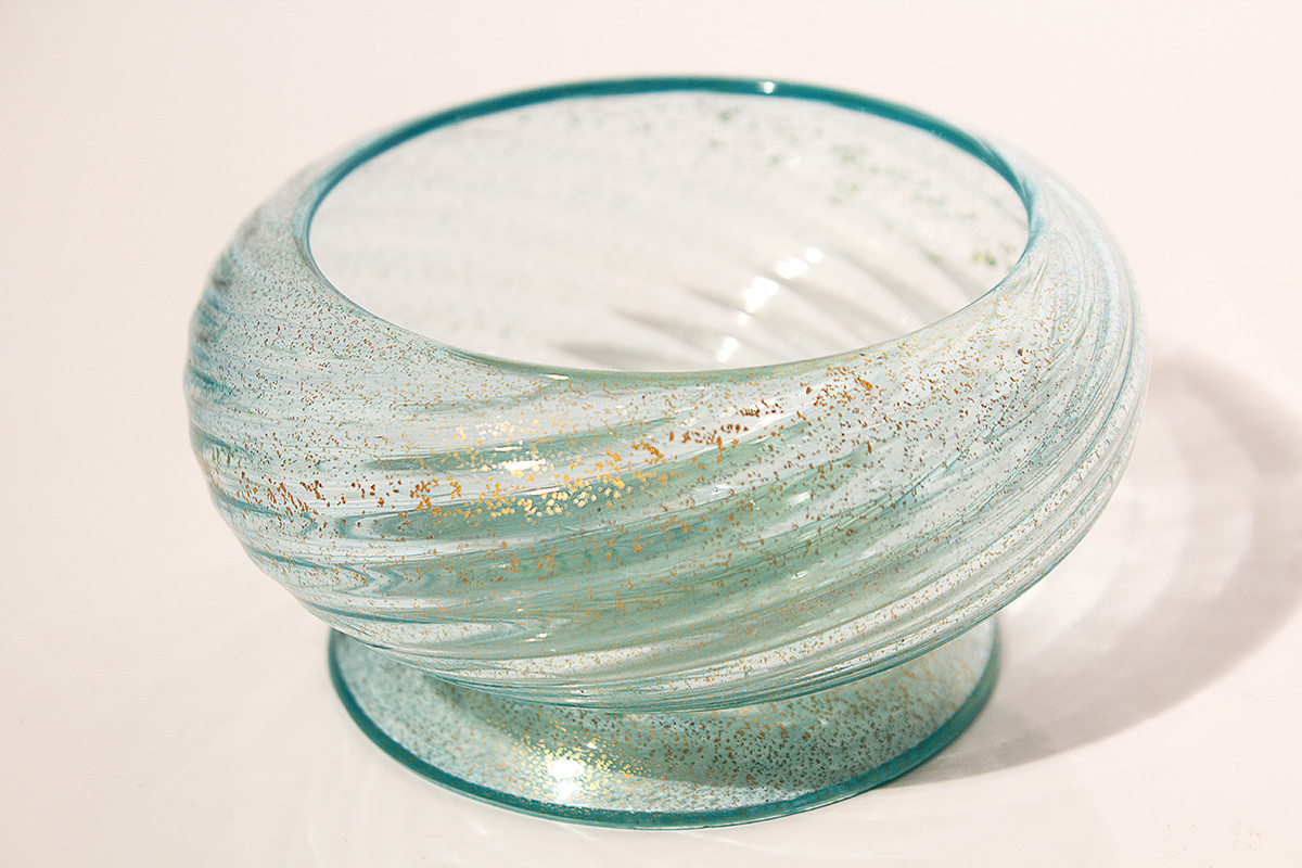 Delicately crafted Murano art glass dish with swirl relief pattern & gold flakes by Venini. Subtle greenish blue glass color. Excellent condition.