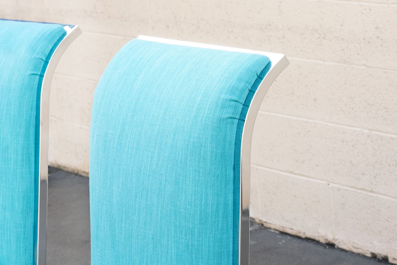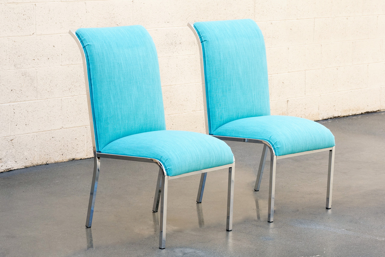 Pair of mid century modern chrome dining chairs by Milo Baughman for Design Institute of America, "DIA." Beautiful design features gently curved chrome frame and newly upholstered micro-linen fabric. Chrome is in excellent condition. C., 1960s.