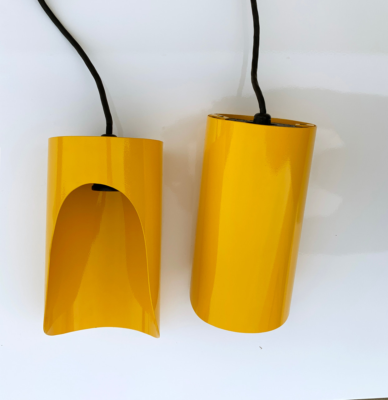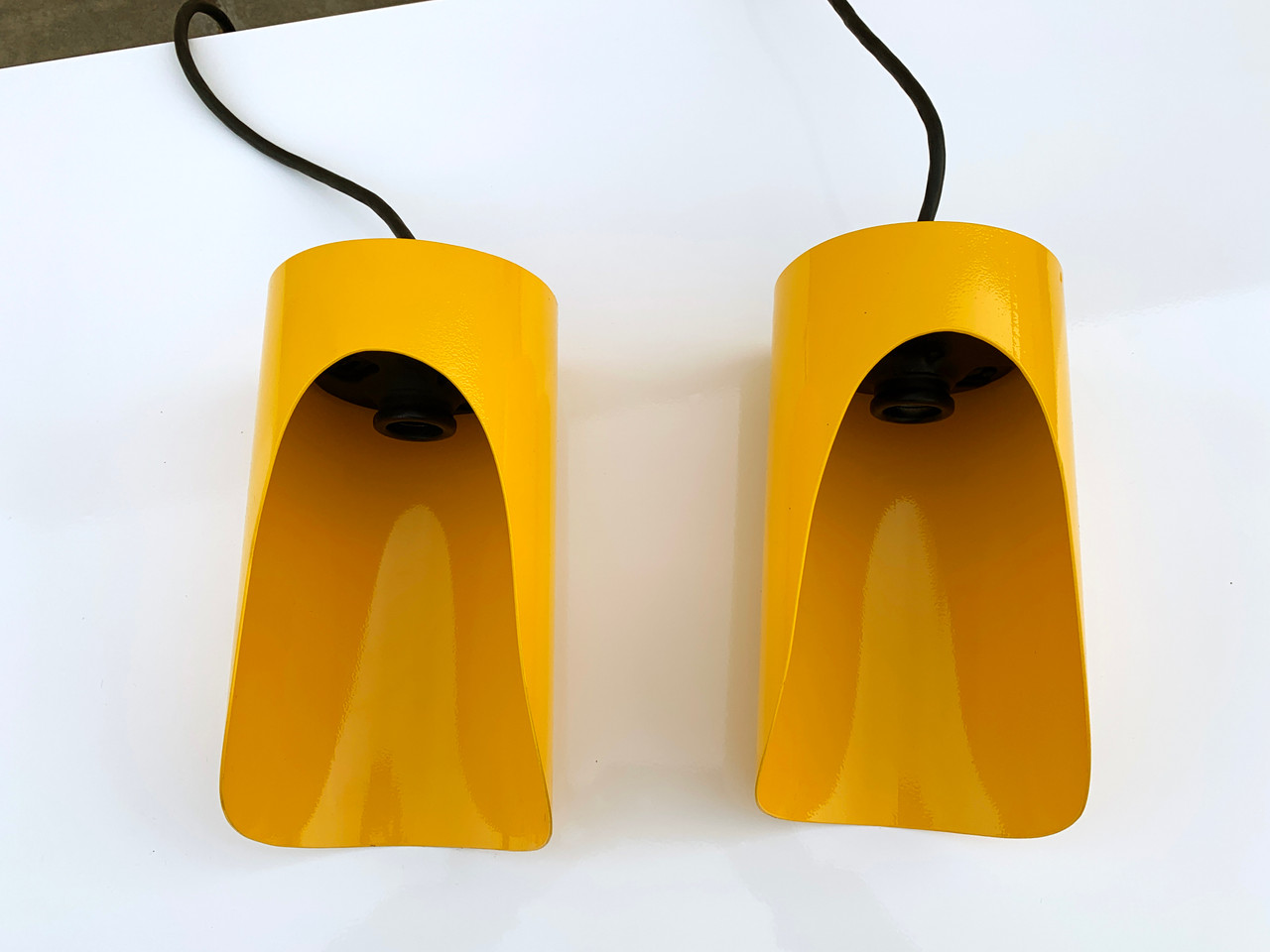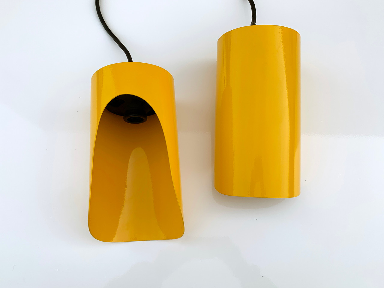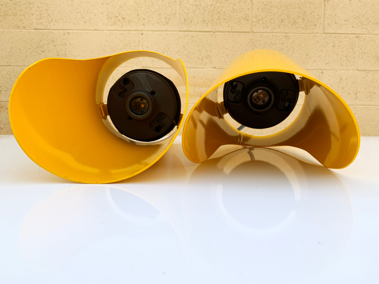 1970s vintage pendant lights refinished in a groovy shade of yellow. Powder coated metal makes them an excellent choice if you're looking to up the retro vibes in your entryway or patio.